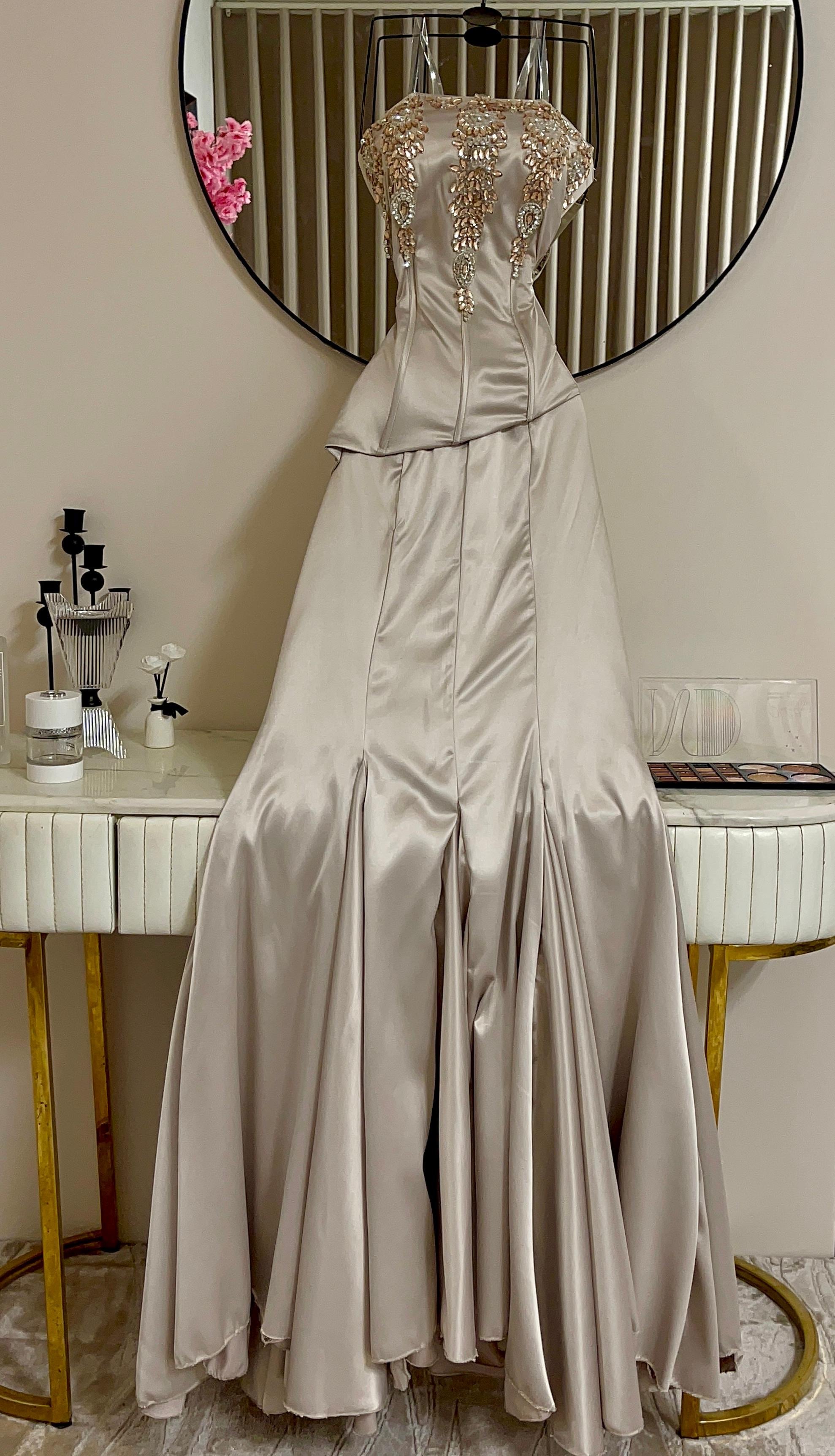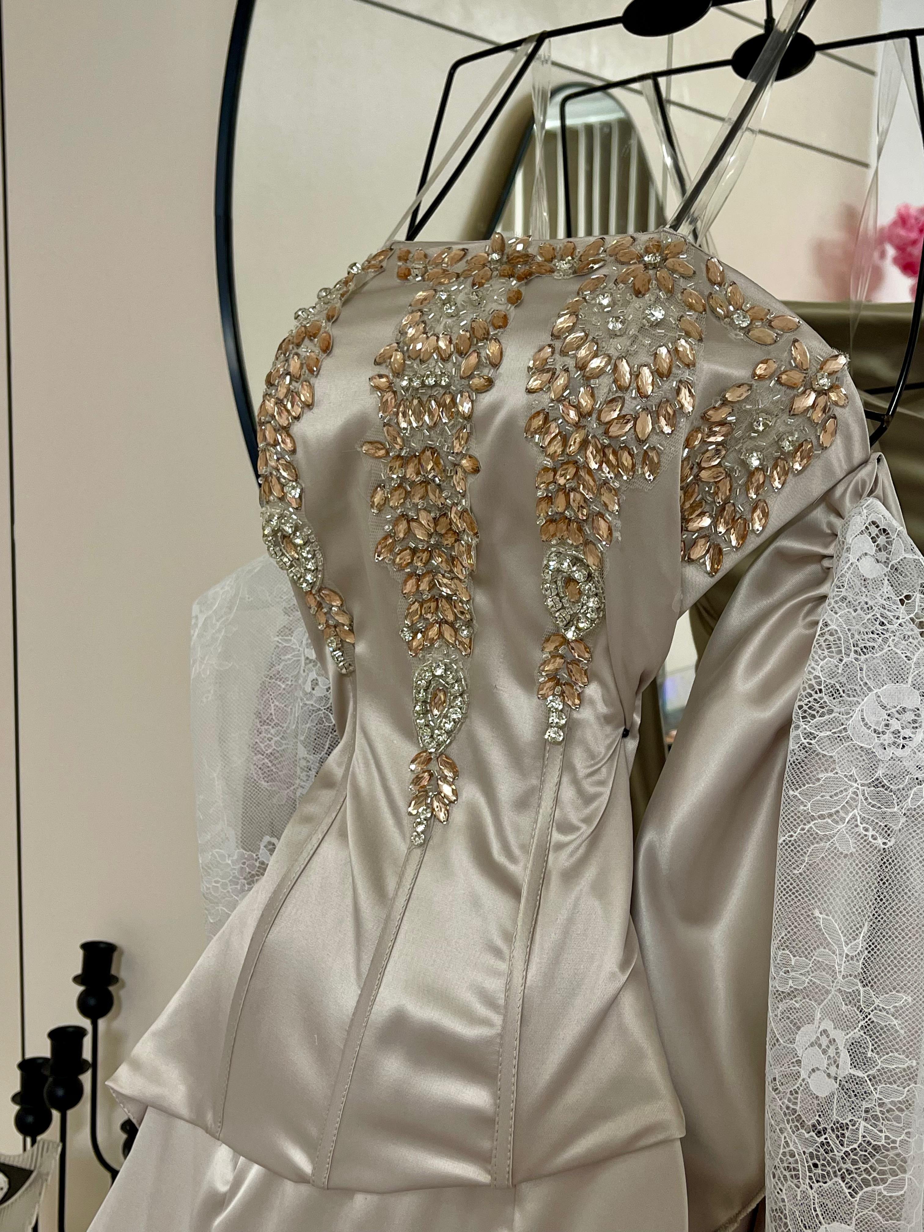 فستان سهرة بلون عاجي ملوكي، ينساب من الساتان الناعم مثل ضوء القمر على الحرير.