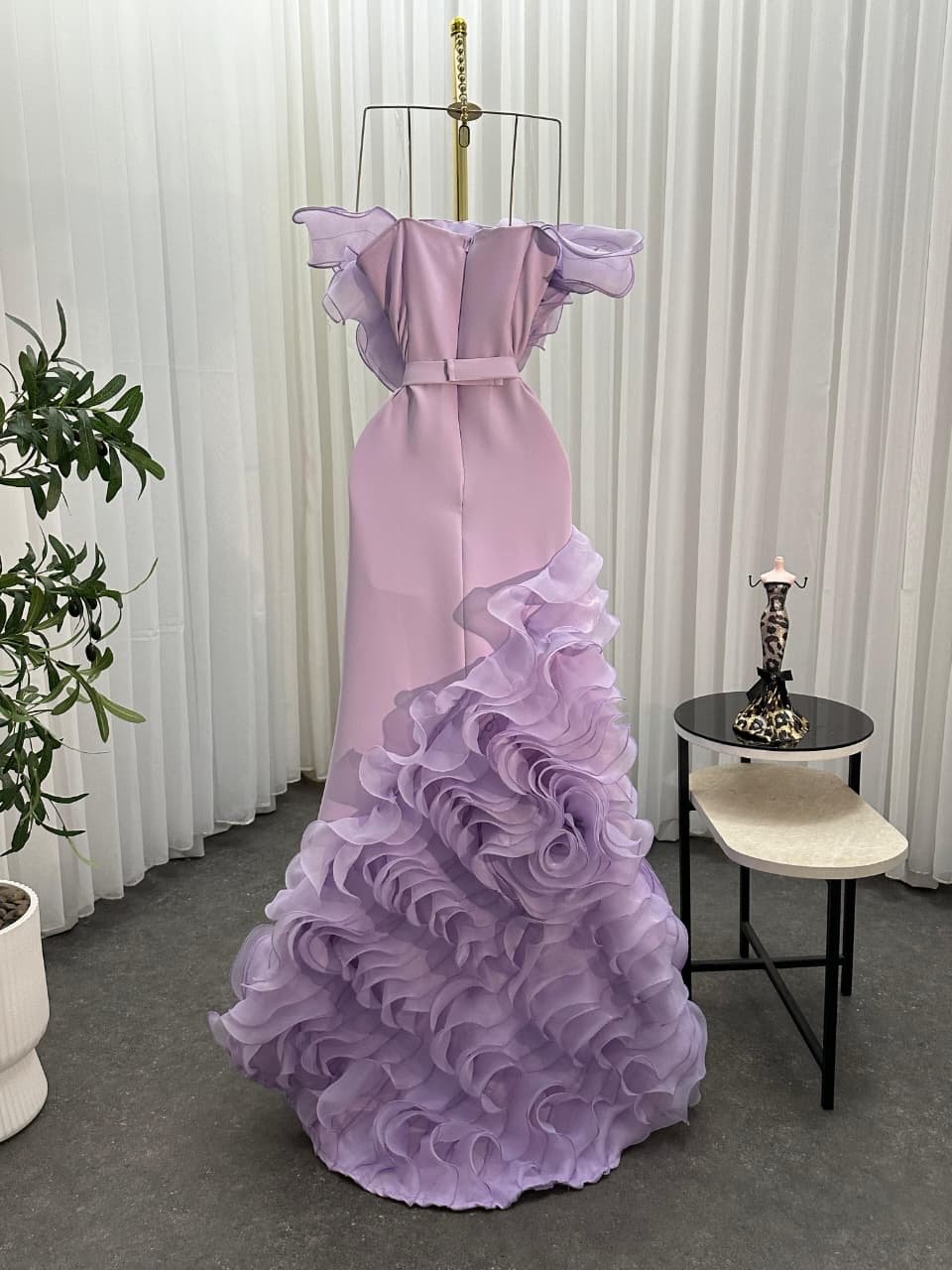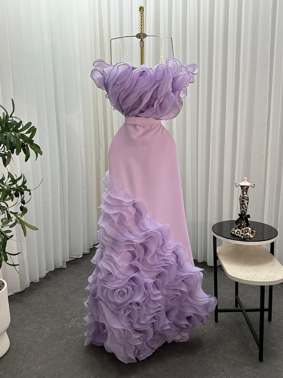 التصميم ينساب برشاقة على الجسم ليعانق القوام ويمنحك حضورًا متوازنًا بين الأناقة والأنوثة، بينما تضيف الورود البارزة على التنورة لمسة درامية فخمة تجعل إطلالتك محط الأنظار. اللون البنفسجي المائل إلى الليلكي يضفي إحساسًا بالرومانسية والفخامة، مناسب للسهرات الفاخرة وحفلات الزفاف والمناسبات المميزة.