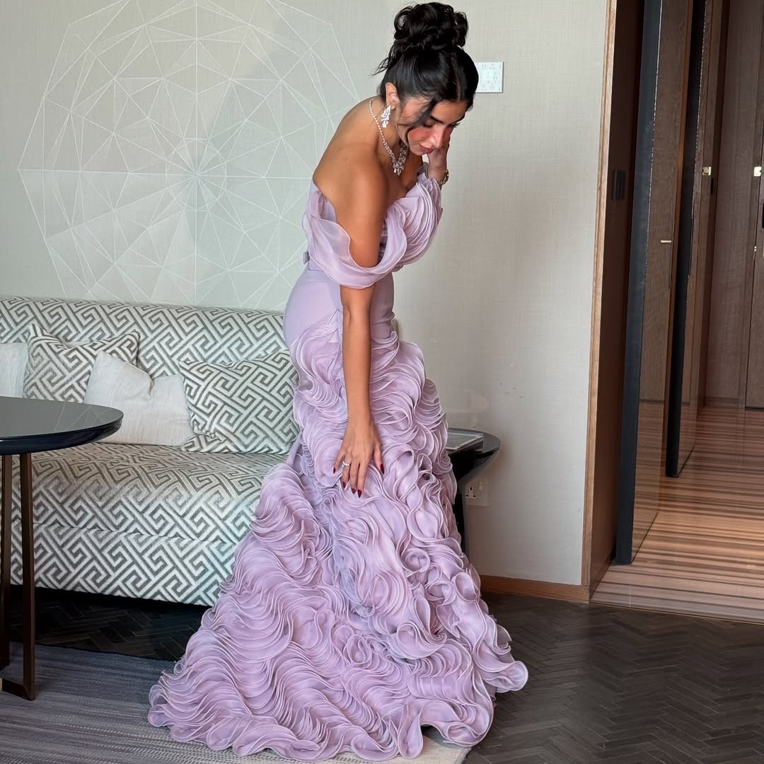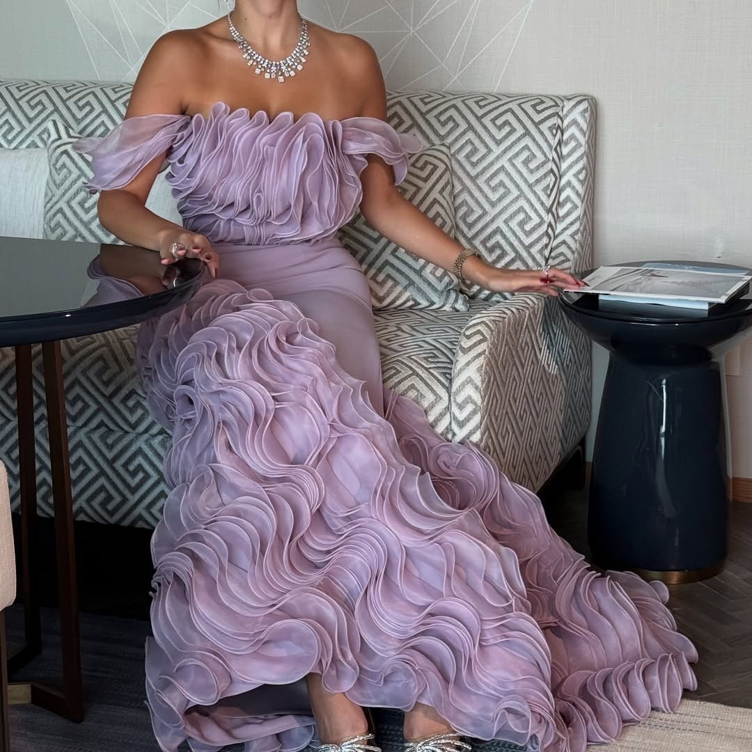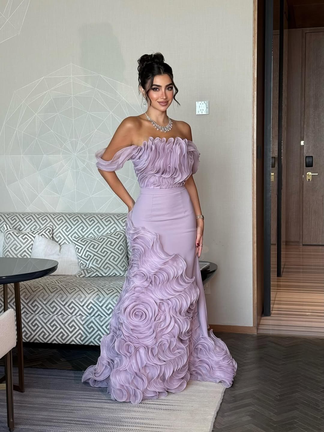 هذا الفستان البنفسجي الساحر يجمع بين الجرأة والرقي في تصميم واحد. يتميز بقصة أوف شولدر أنثوية تظهر جمال الأكتاف والرقبة، مع صدرية مزيّنة بطبقات من الورود البارزة المصنوعة من القماش لتعكس لمسة فنية راقية.