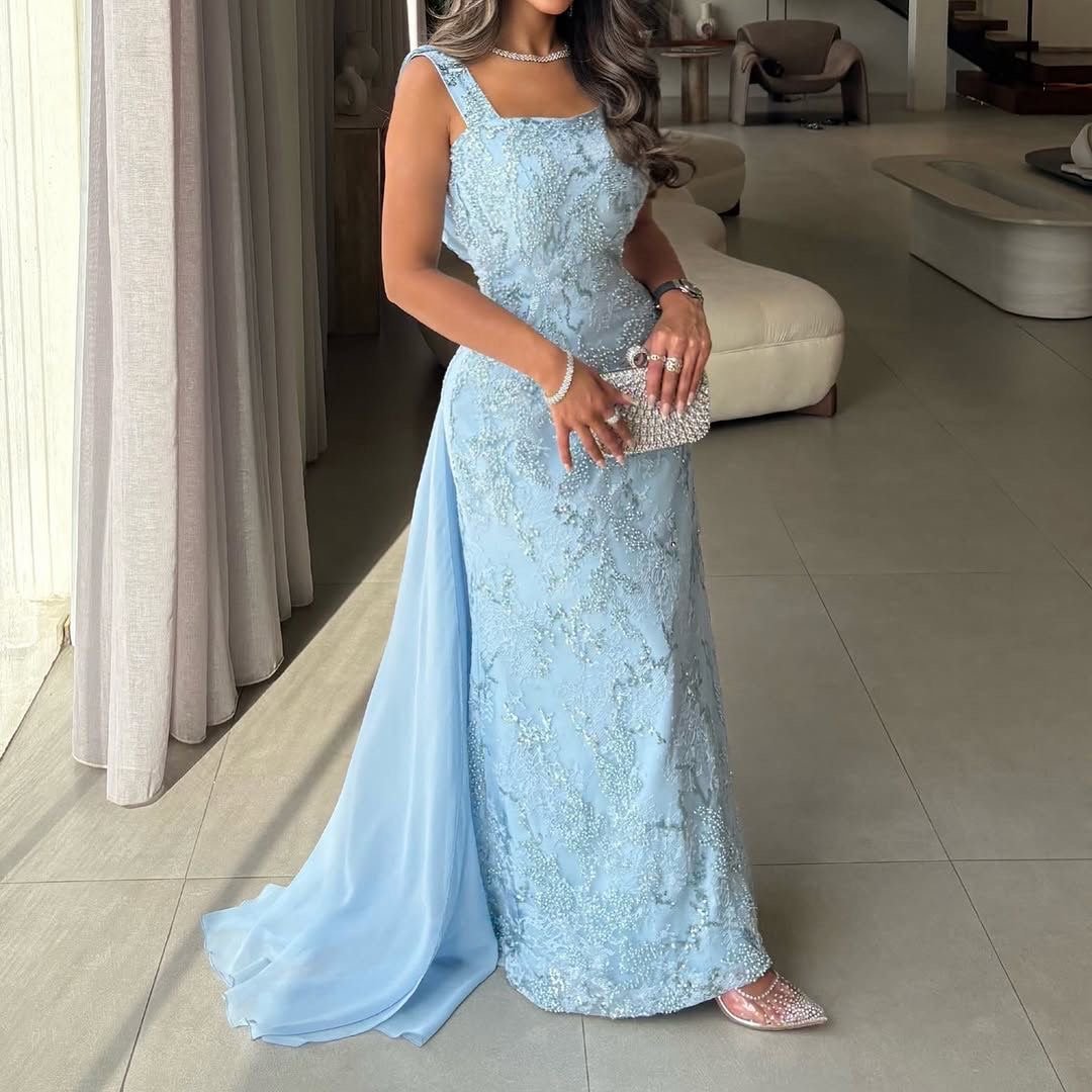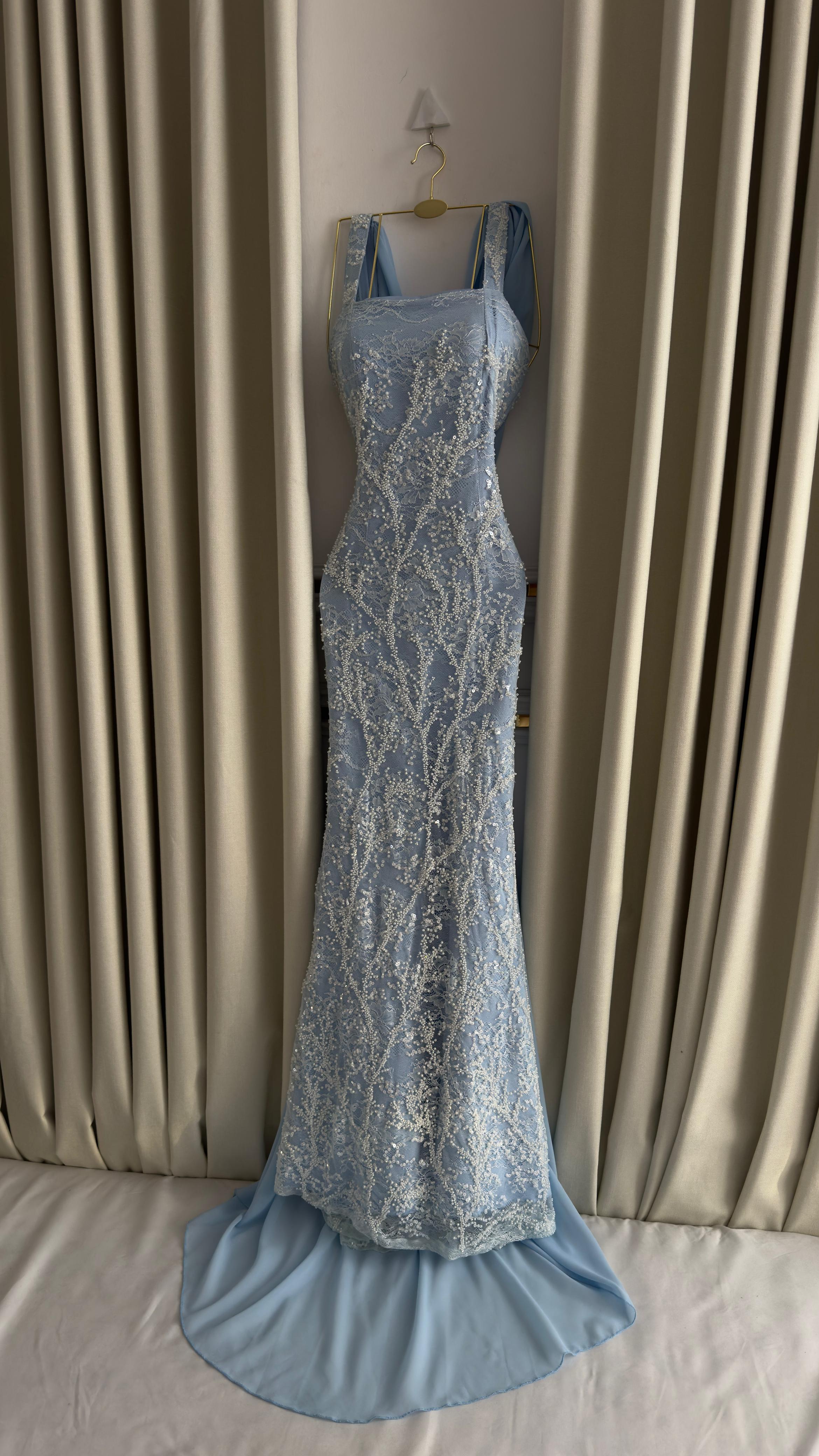 هذا الفستان السماوي الساحر يجمع بين الرقي والنعومة بتصميمه المزين بتطريزات فاخرة تلمع كحبات الندى تحت ضوء القمر. انسدال القماش الخلفي يضيف لمسة ملكية راقية تجعلك محط الأنظار في أي مناسبة.