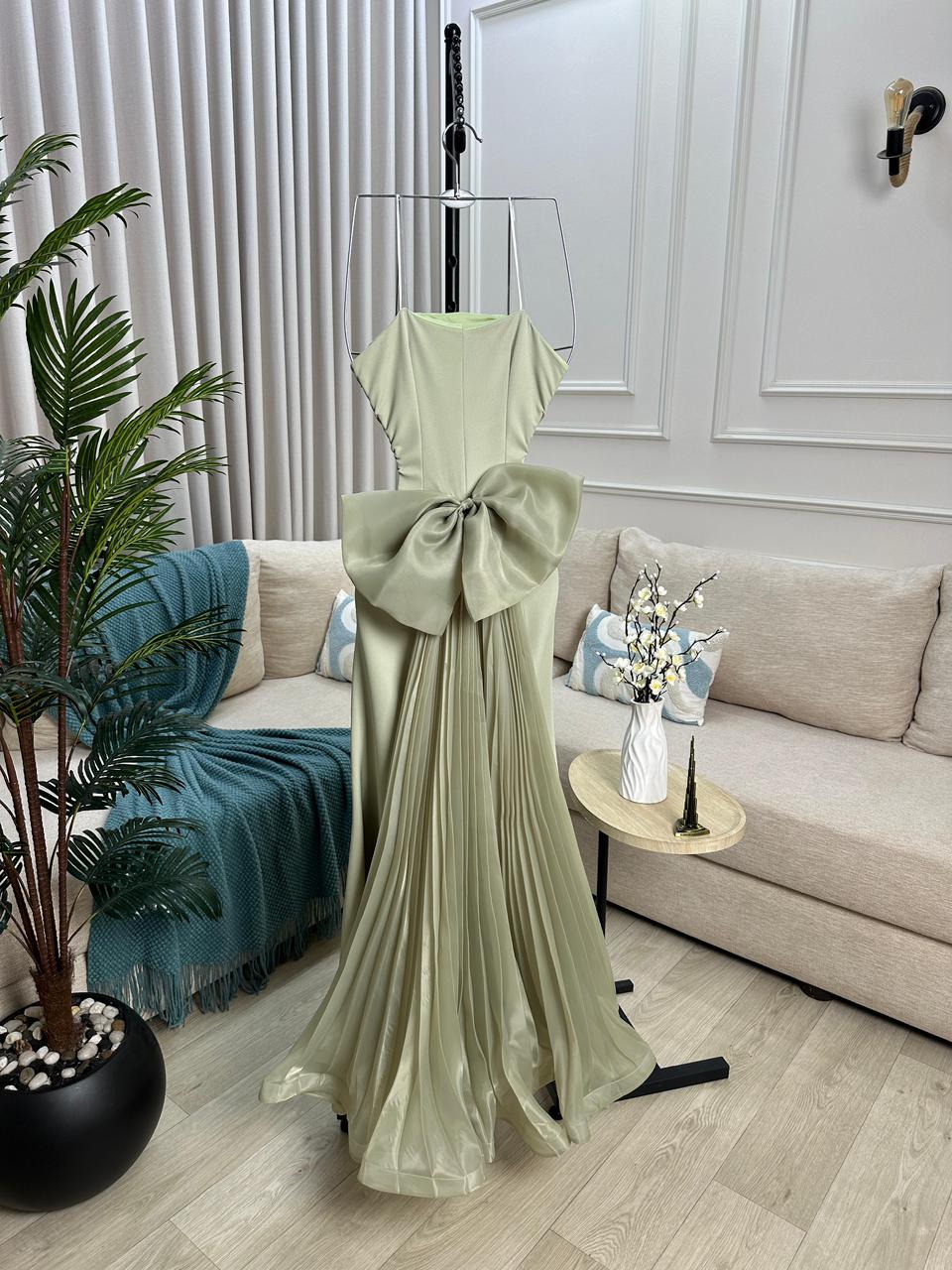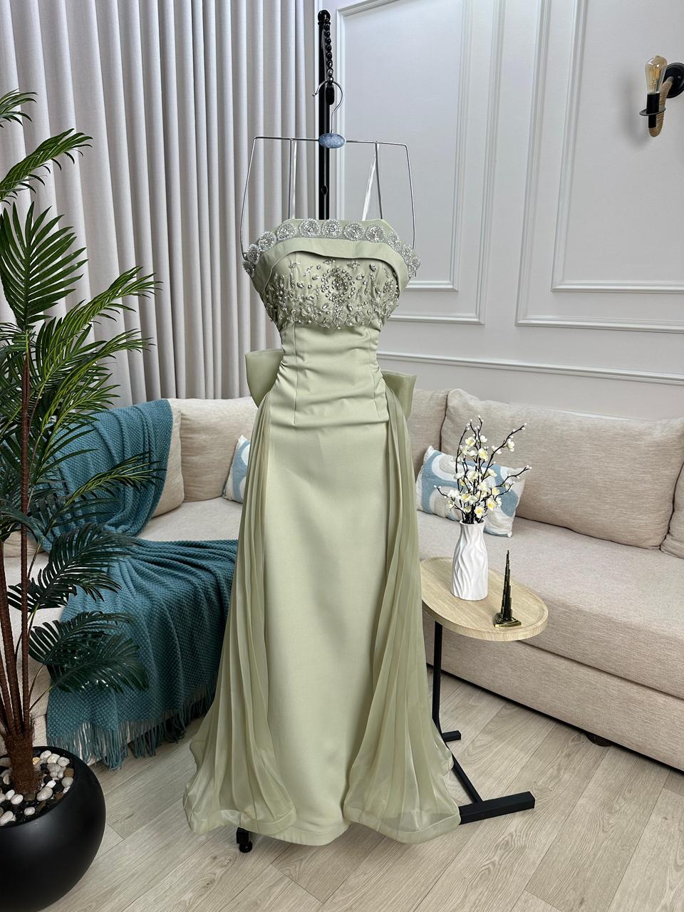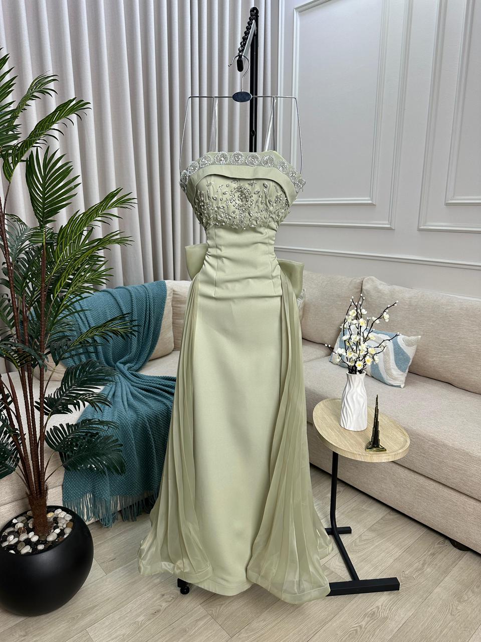 فستان فاخر باللون الأخضر الفاتح المميز، مصنوع بتصميم أنثوي راقٍ يعكس الأناقة والفخامة. يزدان الجزء العلوي بتطريز أنيق من الكريستال والخرز اللامع الذي يضفي لمسة براقة ناعمة، مع تصميم ضيق يحدد الخصر ويبرز جمال القوام. أما اللمسات الجانبية المنسدلة فتمنح الفستان انسيابية ساحرة وحضورًا ملكيًا. خيار مثالي للسهرات، حفلات الخطوبة والزفاف، وكل مناسبة تستحق إطلالة فريدة تلفت الأنظار.