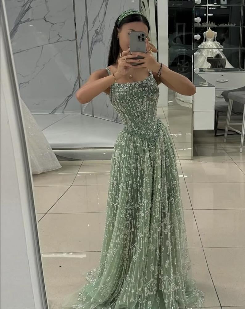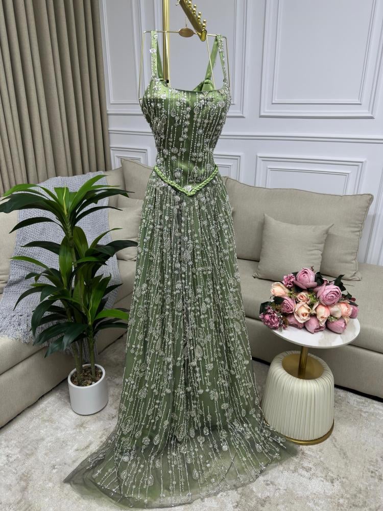تألقي بإطلالة راقية مع هذا الفستان الأخضر الفاتح المستوحى من الطبيعة، بتصميم ناعم على شكل كورسيه مع تطريزات زهرية دقيقة وكريستالات متلألئة تزيد من فخامته. القَصّة الانسيابية تمنحك حضورًا ملكيًا أنثويًا، يجمع بين البساطة والأناقة في آن واحد.
