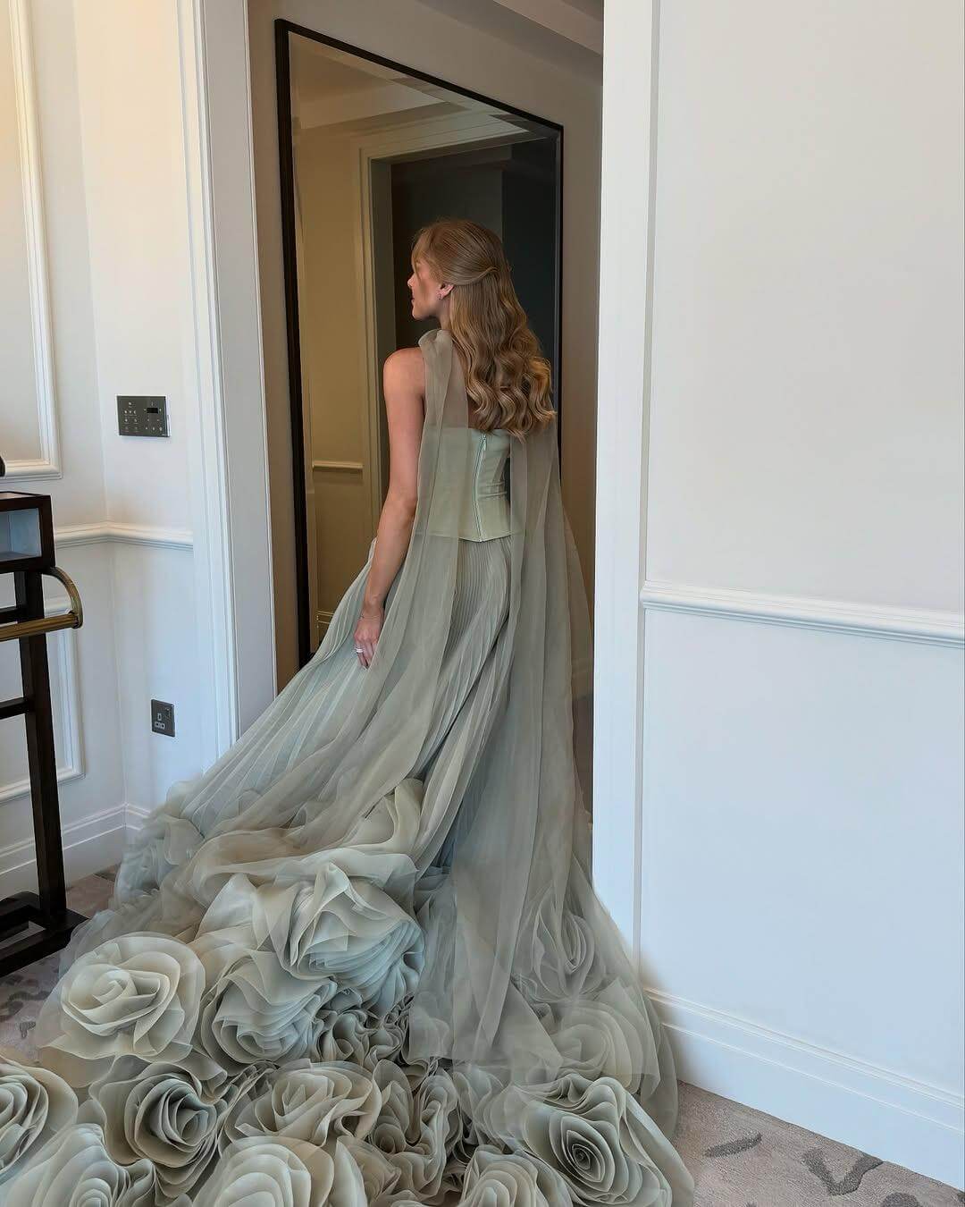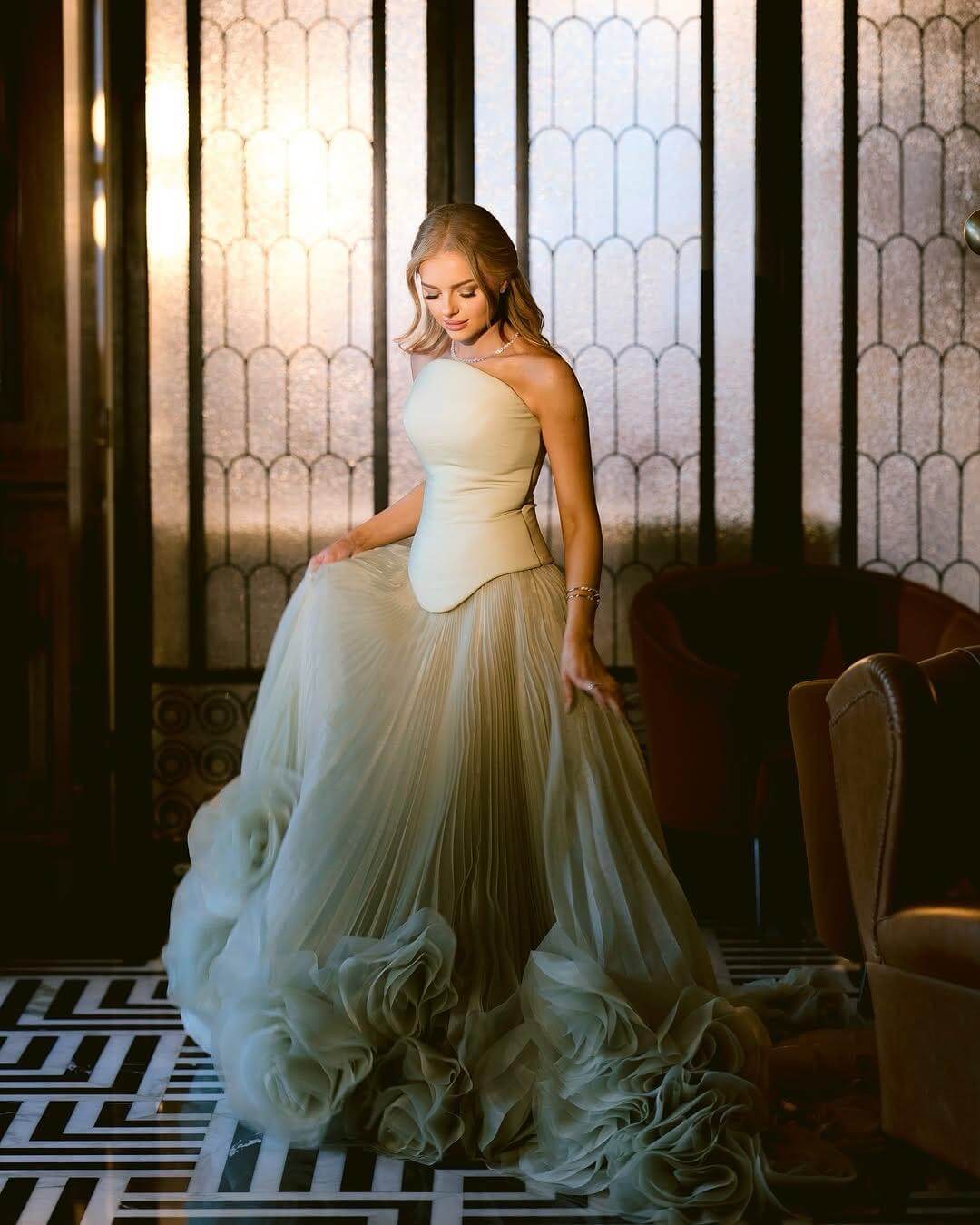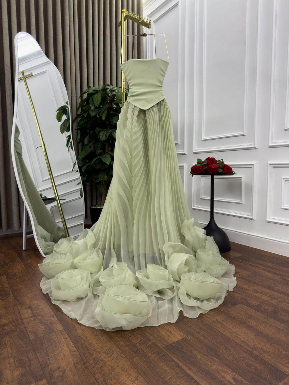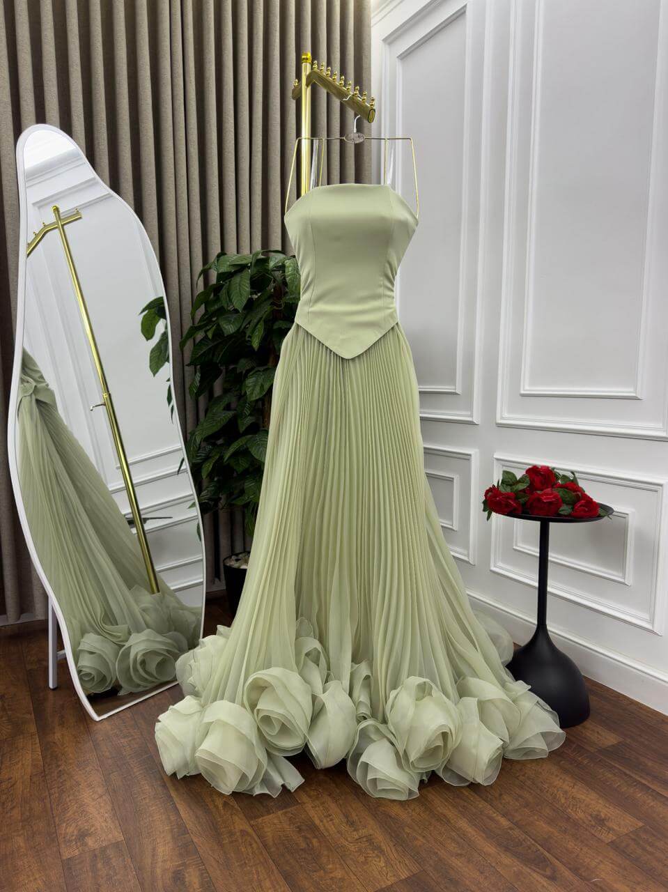 إطلالة أنثوية ساحرة يقدمها هذا الفستان الراقي باللون الأخضر الفاتح، بتصميم يعكس الفخامة والرقي. يتميز بتفاصيل ورود ثلاثية الأبعاد في الأسفل تضيف لمسة من الجمال والرومانسية، مع قصّة متناسقة تبرز جمال القوام. اختيار مثالي للسهرات الفاخرة، حفلات الزفاف، والخطوبة.