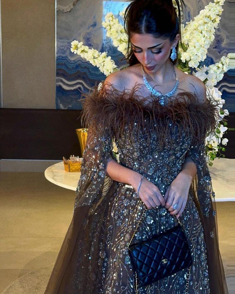 عند الأكتاف، يكلّله ريش فاخر يمنحك حضورًا مخمليًا استثنائيًا، بينما ينزلق الكاب الشفاف بانسيابية شاعرية تزيد الإطلالة عمقًا ورقّة.