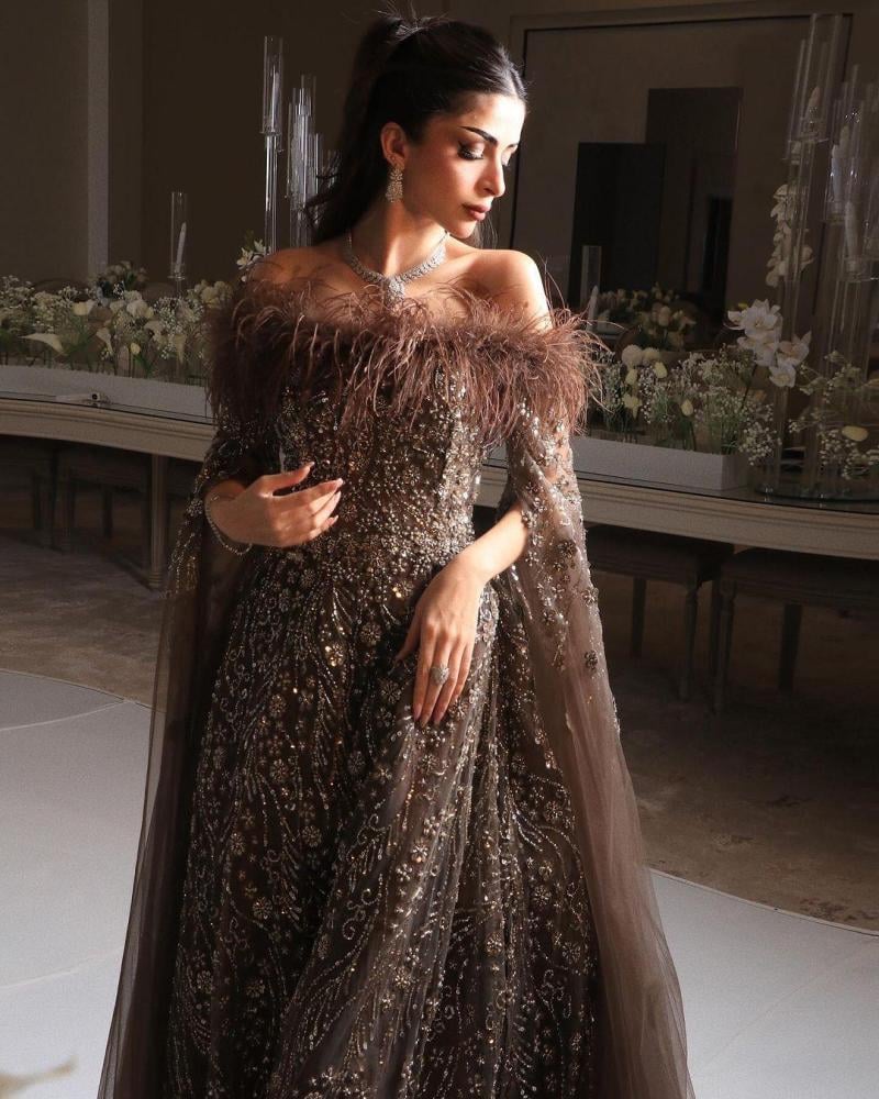 يأتي باللون البني الملكي الغني، مطرّز يدويًا بخرز ولمعان مذهل يعكس الإضاءة بطريقة تخطف الأنفاس.