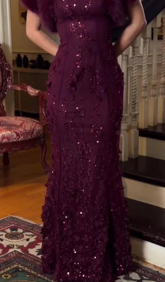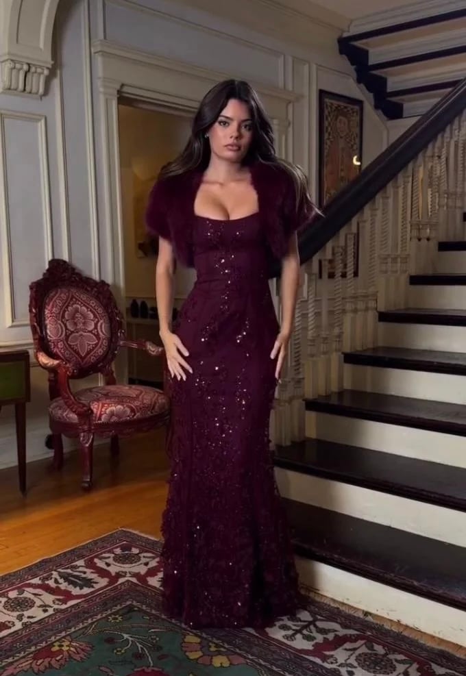 فستان خمري ثقيل بالفخامة، مطرّز بلمعة هادئة تعطيك حضور كلاسيكي راقٍ.