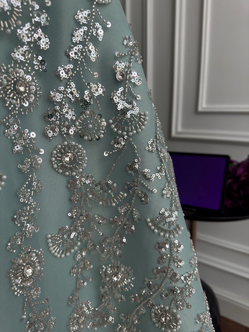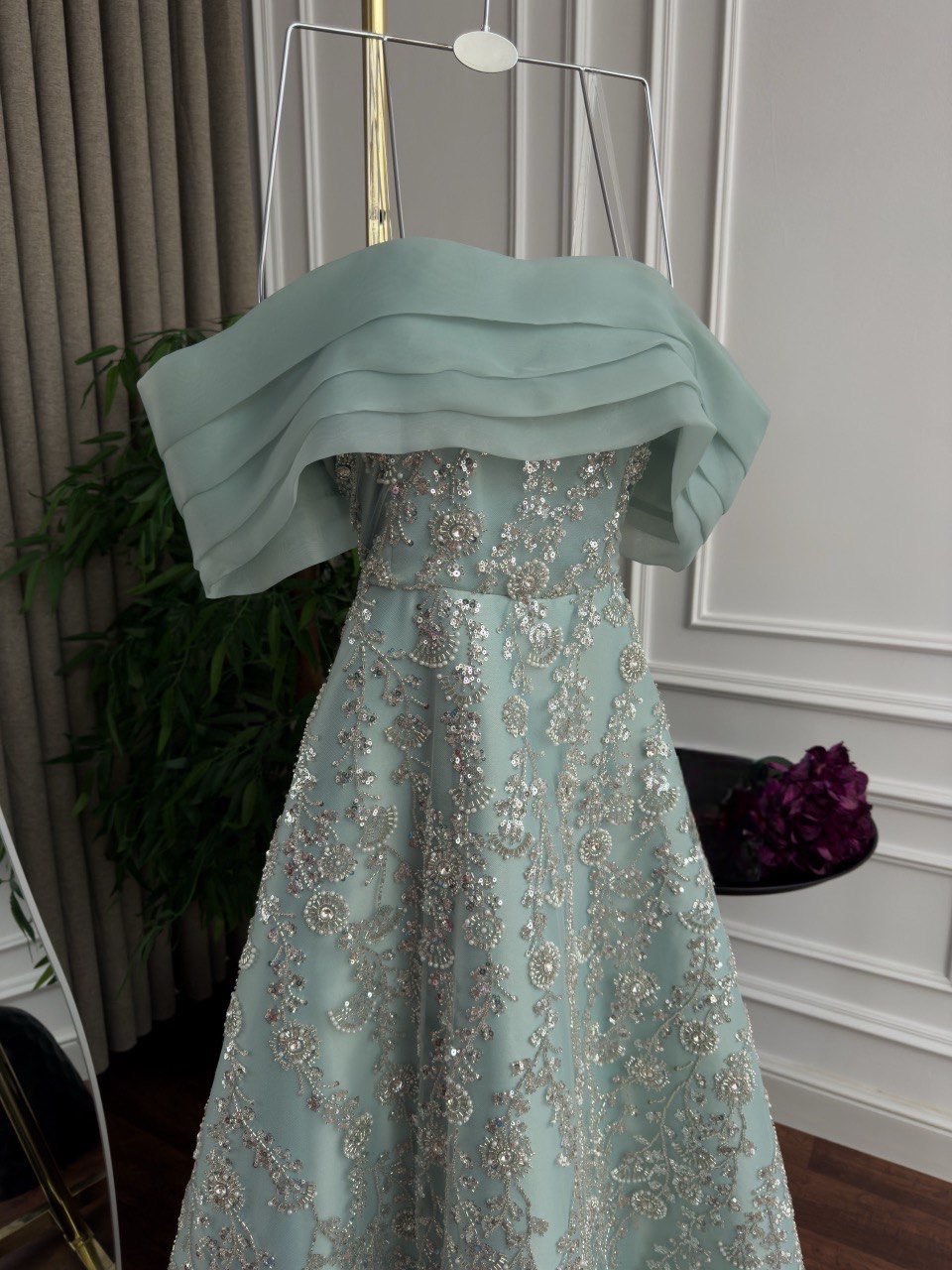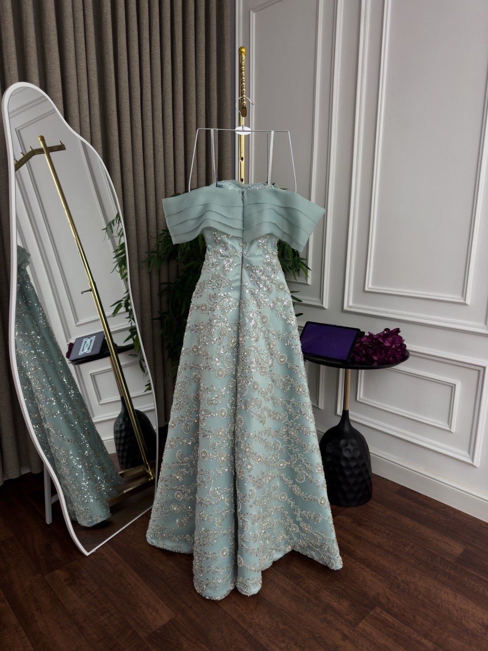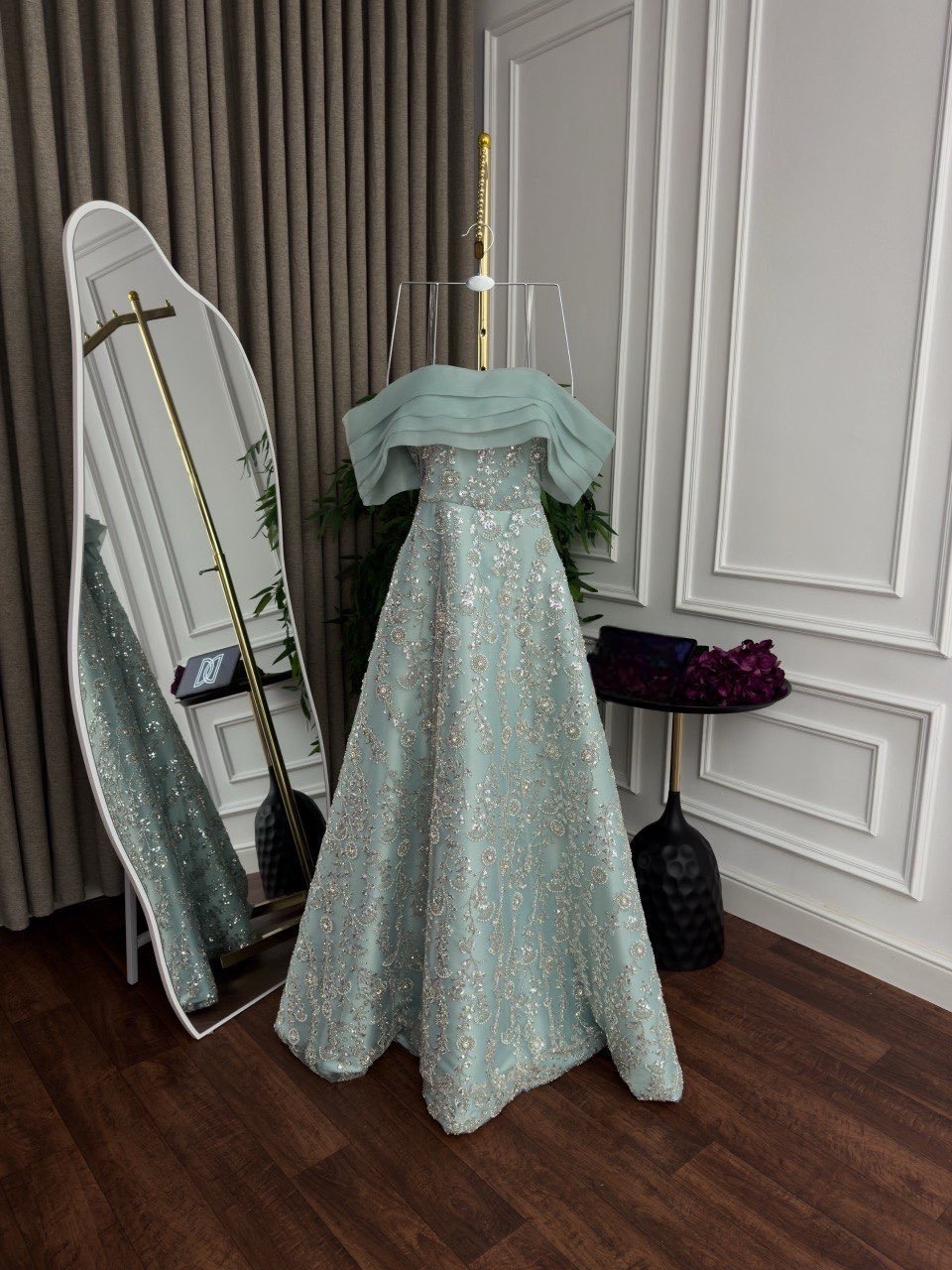 فستان سهرة فاخر باللون الأخضر الفاتح (Mint Green) بتصميم أوف شولدر أنيق يبرز الأنوثة والرقي. يتميز بتطريز متقن بكريستالات براقة تضفي لمسة ملكية فاخرة. قصة الفستان الواسعة من الأسفل تمنح حرية وانسيابية مثالية، مما يجعله الخيار الأمثل للمناسبات الراقية وحفلات السهرة المميزة.