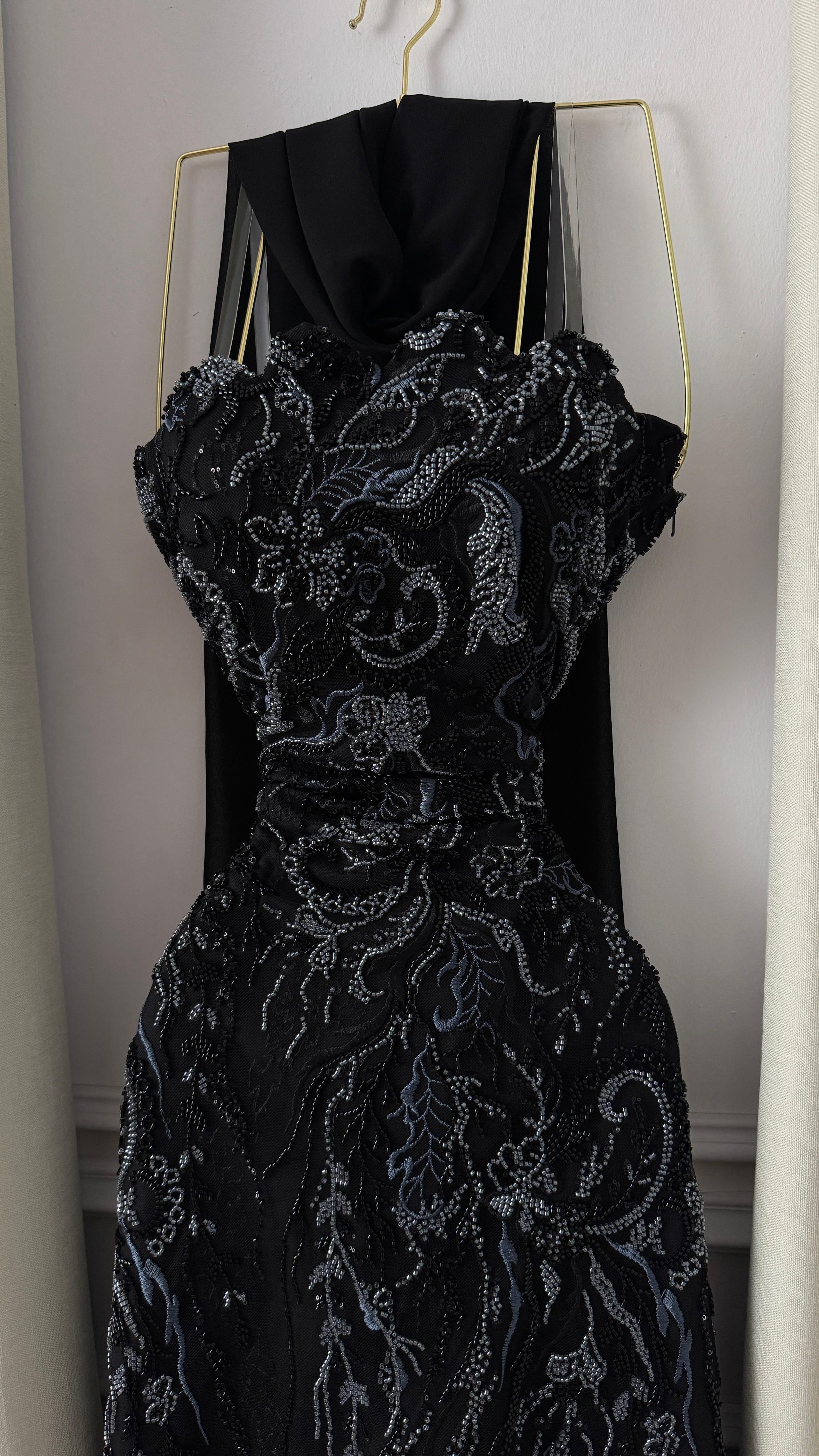 فستان سهرة فاخر باللون الكحلي العميق، يزدان بتطريز متقن بخيوط لامعة تضفي لمسة من الفخامة والرقي. يتميز بقصة ضيقة عند الخصر لإبراز القوام مع انسيابية أنيقة من الأسفل، ما يمنحك حضوراً مميزاً وإطلالة استثنائية. تصميمه الكلاسيكي بلمسات عصرية يجعله الخيار الأمثل للسهرات، حفلات الزفاف والمناسبات المميزة.