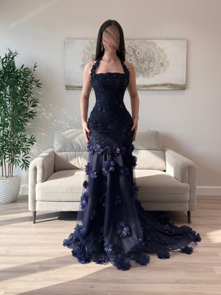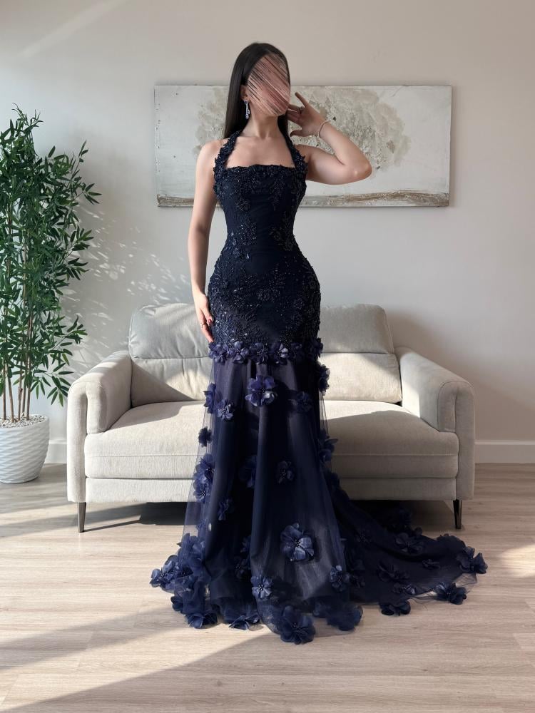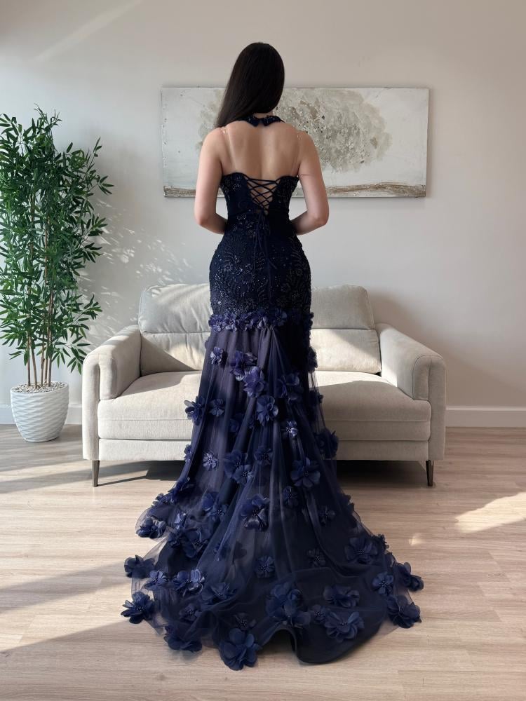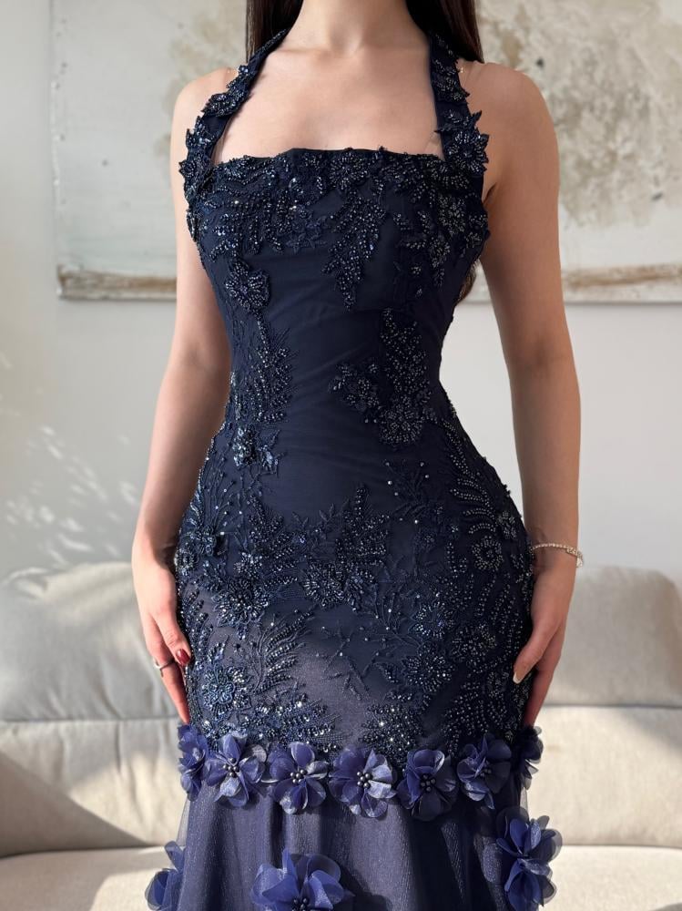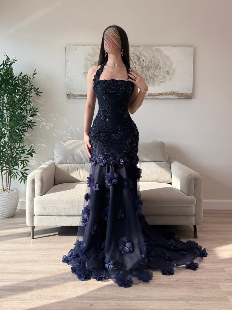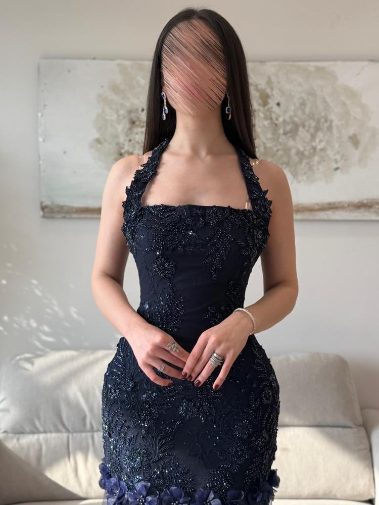 فستان سهرة كحلي بنبرة ملكية تأسر العين قبل الكلام.
