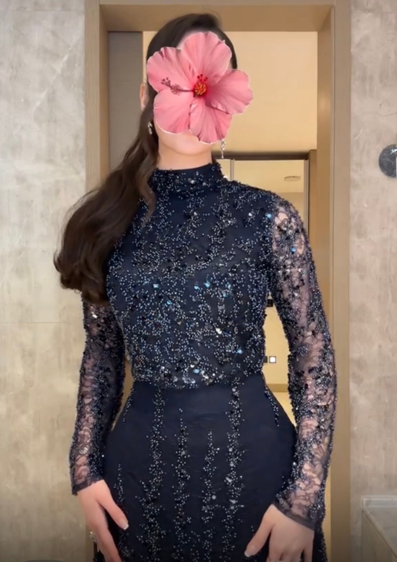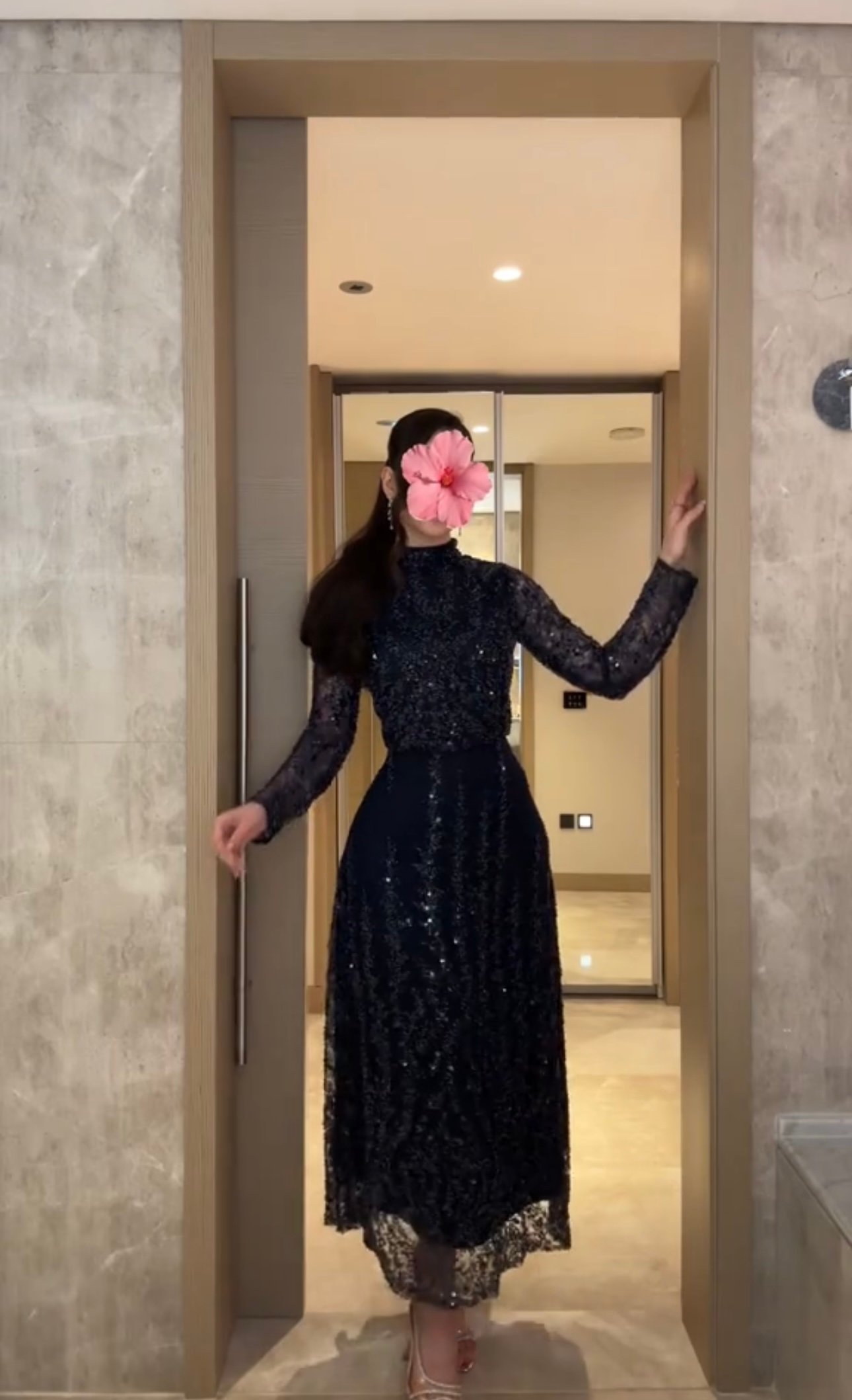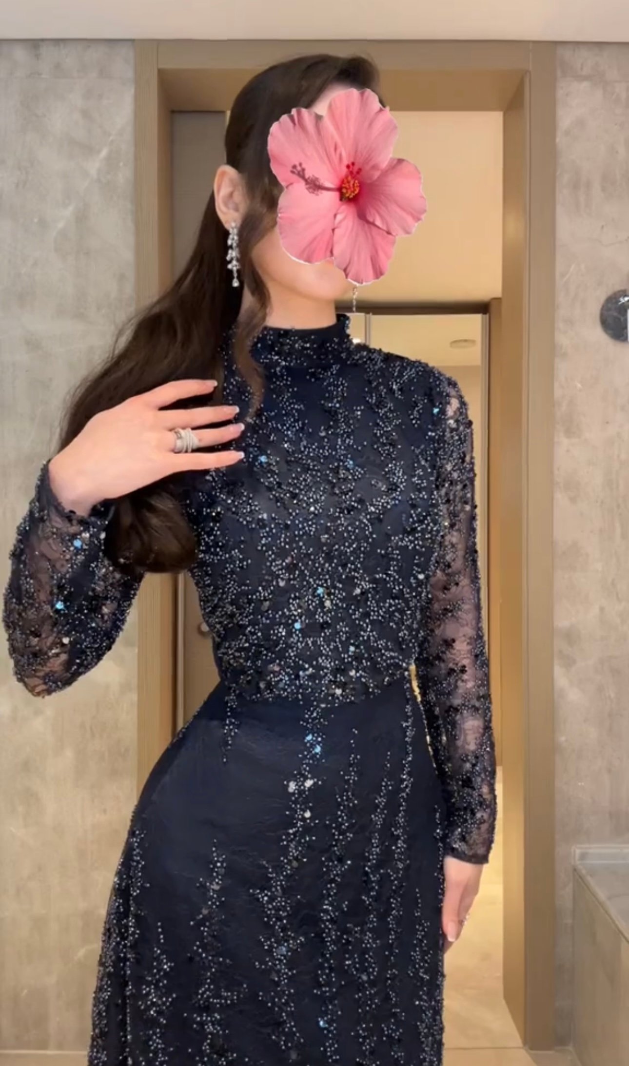 تميزي بإطلالة راقية مع هذا الفستان الكحلي المصنوع من التول المطرز بالترتر البراق. تصميم بأكمام طويلة وياقة عالية يمنحك لمسة من الفخامة، مع قصة متوسطة الطول تجمع بين الأناقة والاحتشام.