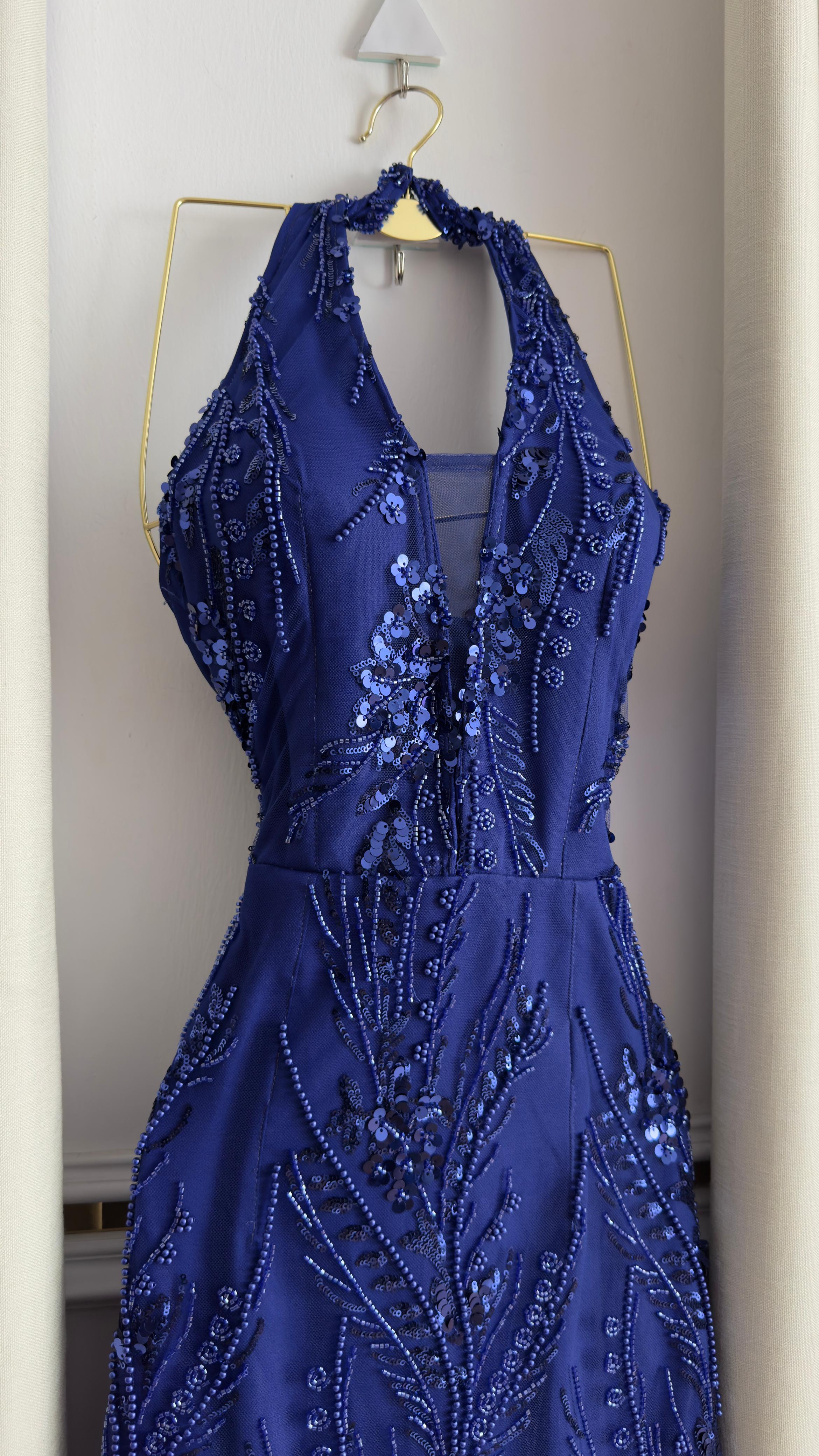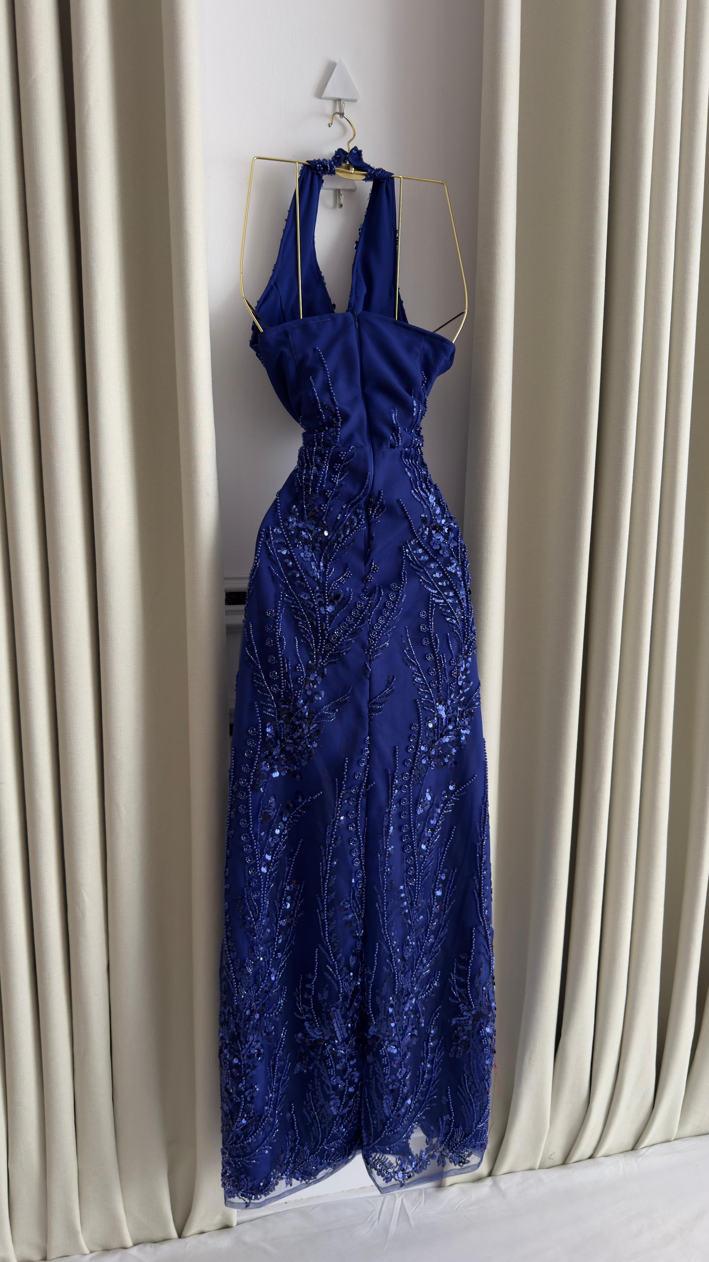 فستان أزرق داكن يفيض فخامة وأناقة لا مثيل لهما.