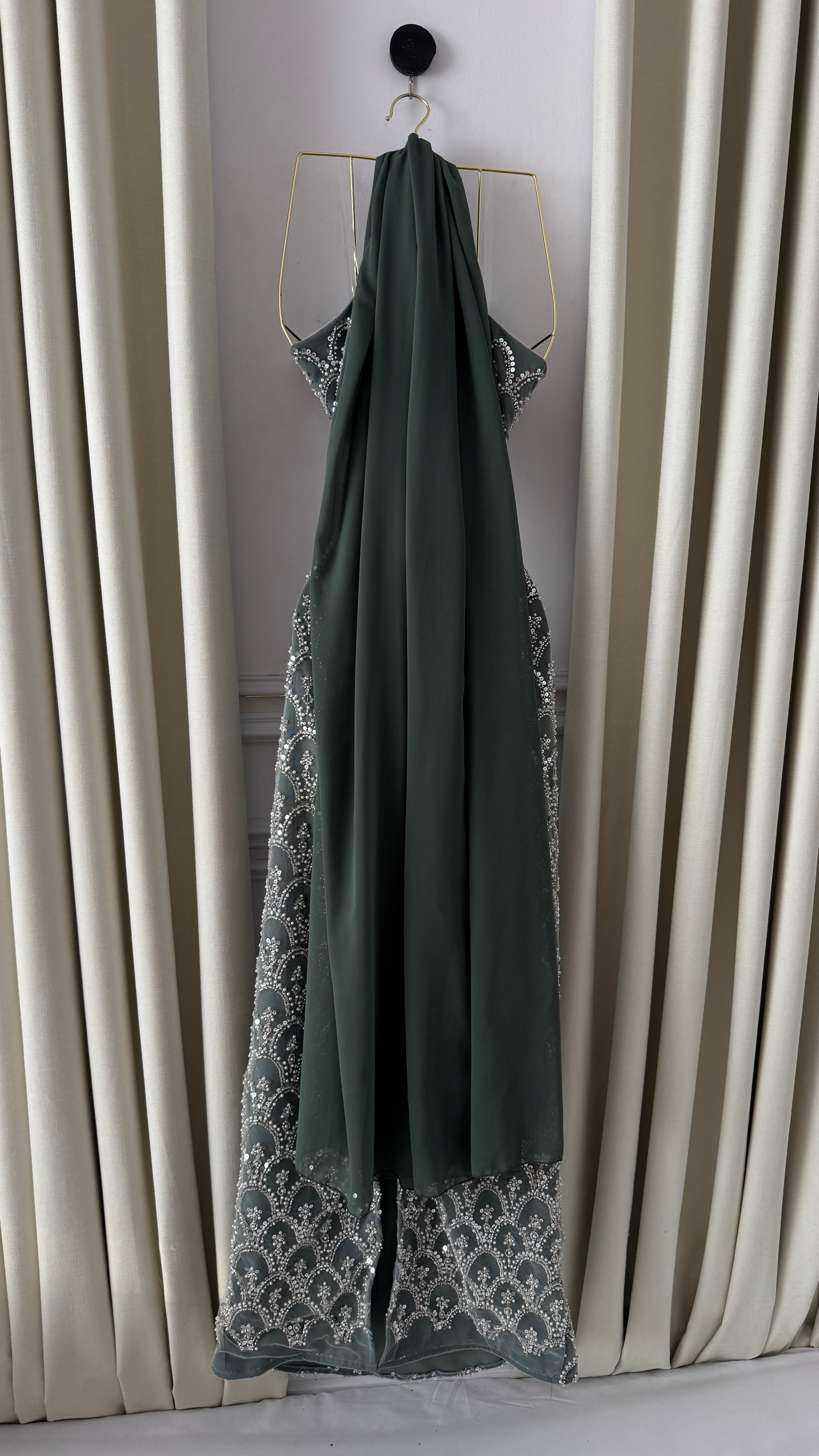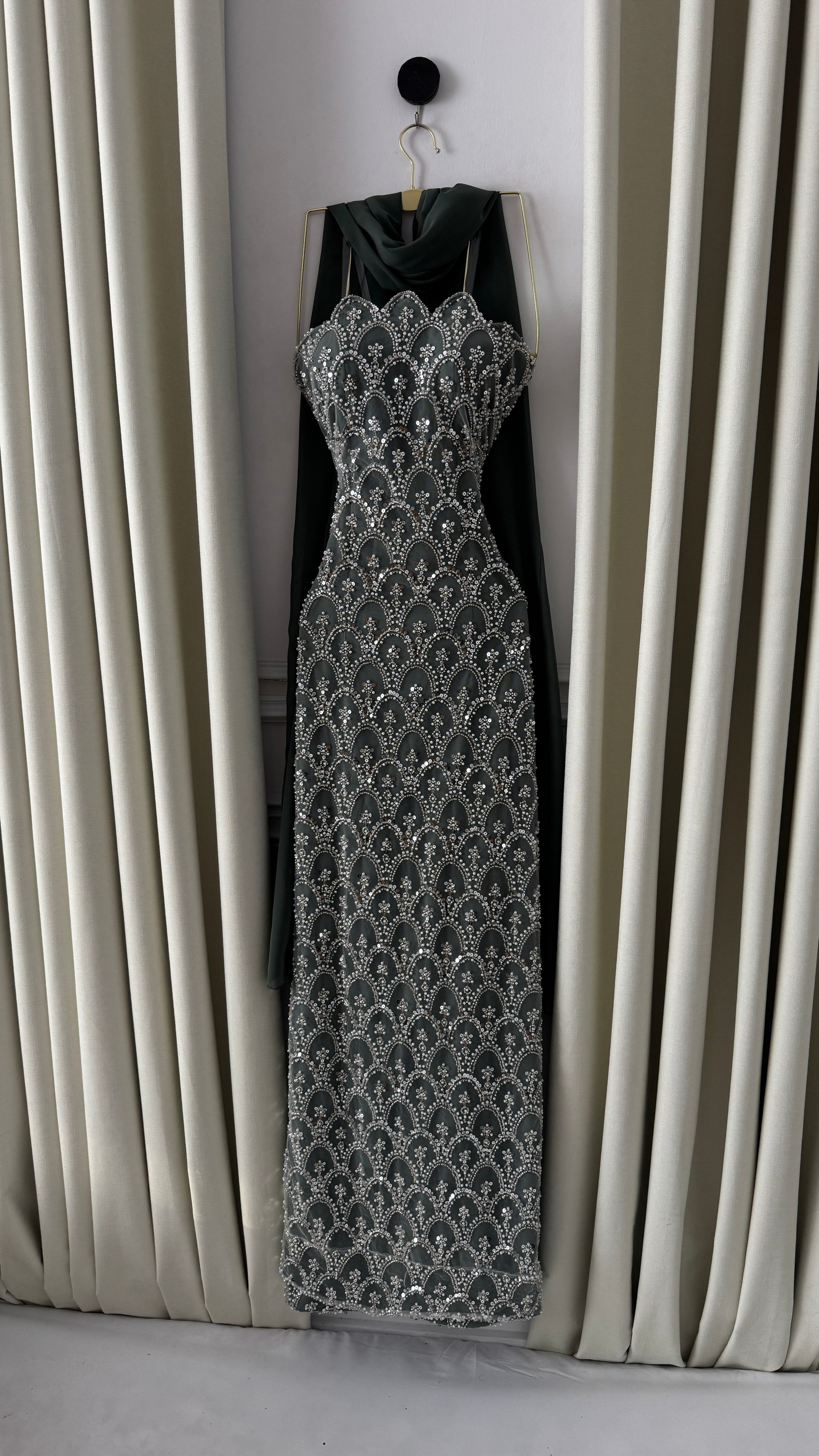 هذا الفستان الكحلي الطويل مصمم ليجمع بين الفخامة والأناقة العصرية. يتميز بتطريز لامع من الكريستال يغطي القماش بالكامل بنمط متناسق يشبه الأقواس المزينة، مما يمنحه إشراقة خاصة عند انعكاس الضوء. القصة الضيقة تسلط الضوء على انحناءات القوام برشاقة، بينما تضيف الياقة الفريدة مع القماش الحريري المتدلي خلف الأكتاف لمسة ملكية مميزة.