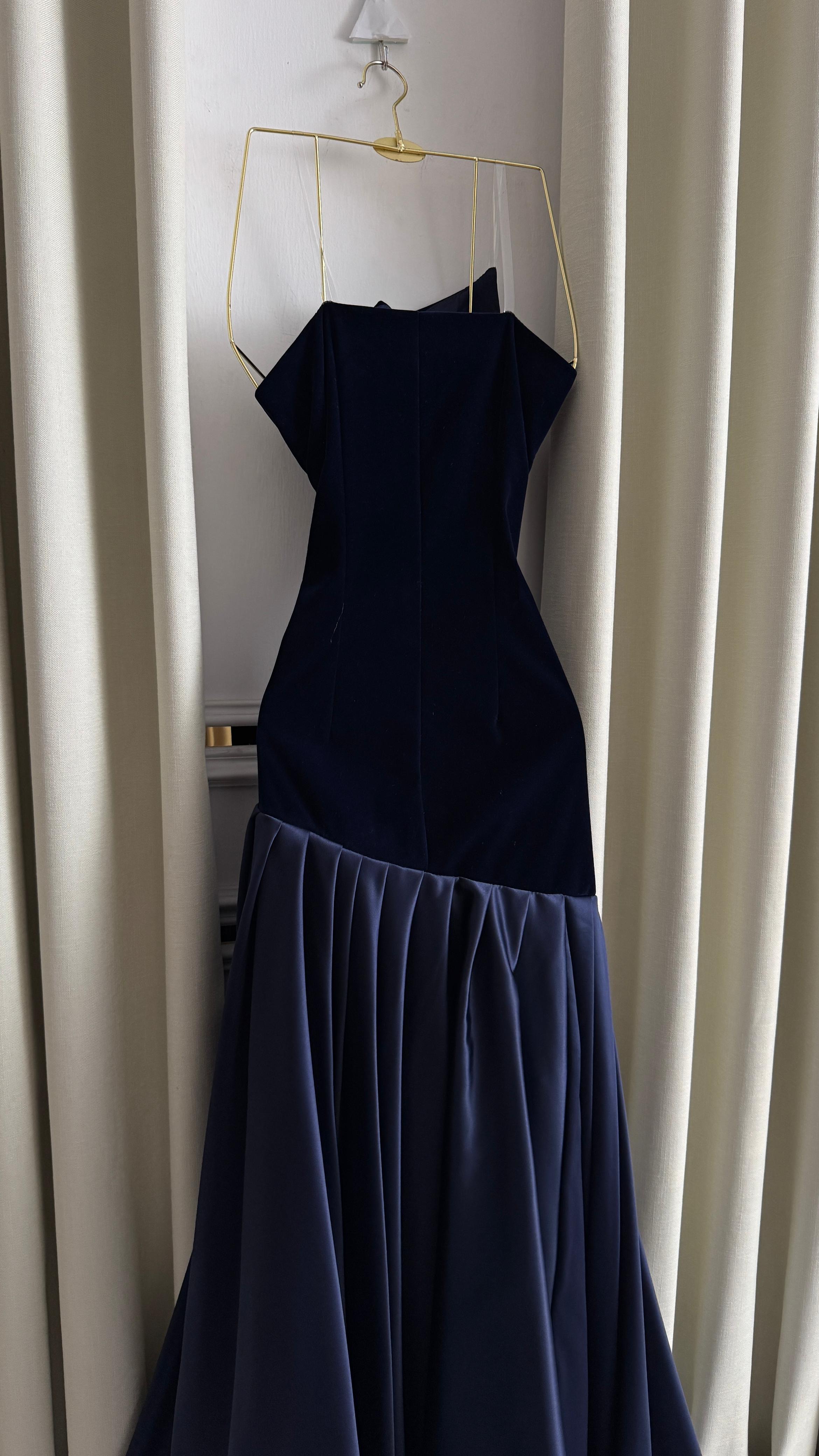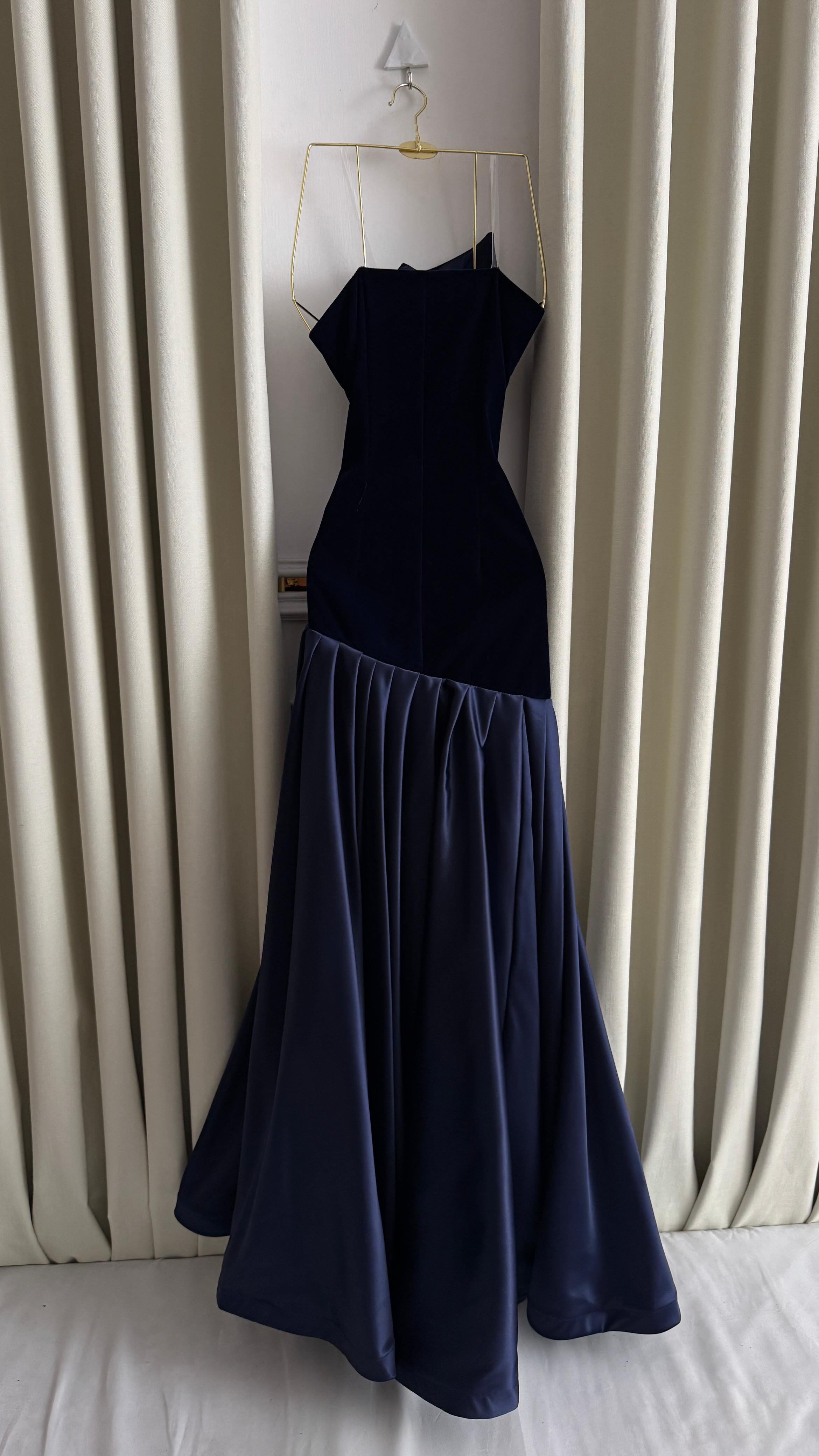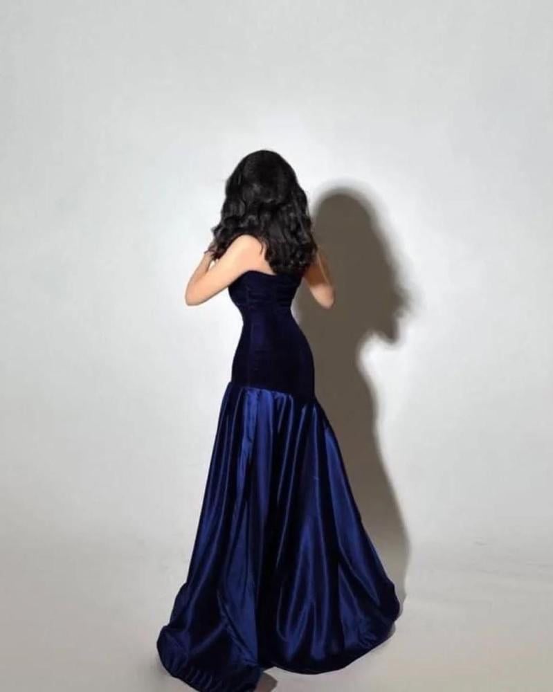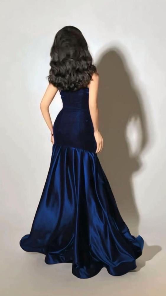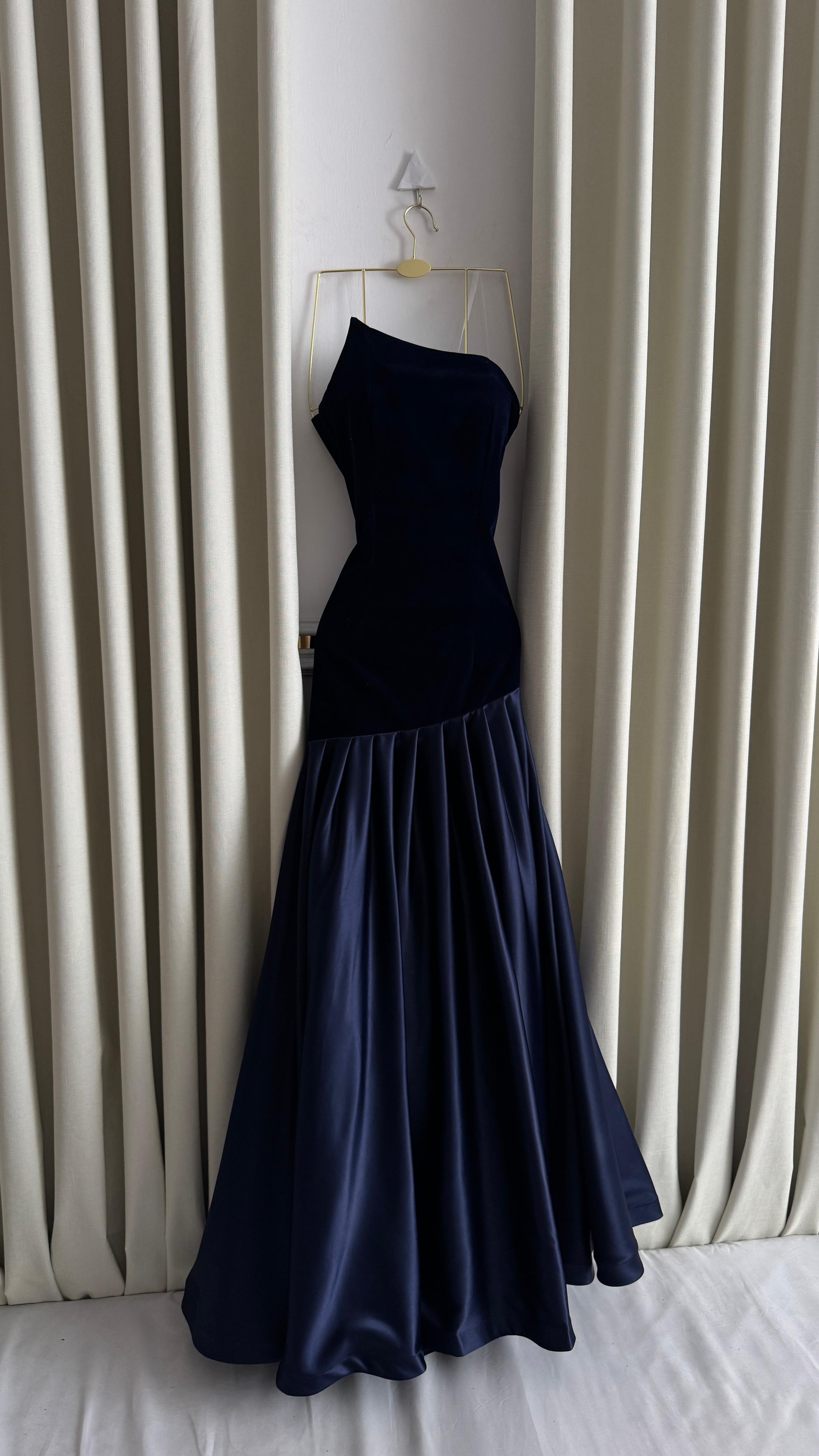 فستان سهرة فاخر باللون الكحلي العميق، مصنوع من قماش ساتان حريري لامع يبرز الأنوثة والفخامة. يتميز بقصة ضيقة عند الخصر مع تنورة واسعة منسدلة تعكس حضورًا ملكيًا لافتًا. مثالي للسهرات الرسمية والمناسبات الفاخرة.