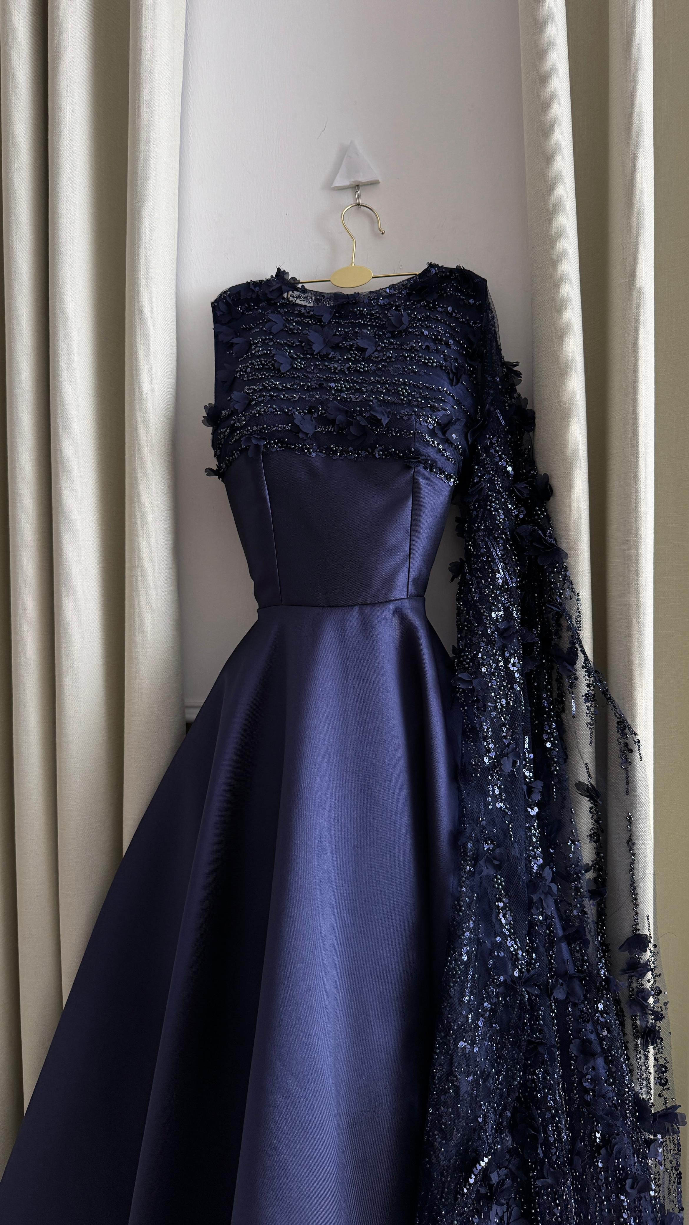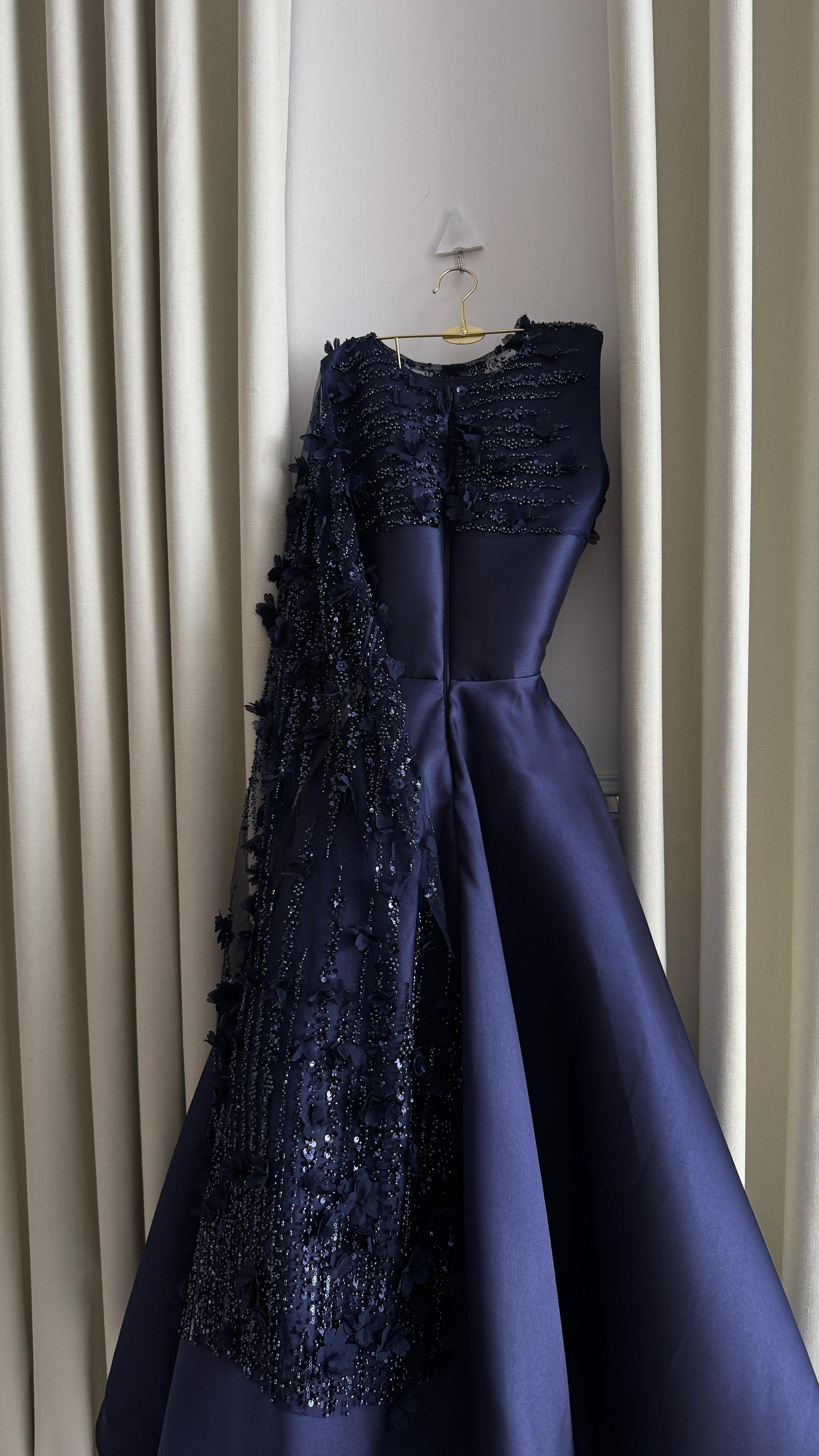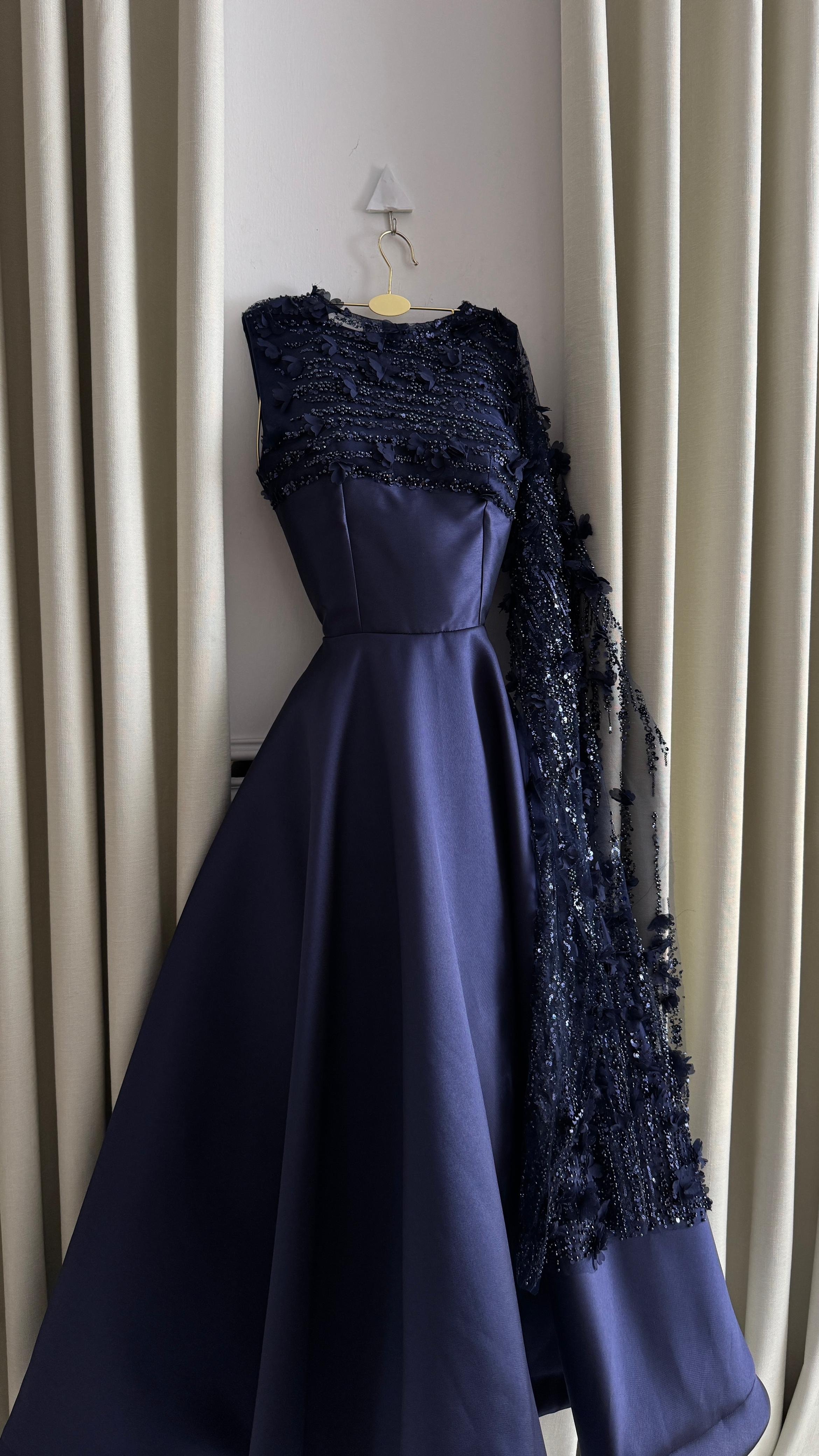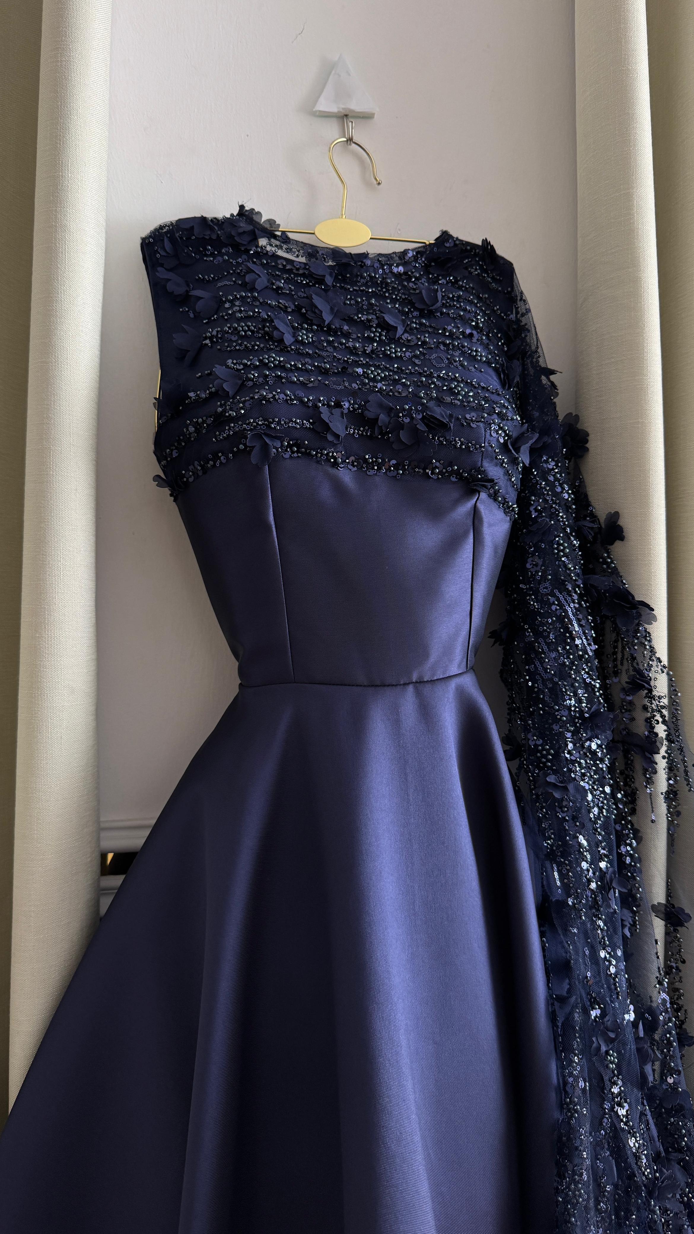 فستان كحلي متوسط الطول بتفاصيل أنيقة على الصدر مع شال جانبي، مثالي للسهرات والمناسبات الرسمية.