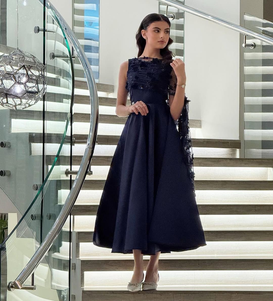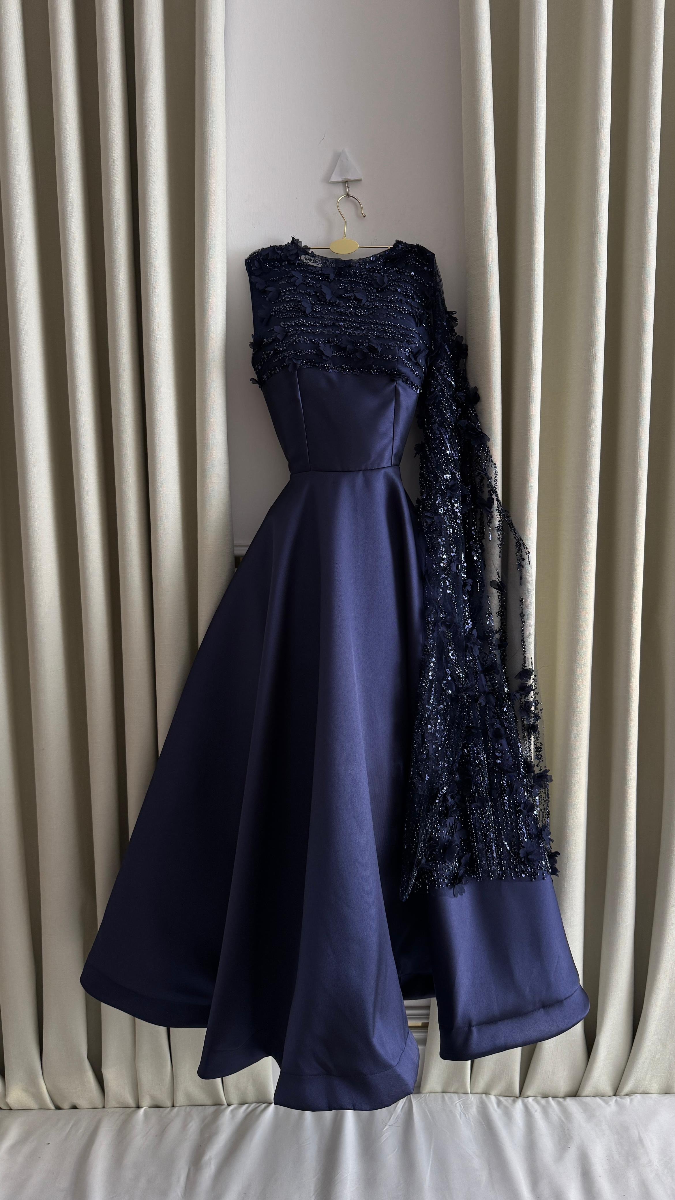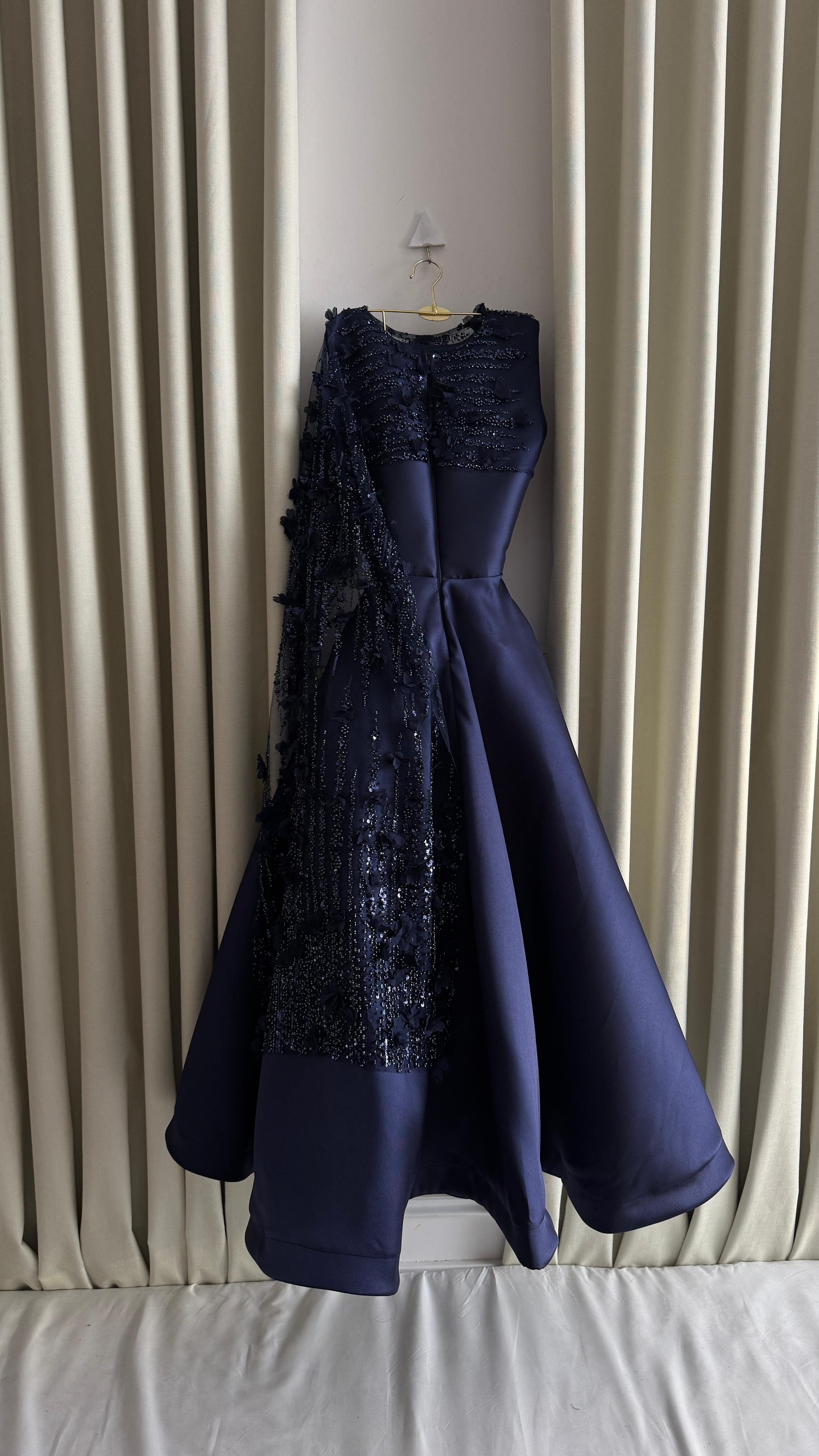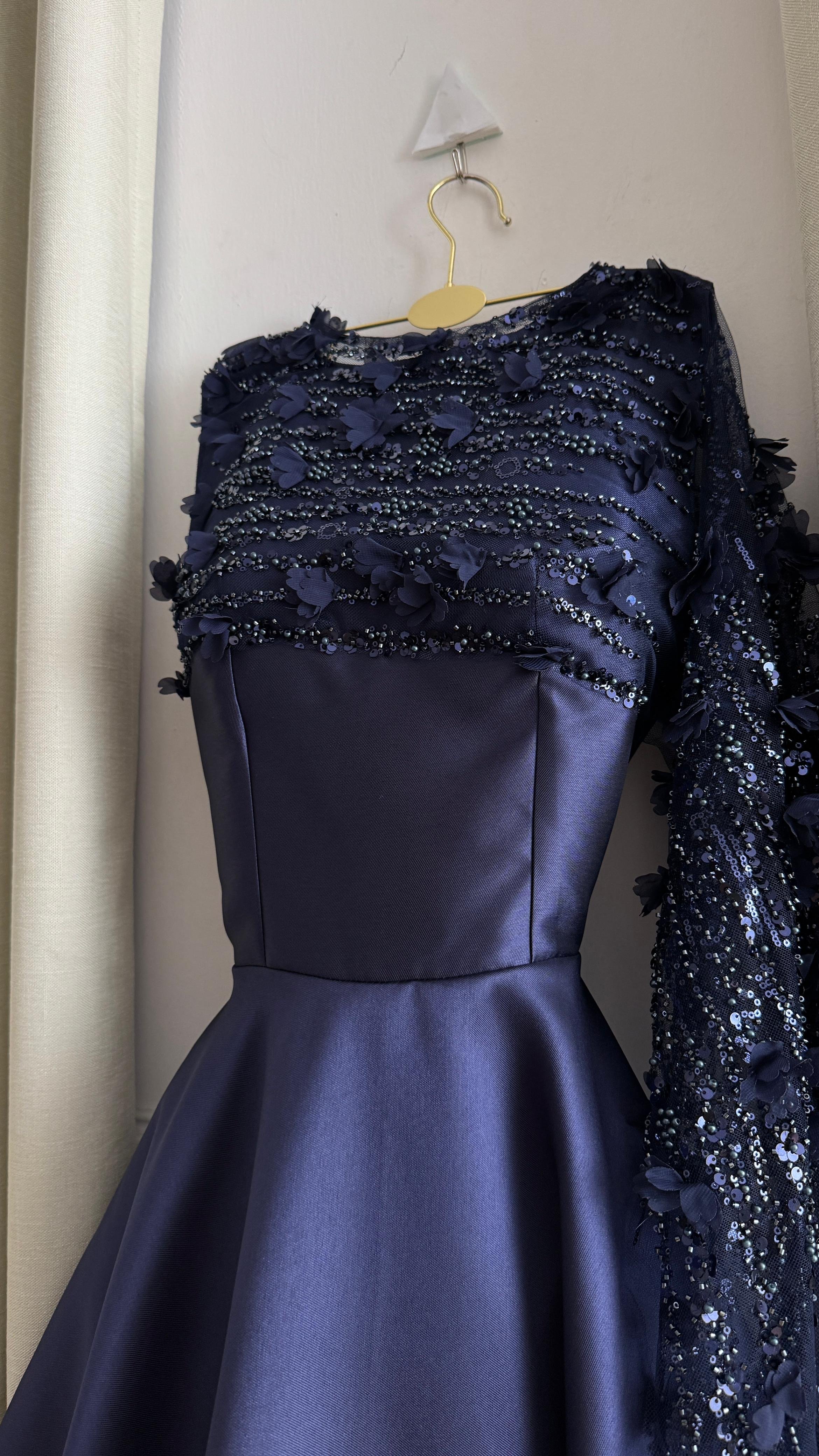 فستان كحلي متوسط الطول بتفاصيل أنيقة على الصدر مع شال جانبي، مثالي للسهرات والمناسبات الرسمية.