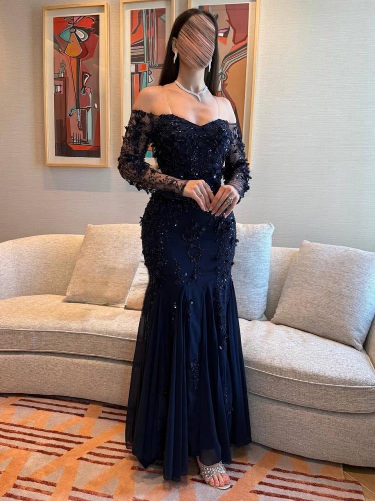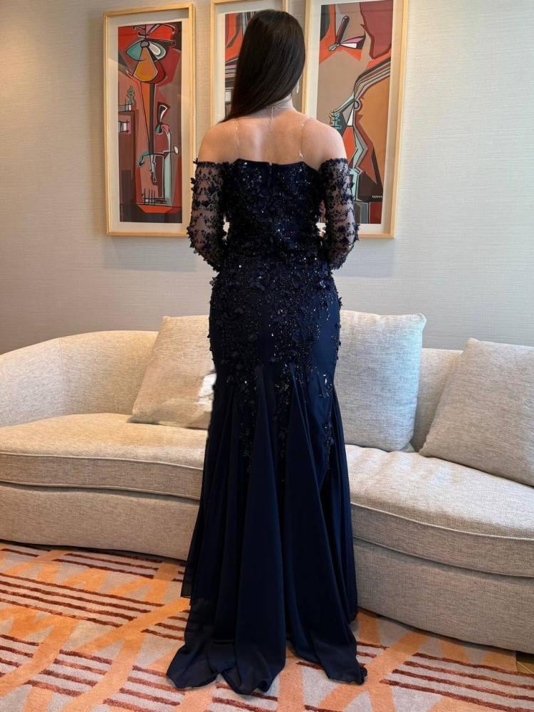 التصميم أوف شولدر يبرز جمال الأكتاف، بينما الأكمام الطويلة من الدانتيل المطرّز تضيف طبقة أناقة ما تتكرر.