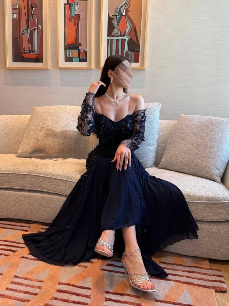 فستان بلون كحلي عميق، فخم بطريقة هادئة تخطف النظر بدون ما ترفع صوتها.