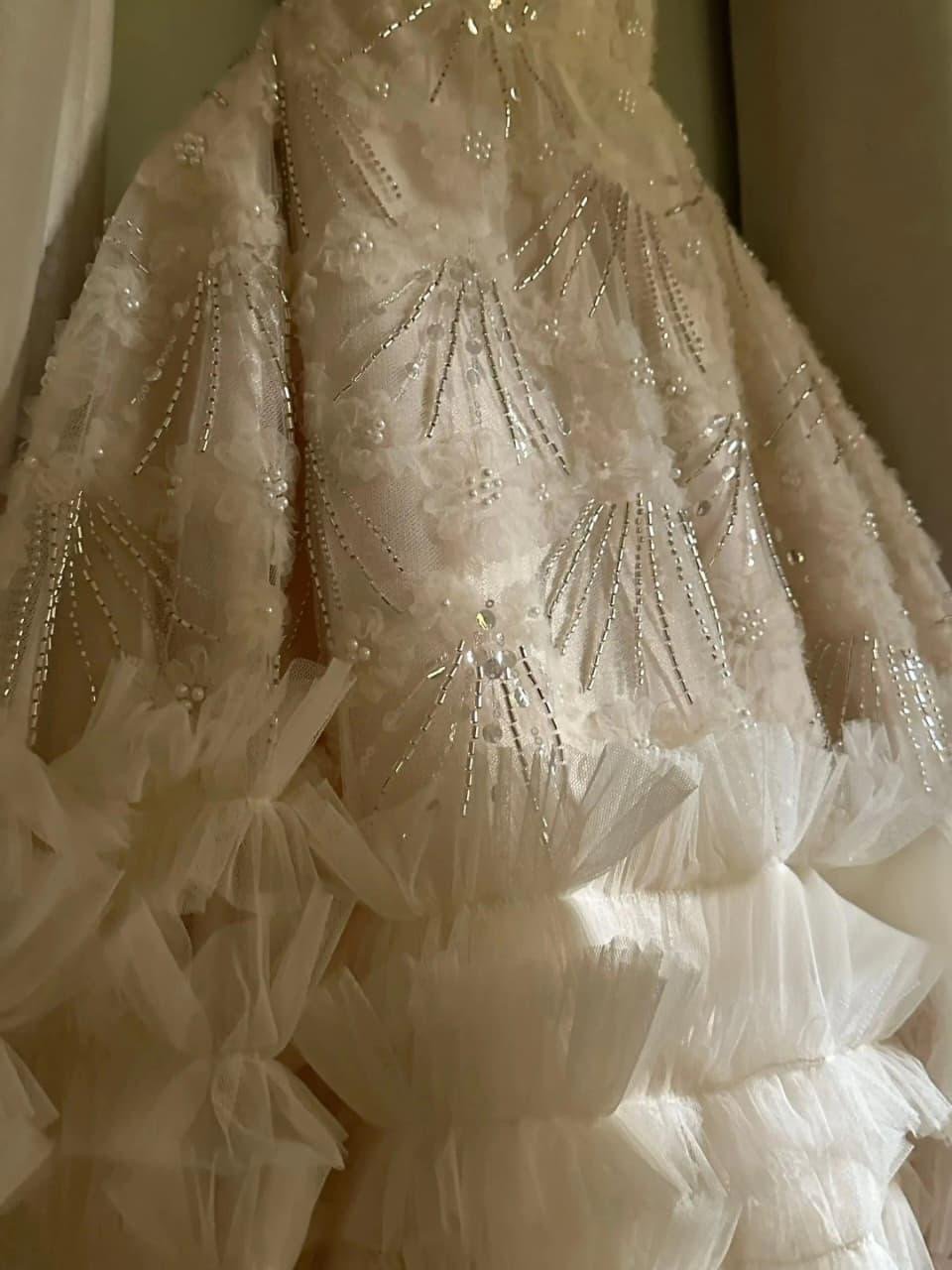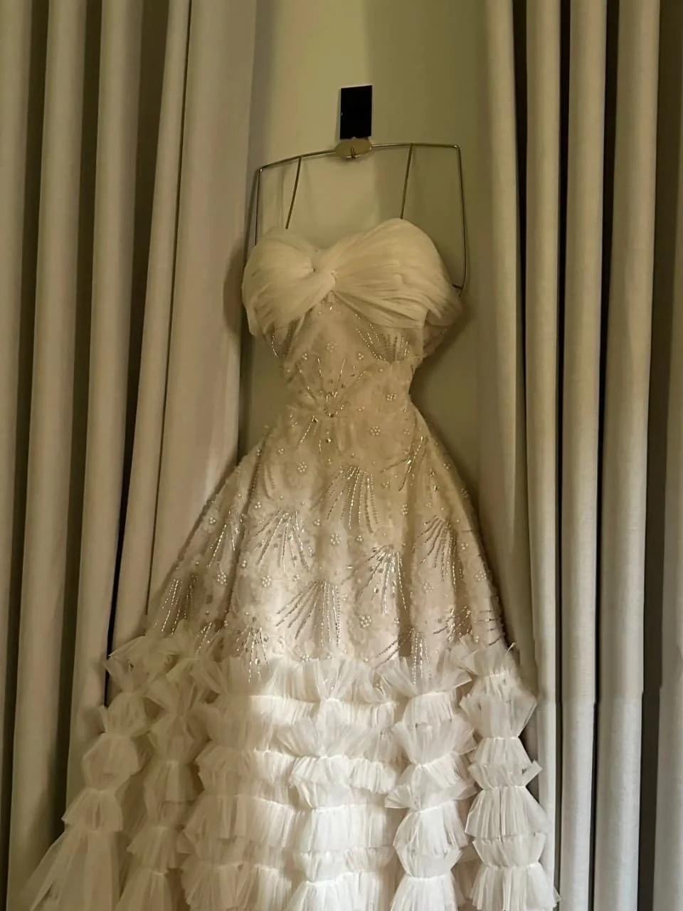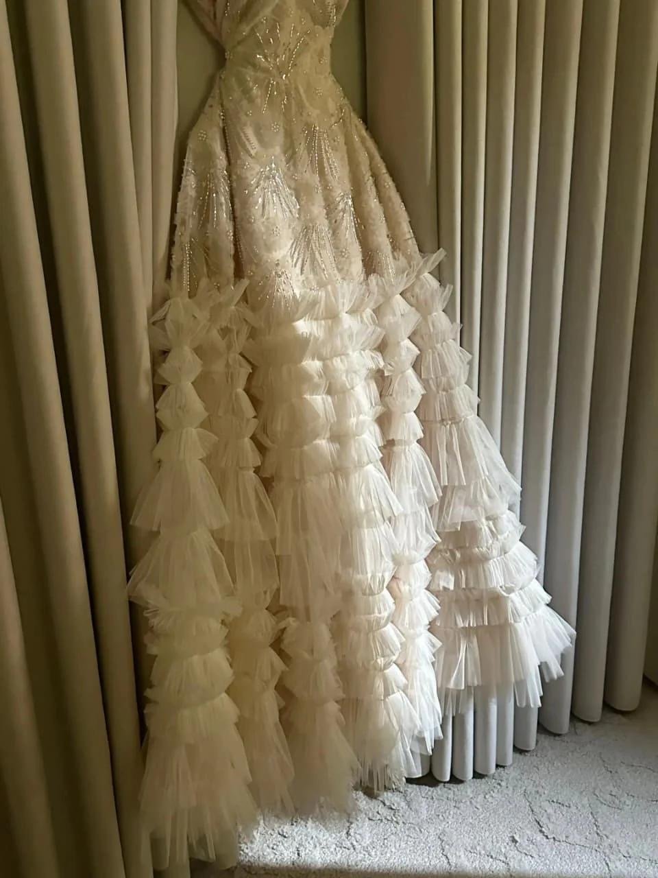 فستان سهرة أوف وايت بتصميم فاخر يلفت الأنظار بجاذبية طبقات التول المتدرجة وتطريزاته الناعمة التي تضفي لمسة من الرقي والفخامة. قصته الأنثوية تمنحك حضورًا ملكيًا في كل مناسبة، ليكون خيارك الأمثل لحفلات المساء والليالي الراقية.