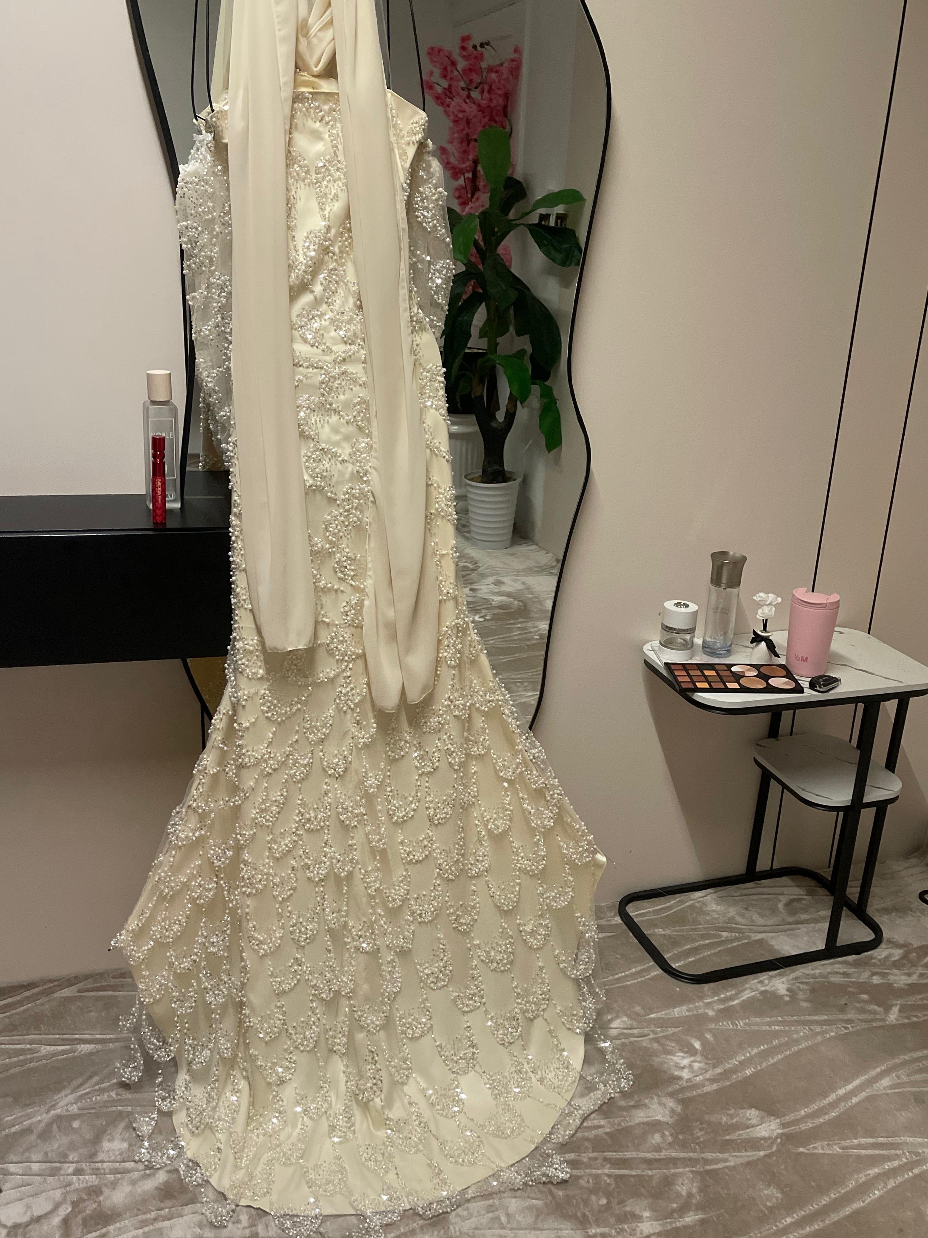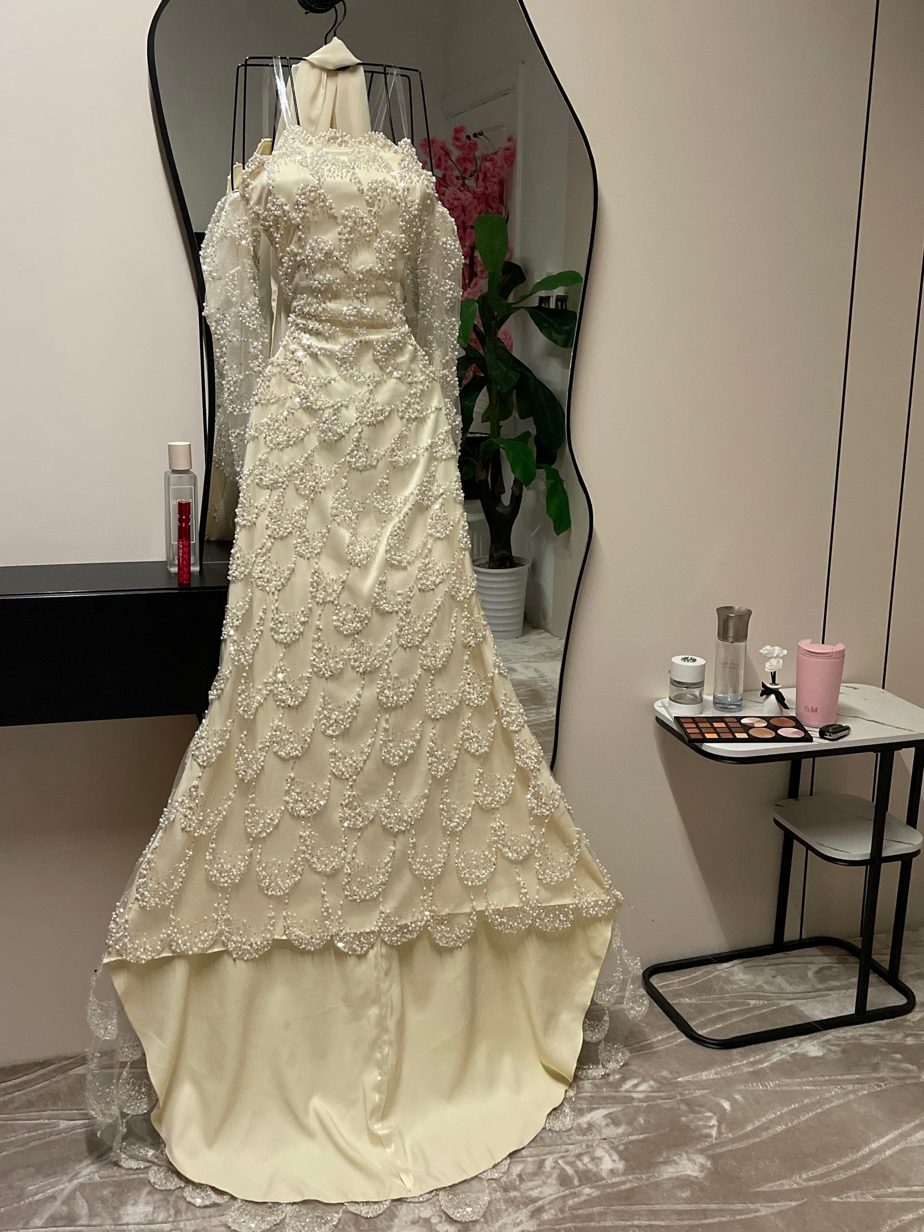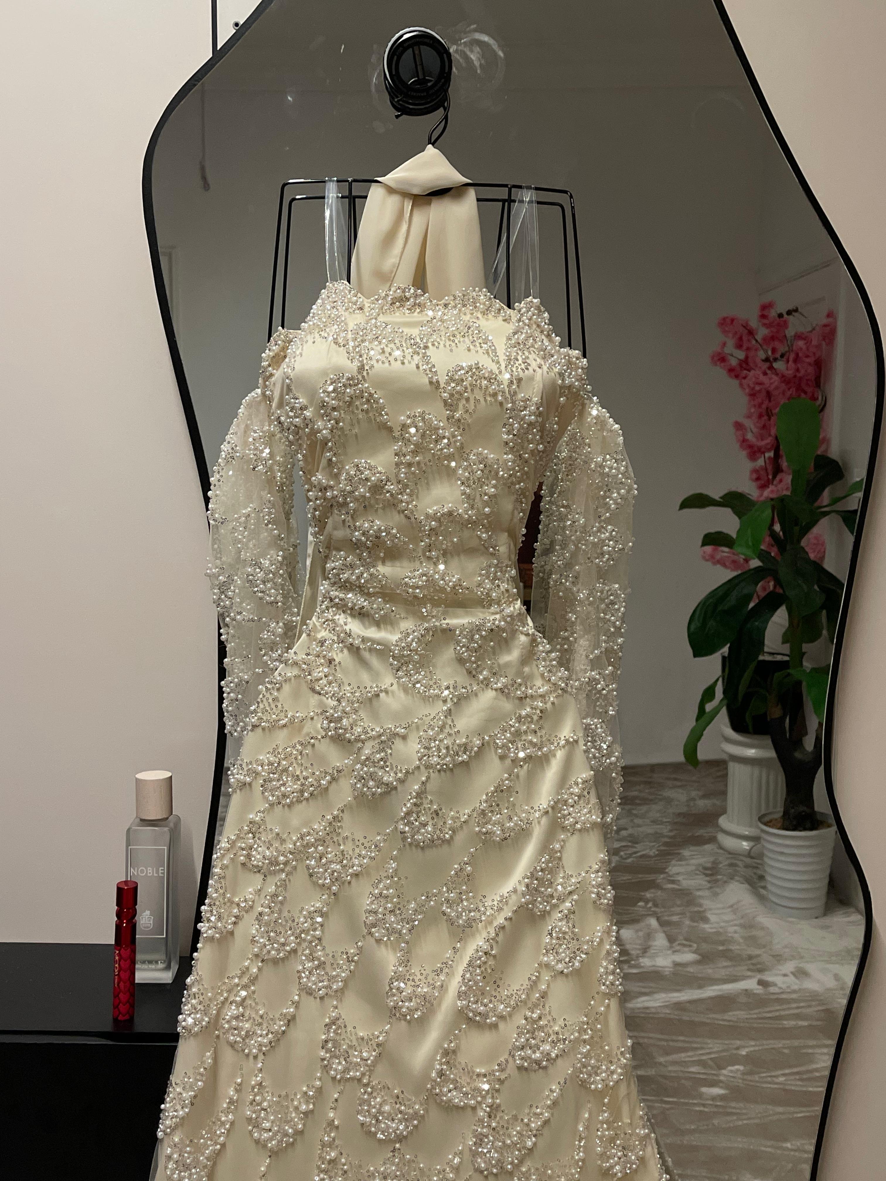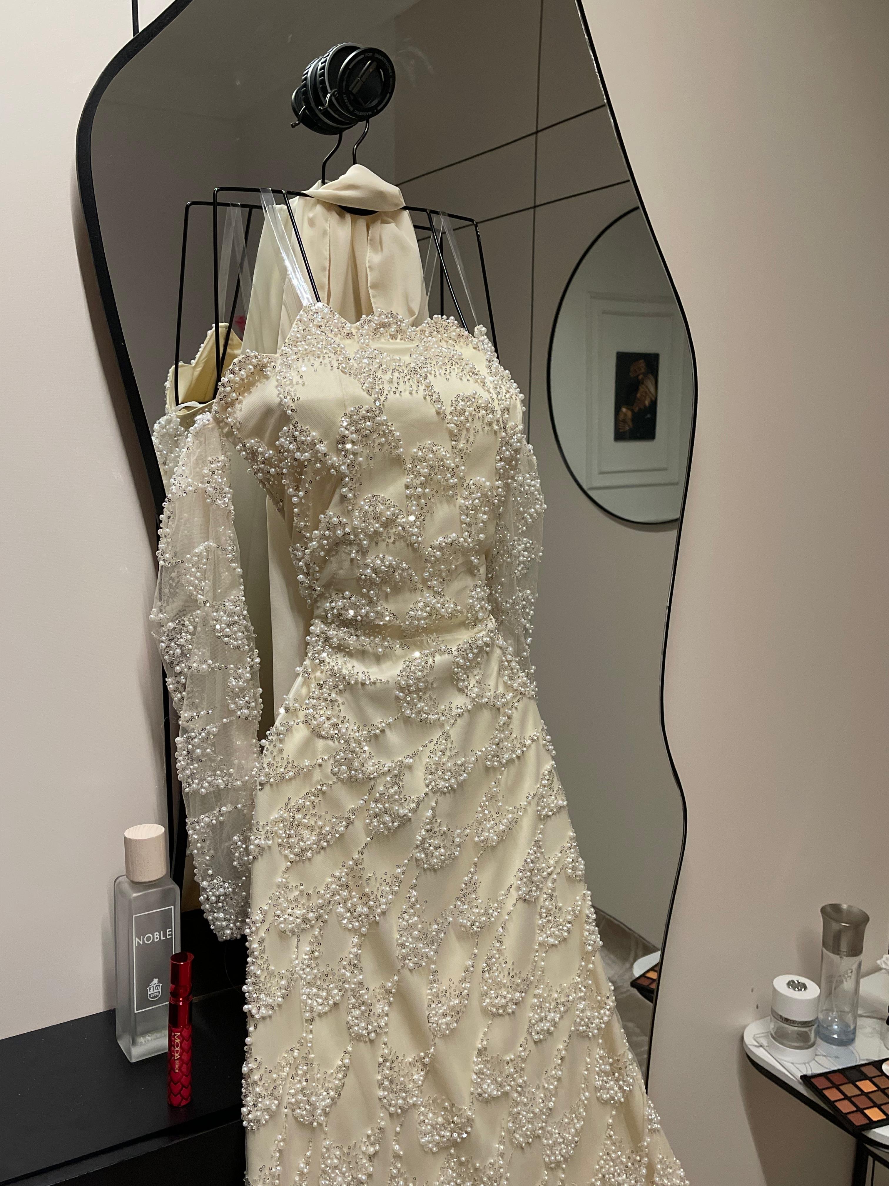 ستايل ملكي ساحر بتفاصيل لؤلؤية مترفة، يناسب حفلات الخطوبة والسهرات الراقية.