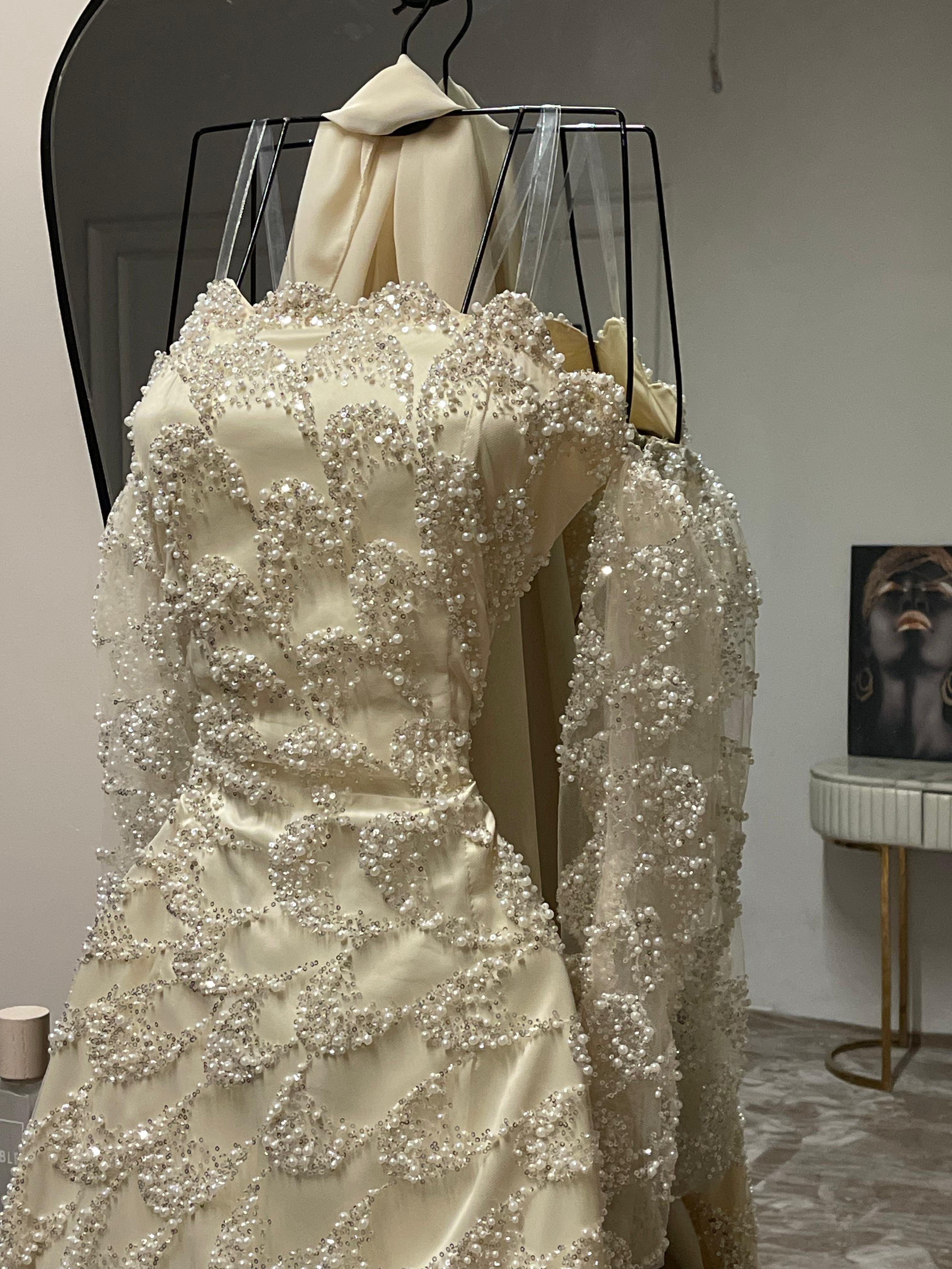 مصنوع من قماش فاخر مطرز بالكامل بحبات اللؤلؤ اللامعة بتصميم هندسي ساحر يلفت الأنظار من اللحظة الأولى.