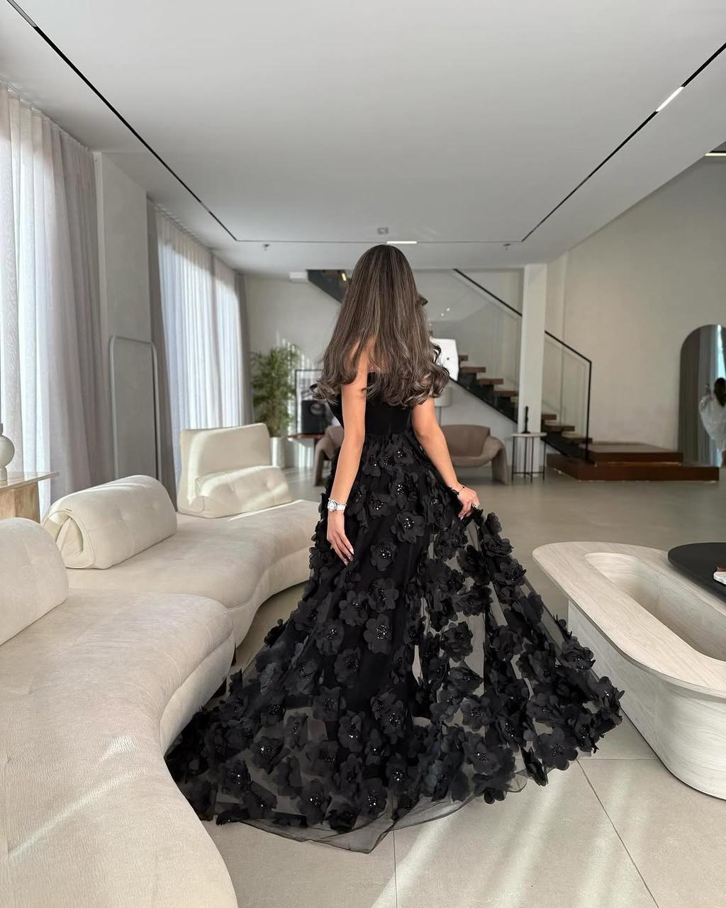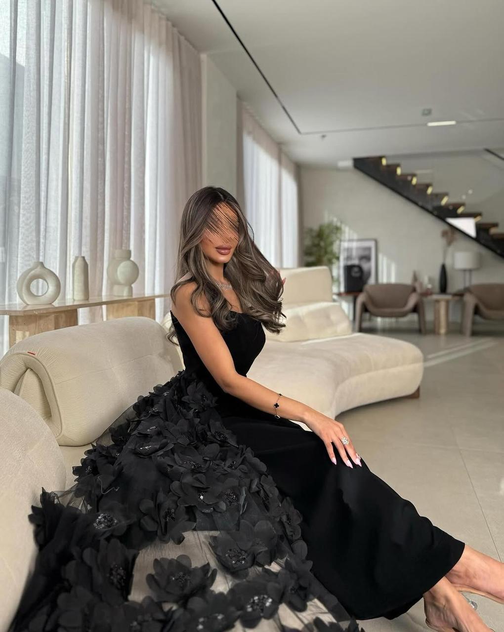 - تم تنسيقه مع صندل أسود بكعب مفتوح ولمعة خفيفة، يُظهر الأناقة دون تشتيت الانتباه عن الفستان.