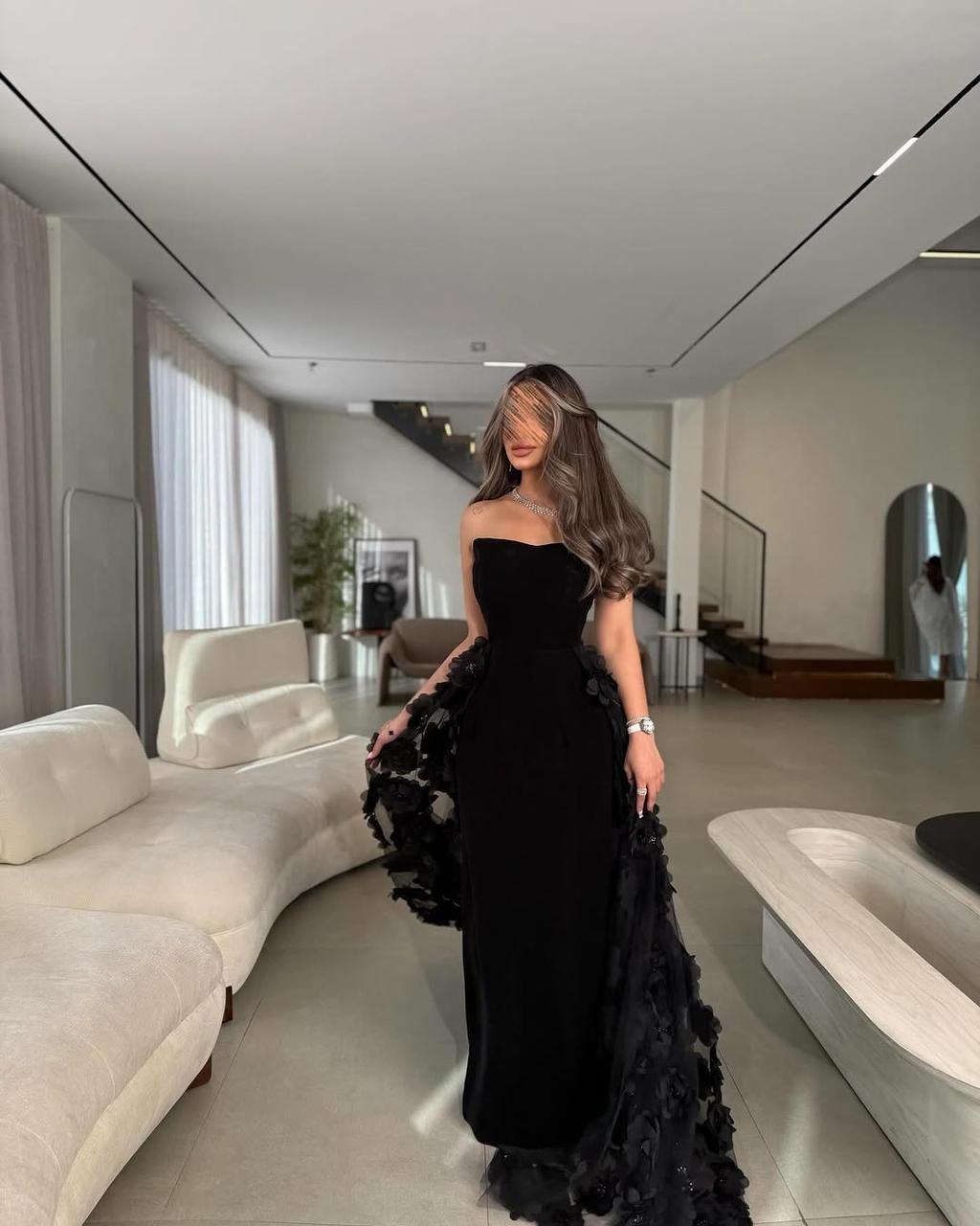 فستان سهرة طويل، بتصميم ضيق يبرز تناسق الجسم، يبدأ بقصة كورسيه ضيقة من الأعلى ويتسع تدريجياً من الركبة حتى الأسفل بانسيابية راقية.