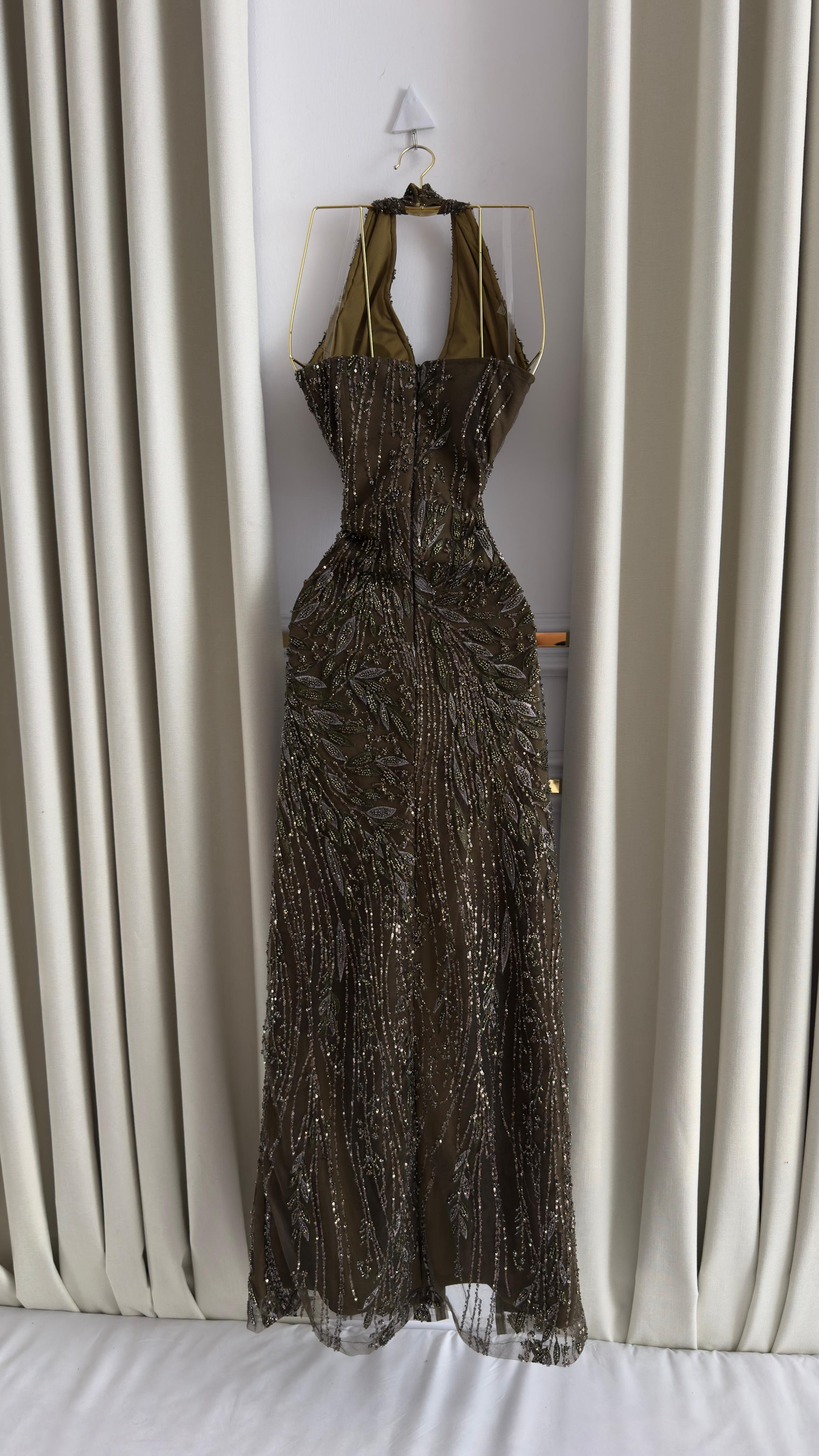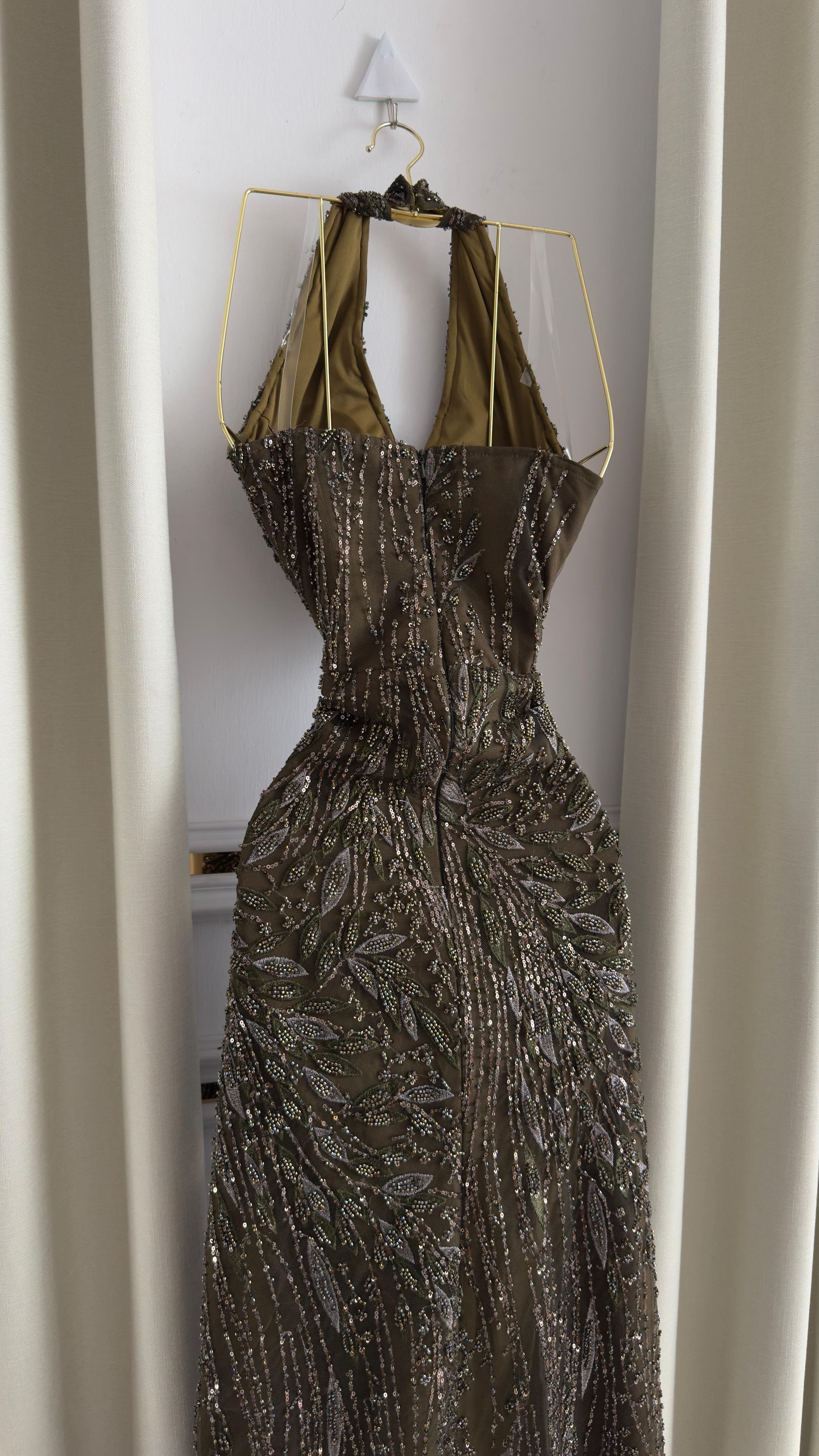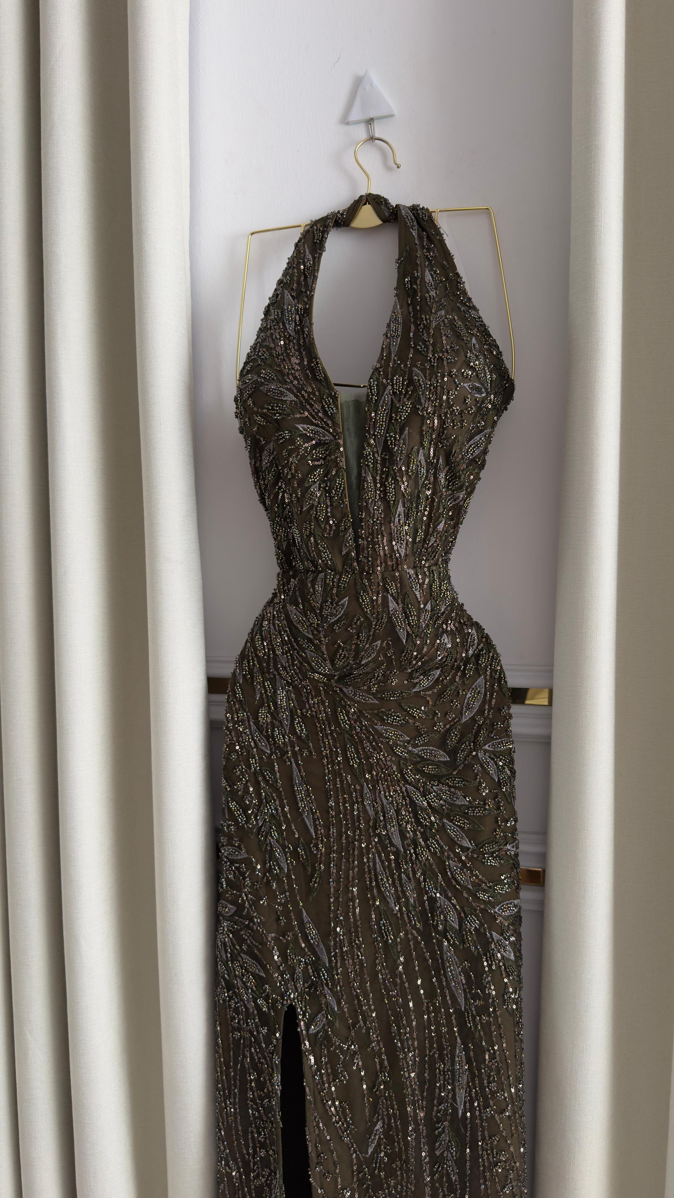 هذا الفستان الزيتوني الساحر يجمع بين الفخامة والجرأة في تصميم واحد. يتميز بياقة هالتر أنيقة مع قصة ضيقة تبرز جمال القوام وتضفي لمسة راقية تلفت الأنظار. التطريز اليدوي المتناثر بالترتر اللامع على كامل الفستان يضيف بريقًا فخمًا يتماوج مع الحركة والإضاءة، فيما يمنح الشق الأمامي لمسة أنثوية جريئة توازن بين الكلاسيكية والعصرية.
