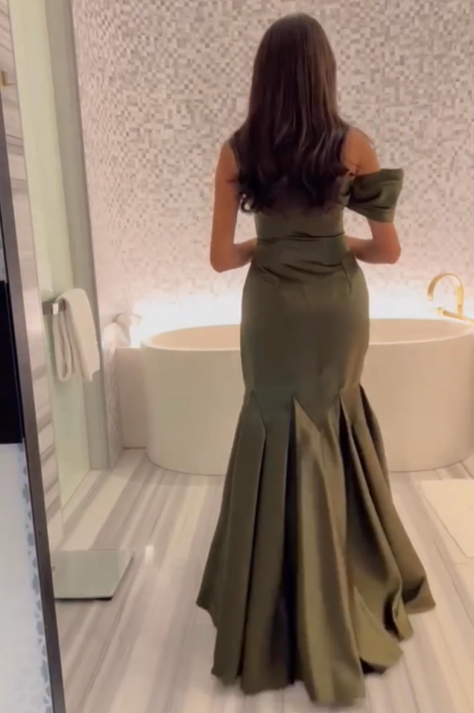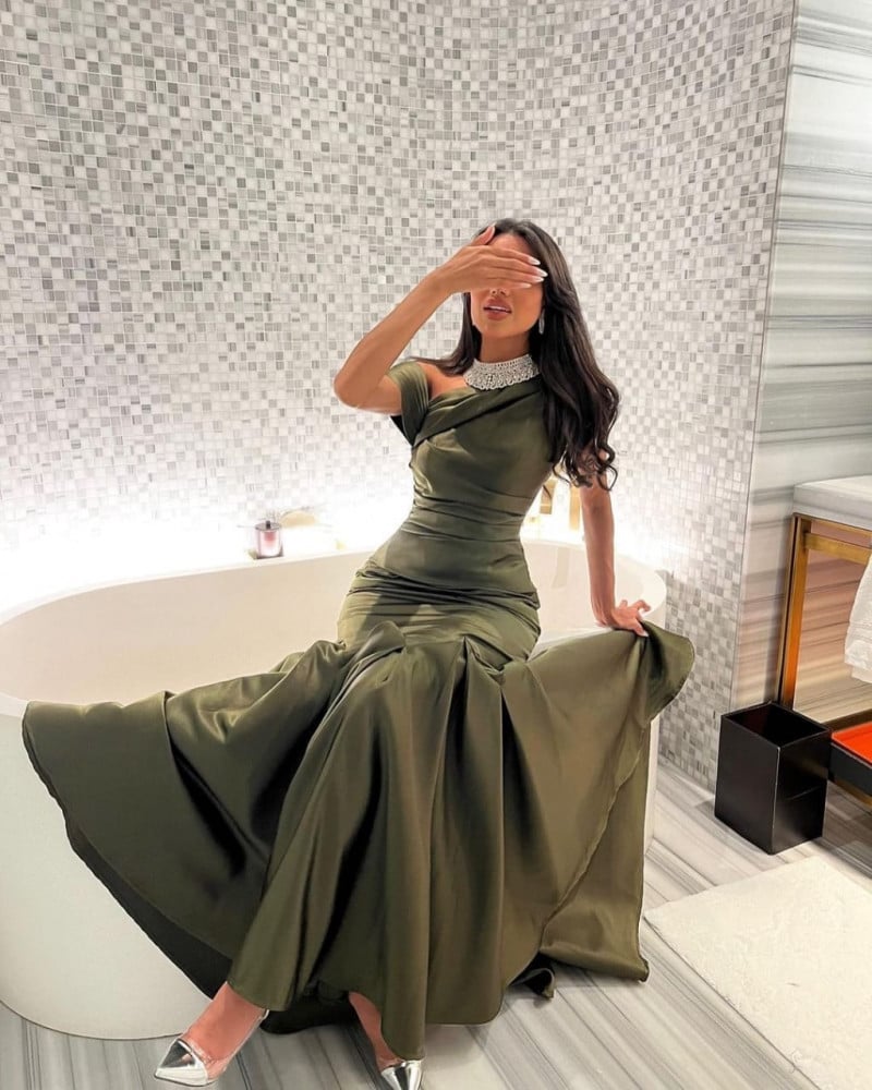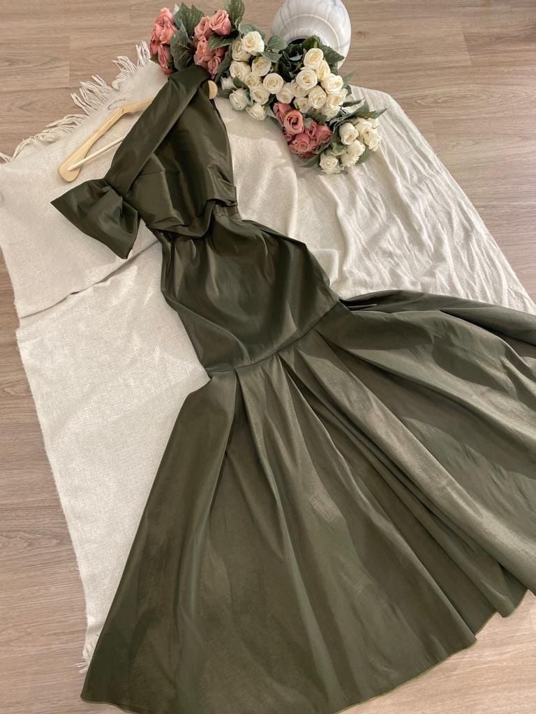 هذا الفستان الزيتي الساحر يجمع بين البساطة الملكية واللمسة العصرية في تصميم واحد. يتميز بقصة ضيقة بكتف واحد تعانق القوام وتبرز أنوثتك بكل رقي. القماش الساتان الفاخر بلمعانه الحريري يضفي بريقًا ناعمًا، بينما الطيات الأنيقة تمنح التصميم عمقًا وانسيابية تضيف لمسة فاخرة. التنورة الطويلة المتدفقة تعزز حضورك وتمنحك إطلالة فخمة تخطف الأنظار في كل مناسبة.