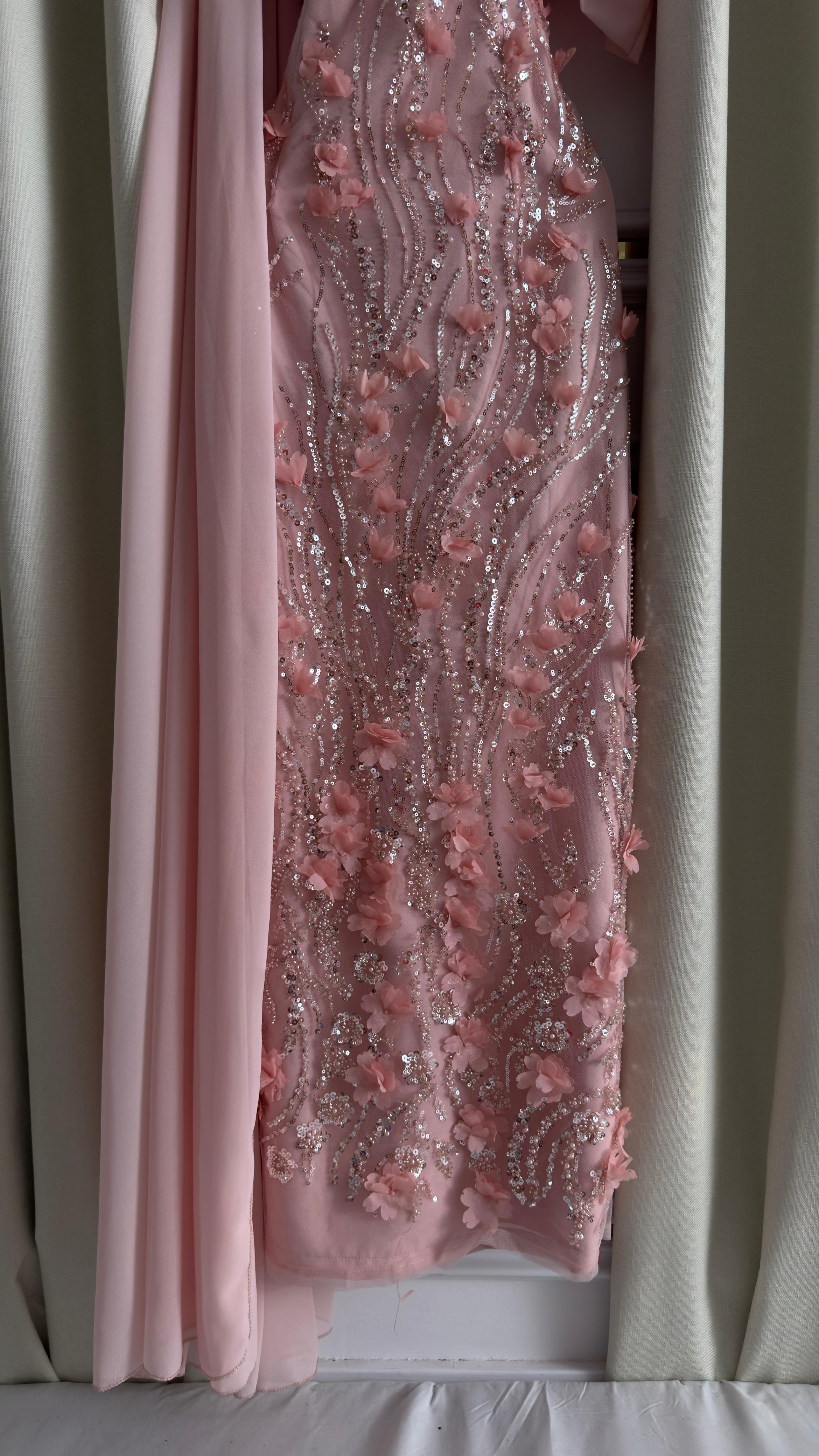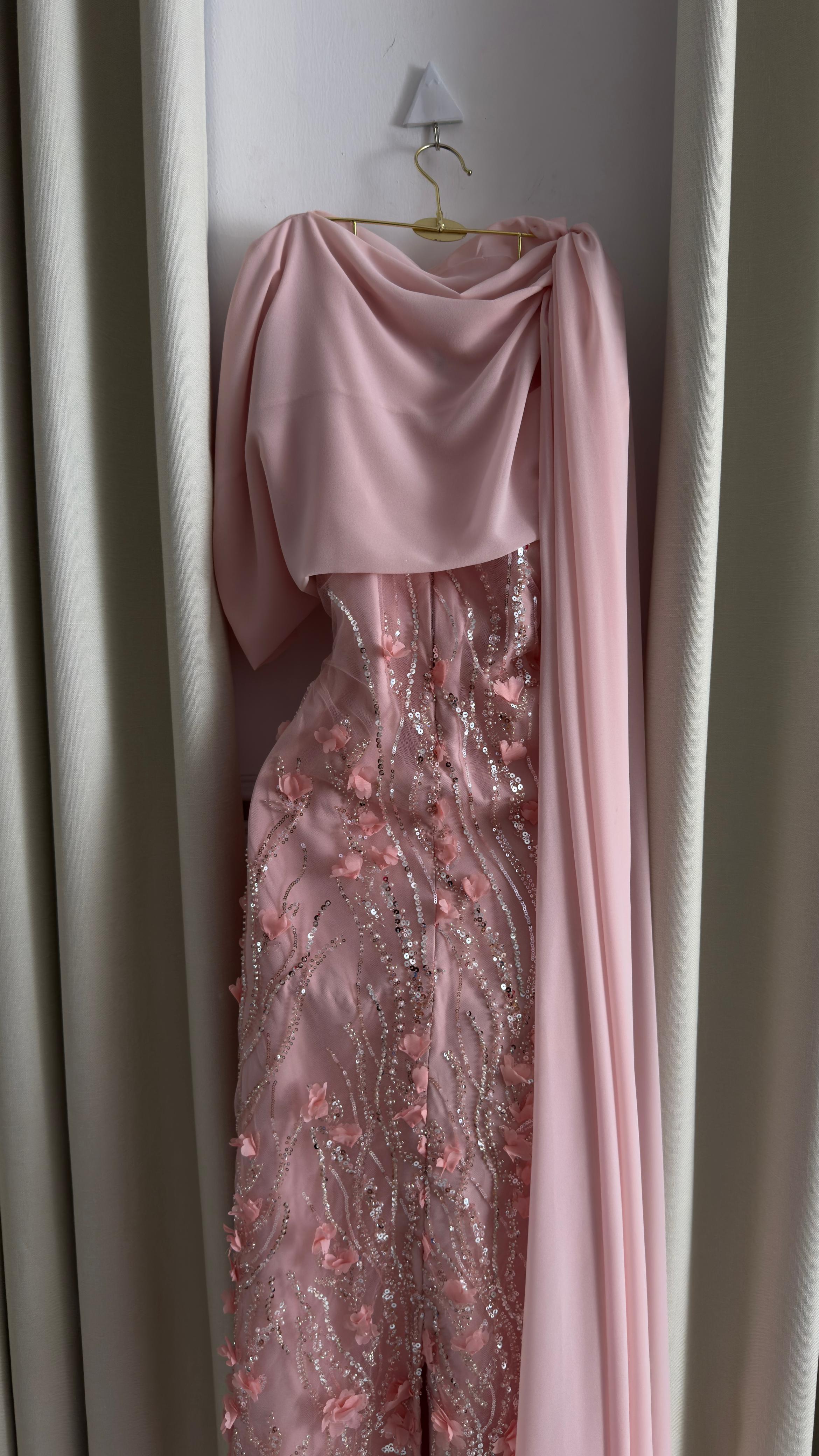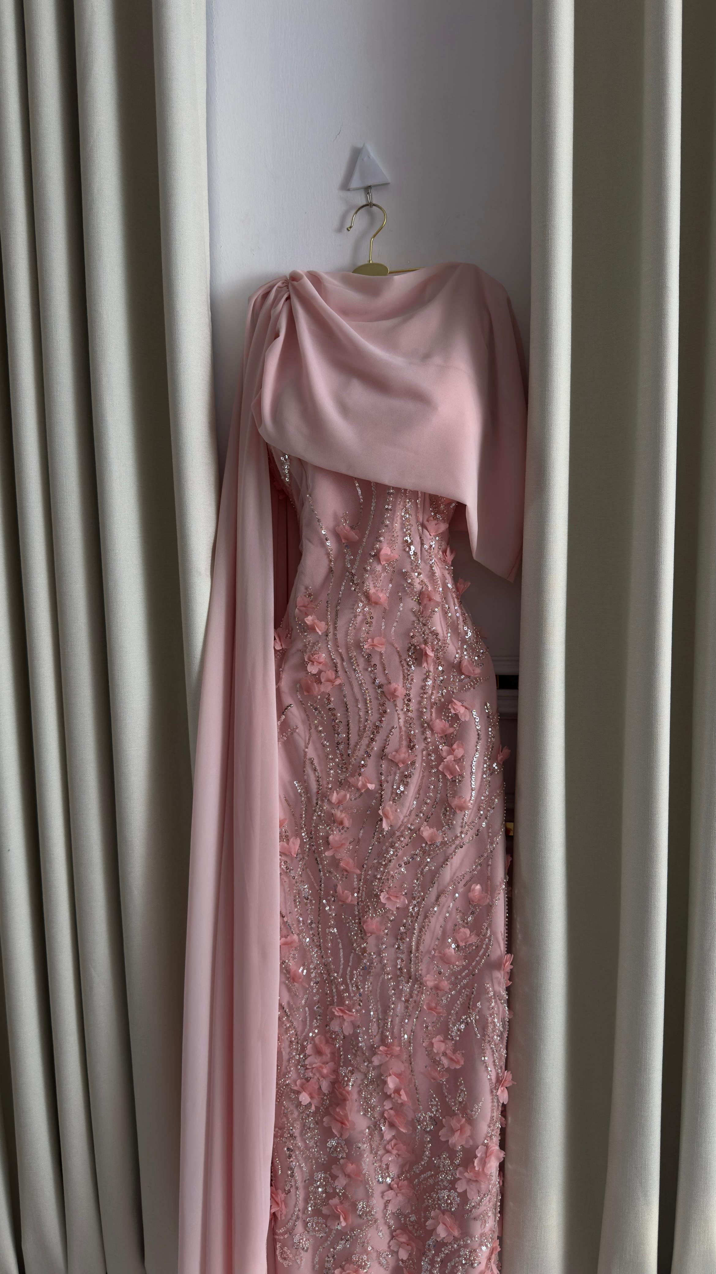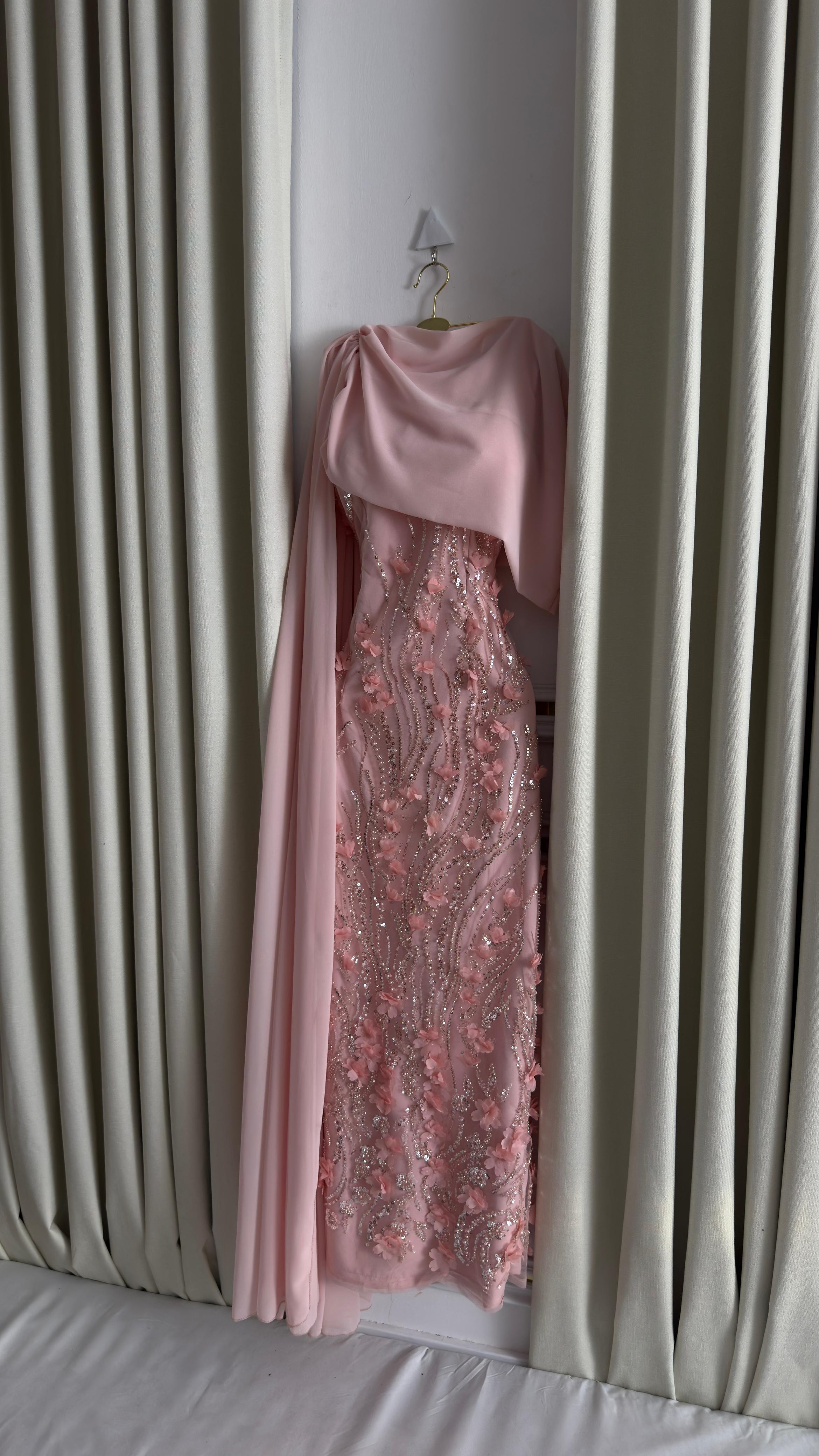 بتصميم ضيّق يبرز القوام برقة، وتطريز يدوي متقن بخيوط لامعة وزهور ثلاثية الأبعاد تضيف عمقًا وأناقة آسرة.