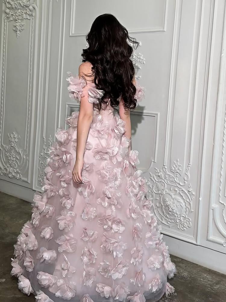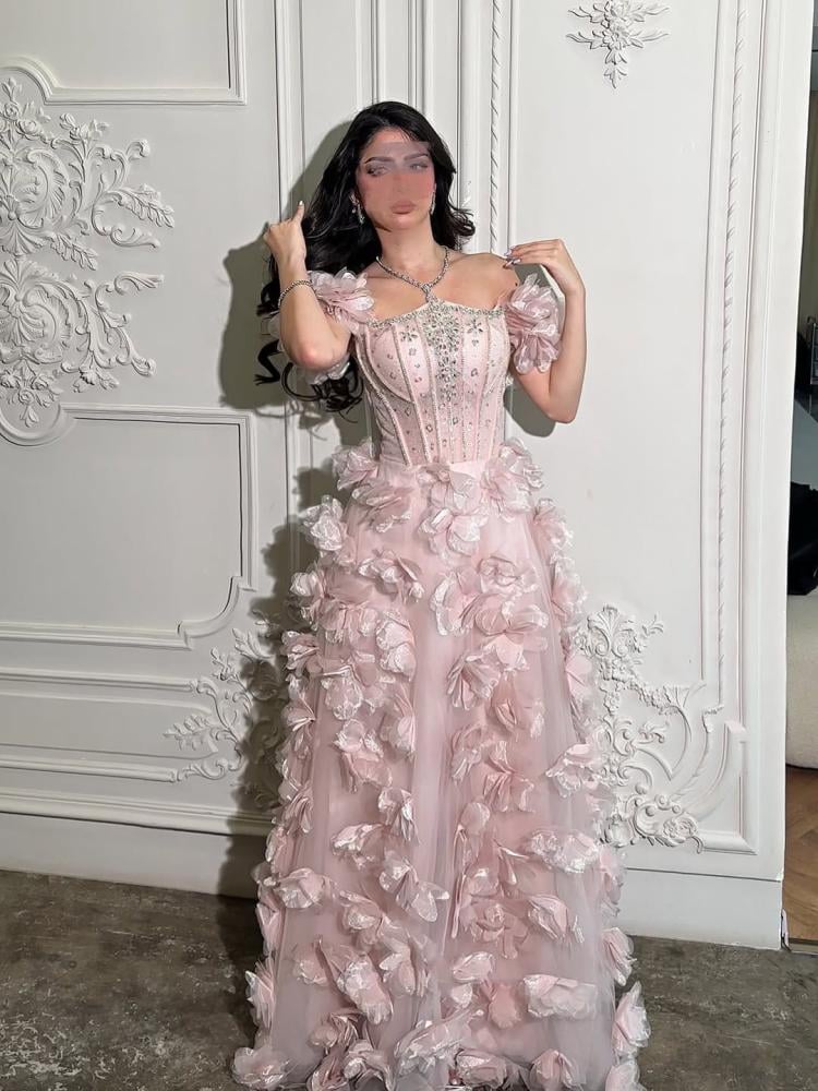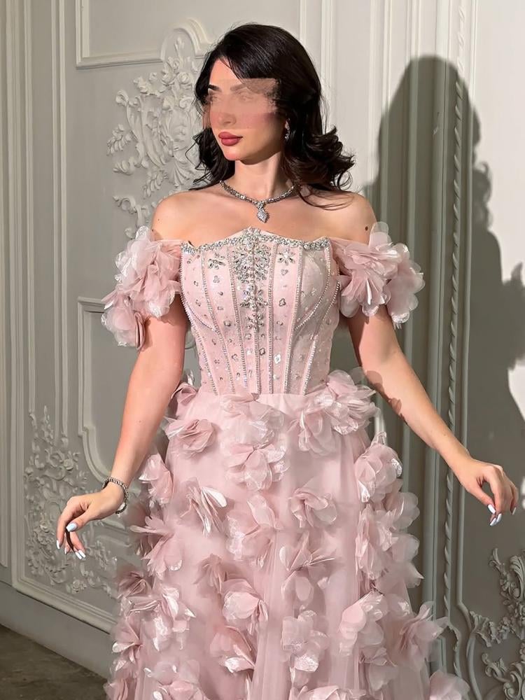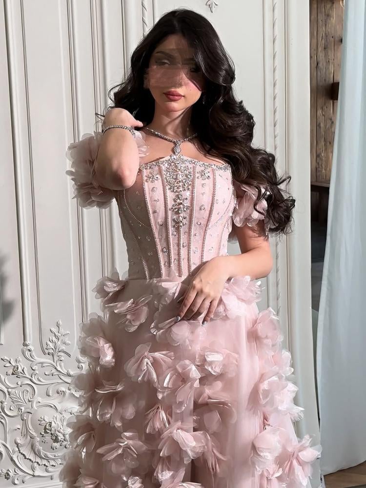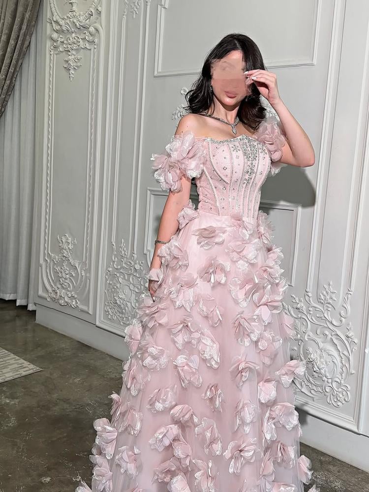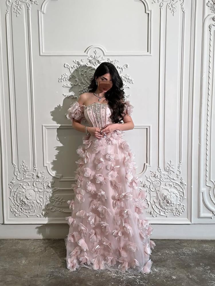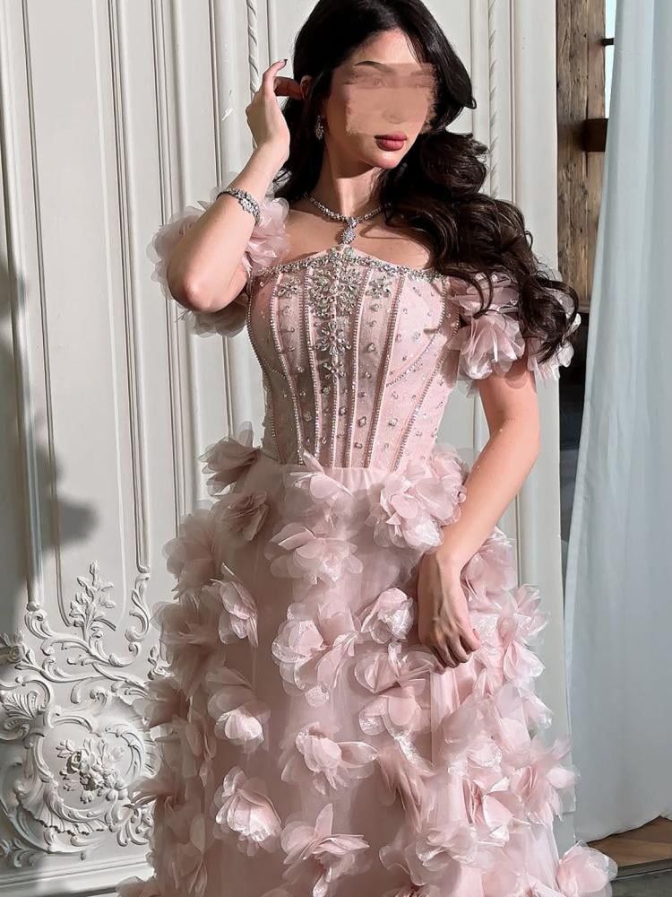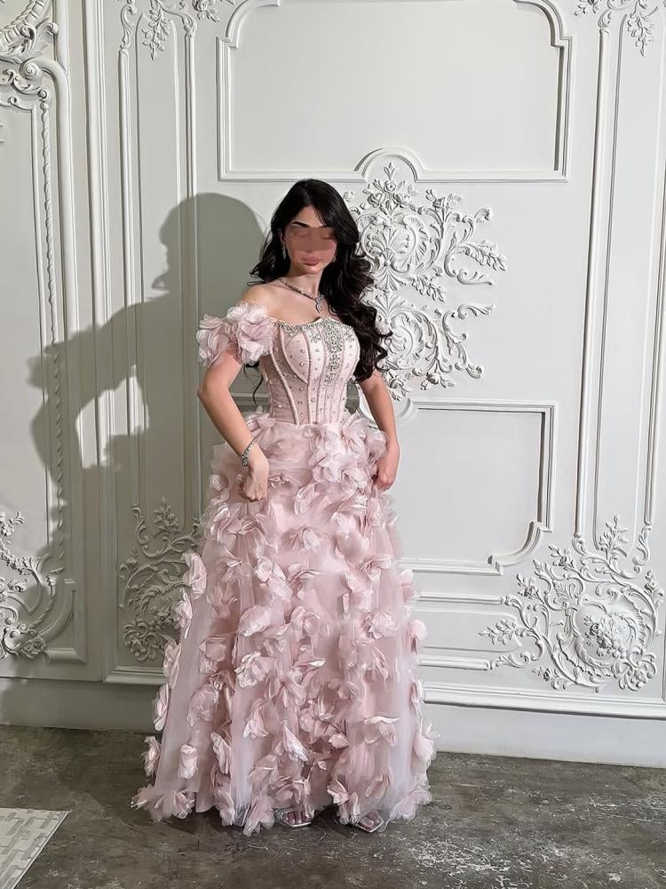 الجزء العلوي كورسيه مطرّز يعطي حضور قوي يشد الخصر ويبرز القوام، بينما الزهور ثلاثية الأبعاد المنتشرة على كامل الفستان تتحرك بتناغم مع كل خطوة وتمنحك إطلالة ملكية لامعة بدون أي مبالغة.