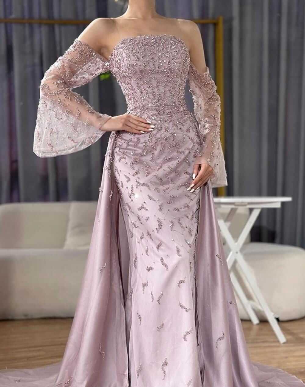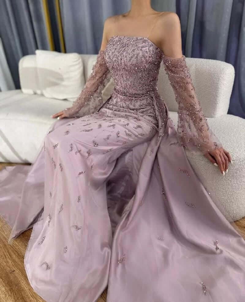 يأتي الفستان بأكمام تول شفافة مطرزة برقي، تلتف حول الذراعين بانسيابية، وتضفي لمسة ساحرة وناعمة. القصة من الأعلى بدون حمالات “سترابلس” تعزز من جمال الرقبة والأكتاف.