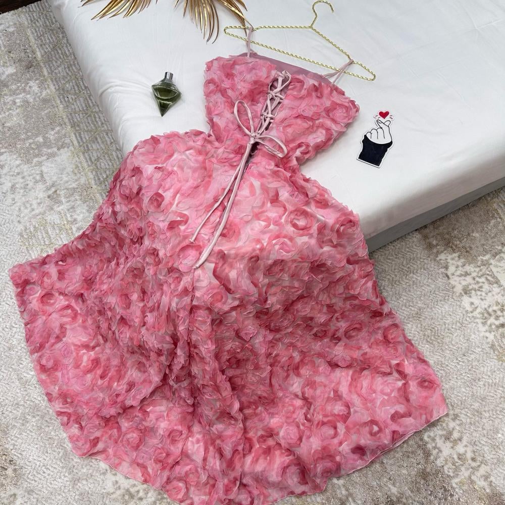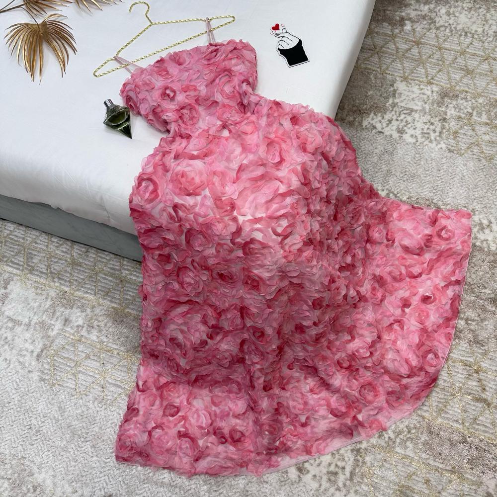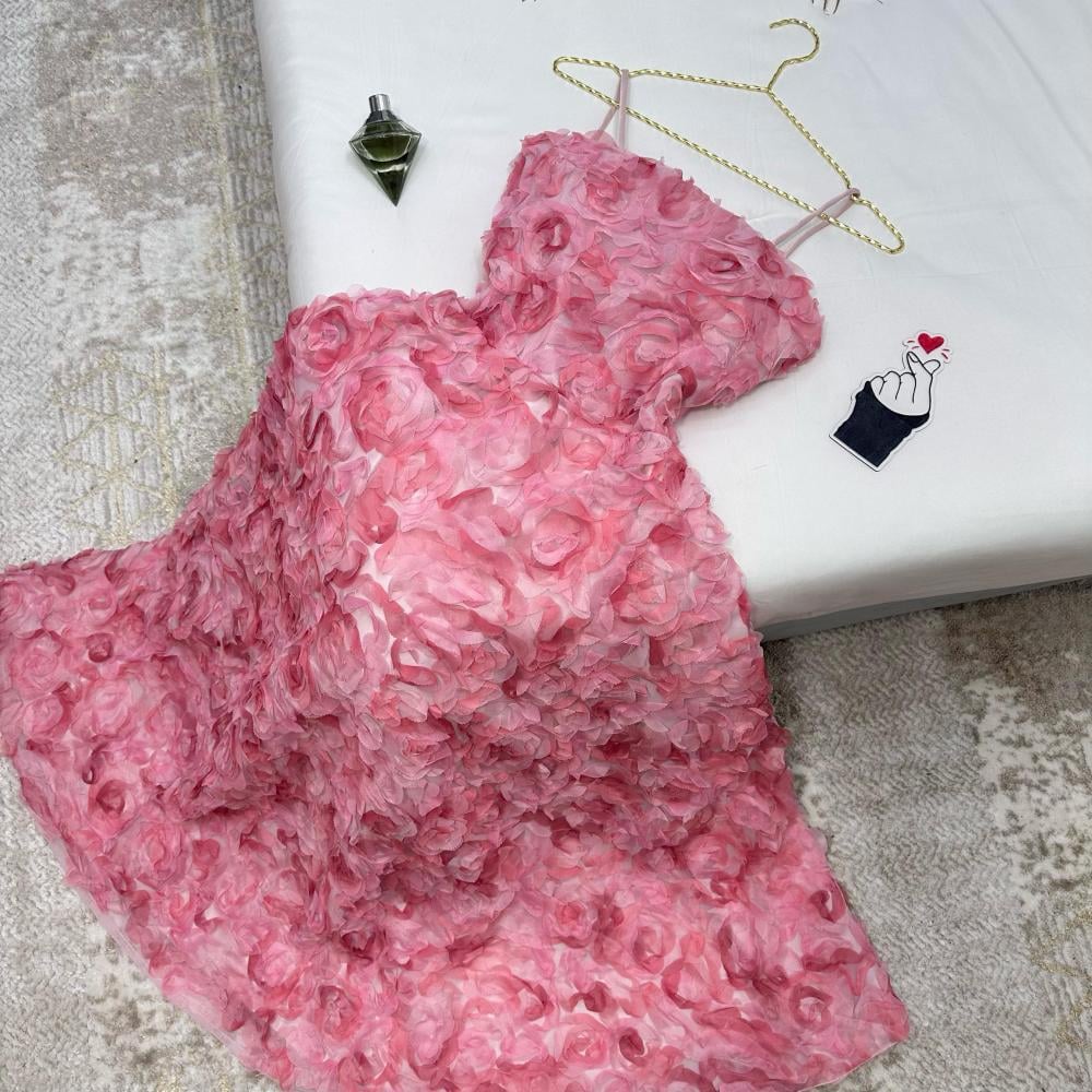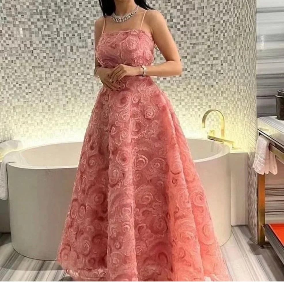 فستان سهرة وردي منفوش بملمس وردي بارز يوحي بكأنه حديقة من الورود المتفتّحة.