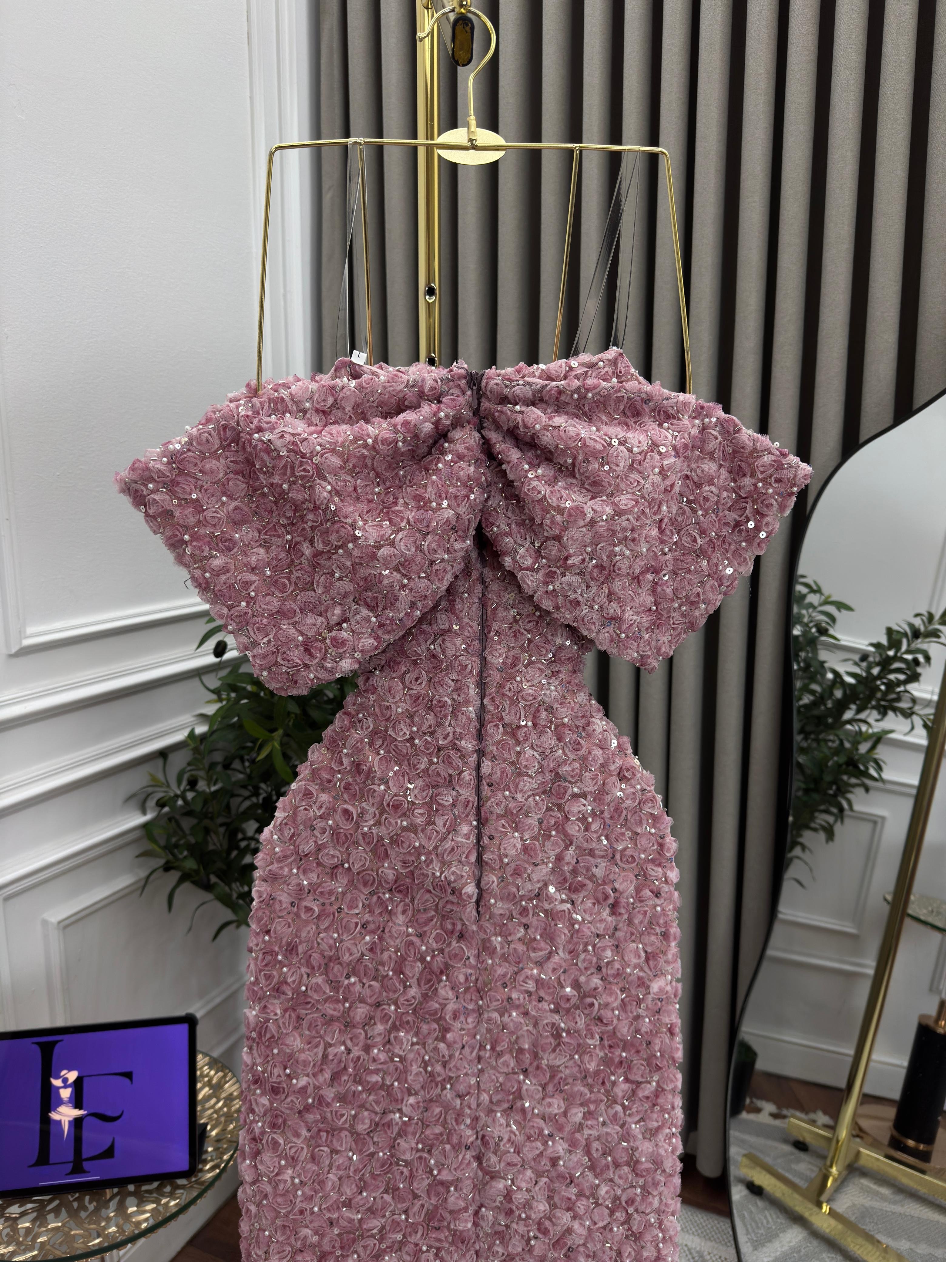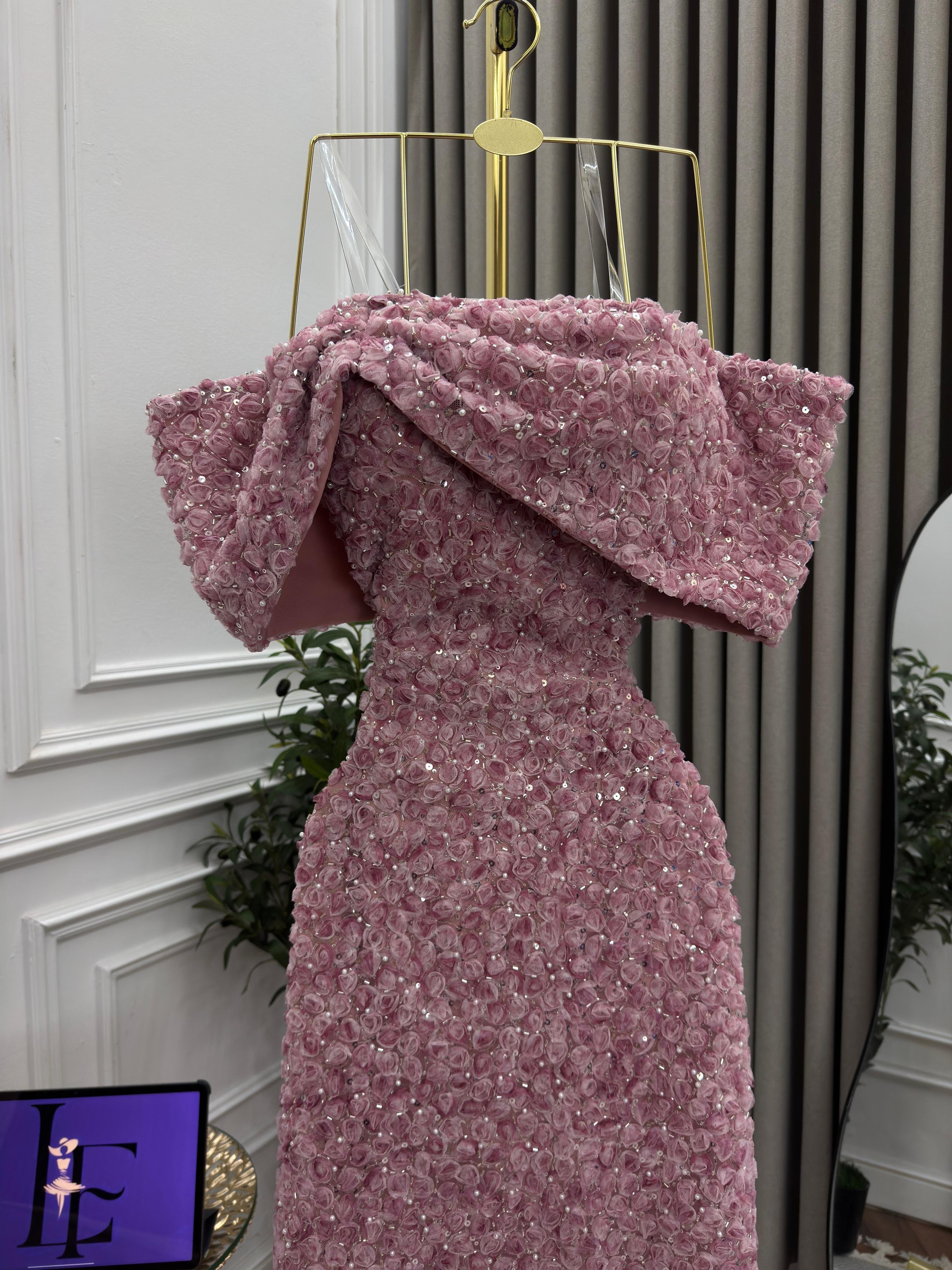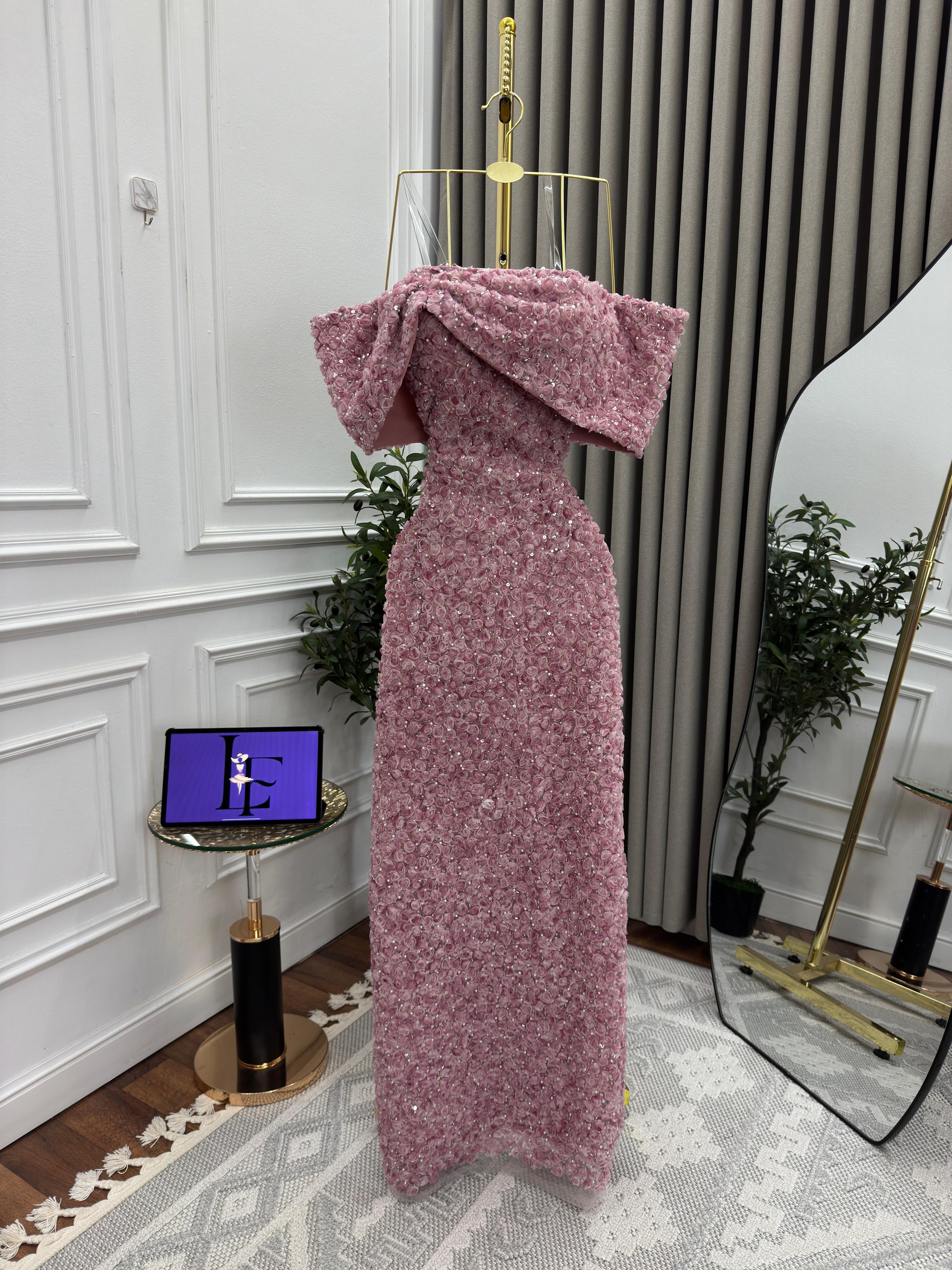 فستان سهرة وردي ساحر مطرّز بالكامل بتفاصيل ثلاثية الأبعاد تضيف عمقًا ولمعة تحاكي بريق السهرة.
