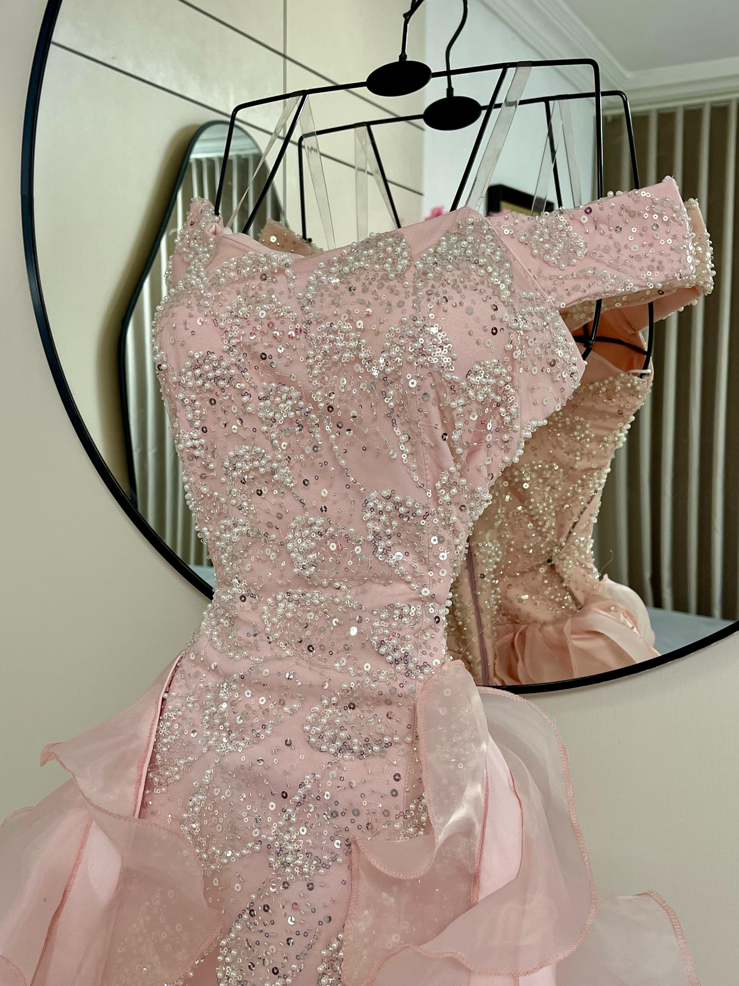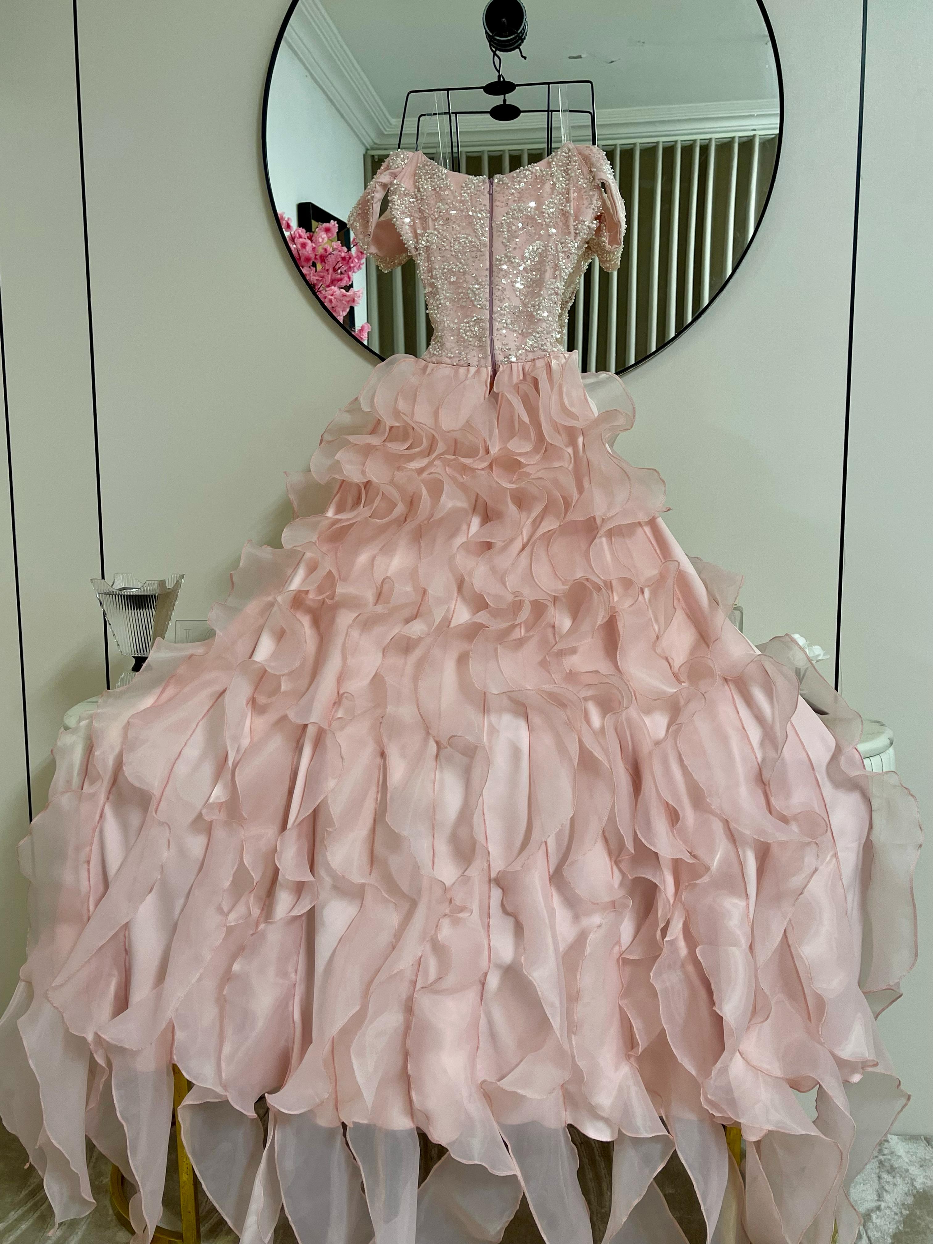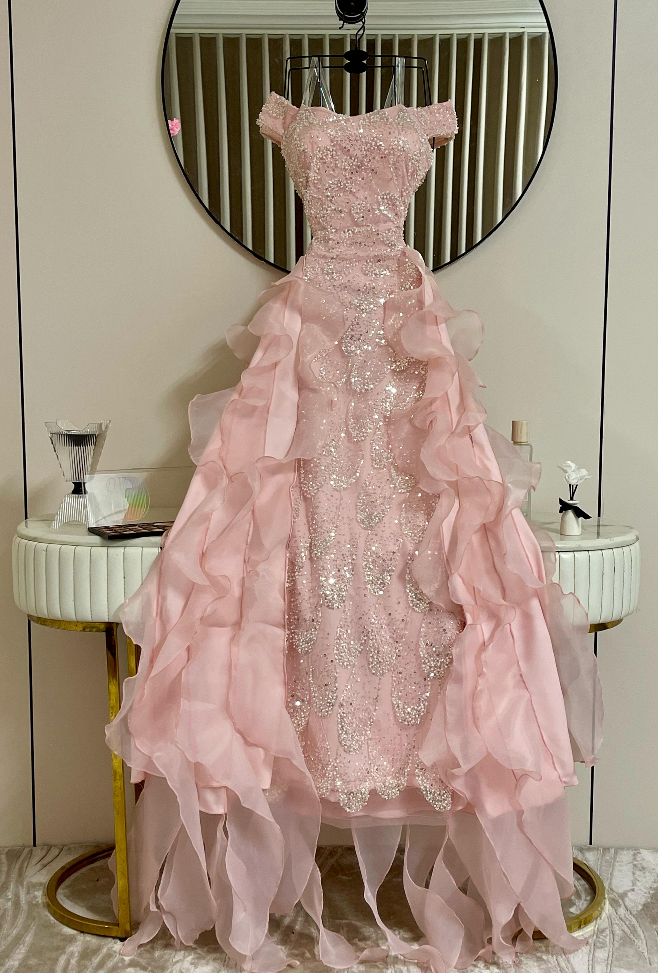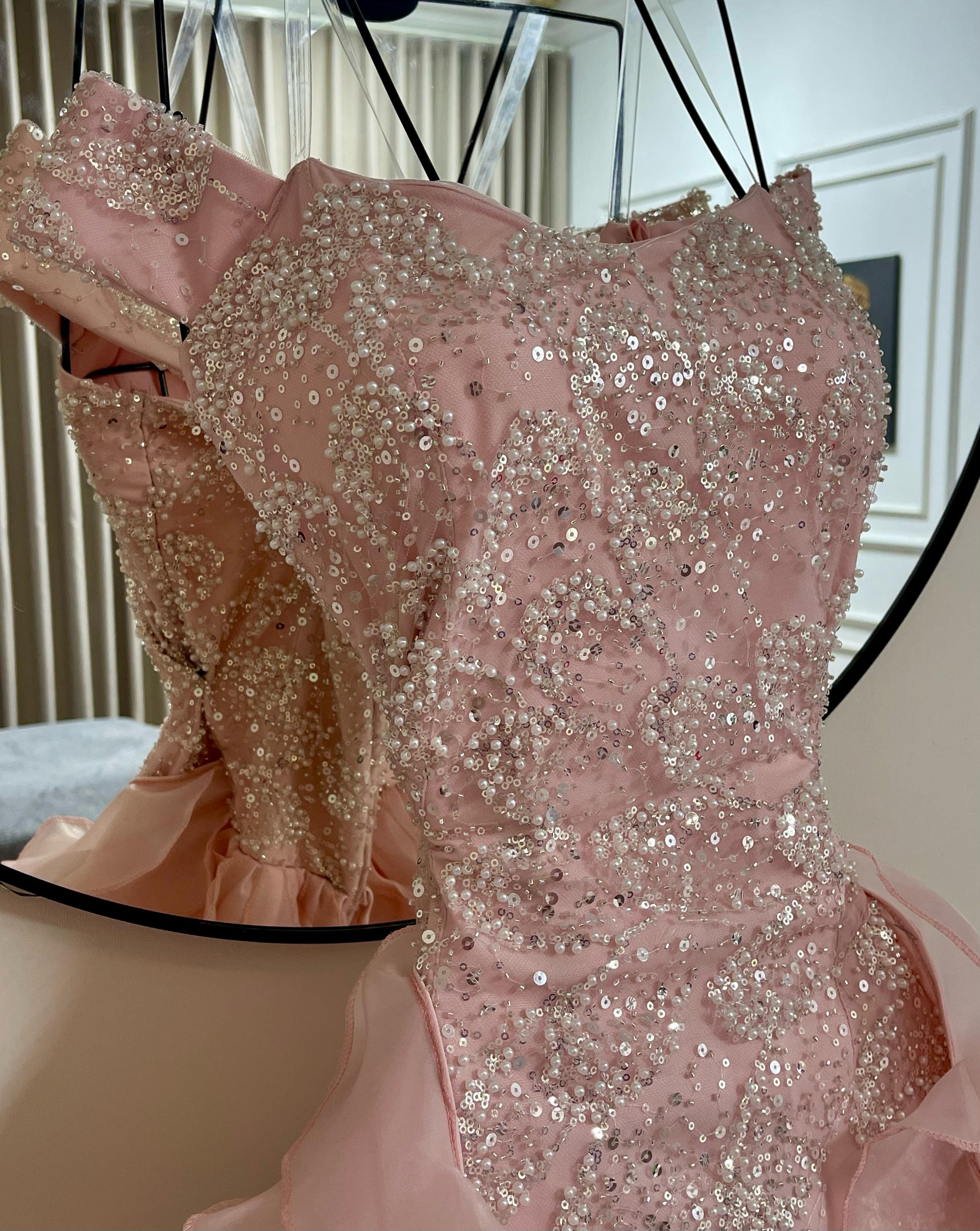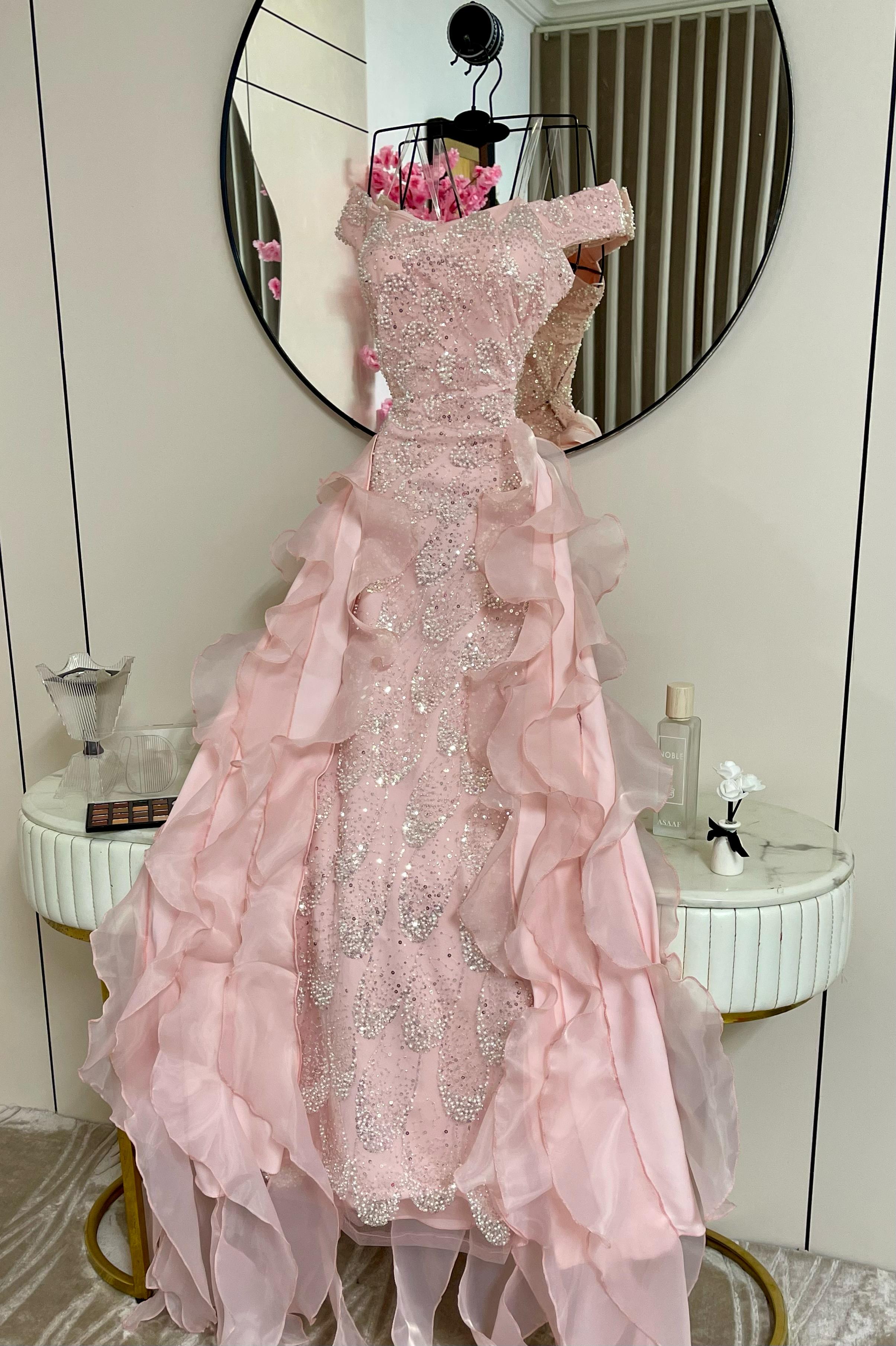 الصدر مطرز بالكامل بتفاصيل براقة تخطف الضوء، بينما تتدرج طبقات الشيفون الخفيفة بشكل انسيابي يخلق حركة dreamy تمشي مثل أمواج وردية ناعمة.