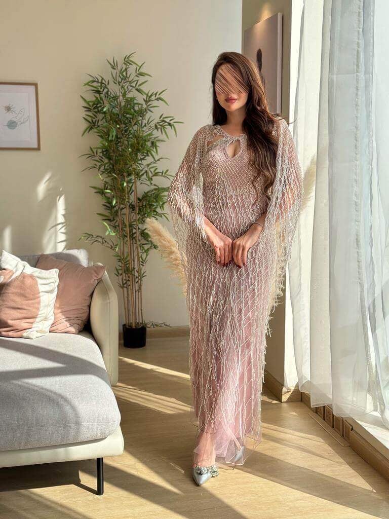 تألقي بإطلالة استثنائية مع هذا الفستان الوردي الناعم بتصميم شبكي لامع يضفي لمسة عصرية فاخرة. يتميز بقصة جذابة مع أكمام منسدلة على شكل كاب أنيق يمنحك حضورًا راقيًا. للإطلالة المثالية، نسّقيه مع سوار فضي رقيق وأقراط متدلية براقة، مع حقيبة كلاتش صغيرة باللون المعدني. اكتمل اللوك بحذاء كعب عالي فضي لمزيد من الفخامة، مع مكياج نيود طبيعي بلمسة هايلايتر، وتسريحة شعر ويفي منسدل تمنحك جاذبية أنثوية متكاملة تناسب السهرات والمناسبات الراقية