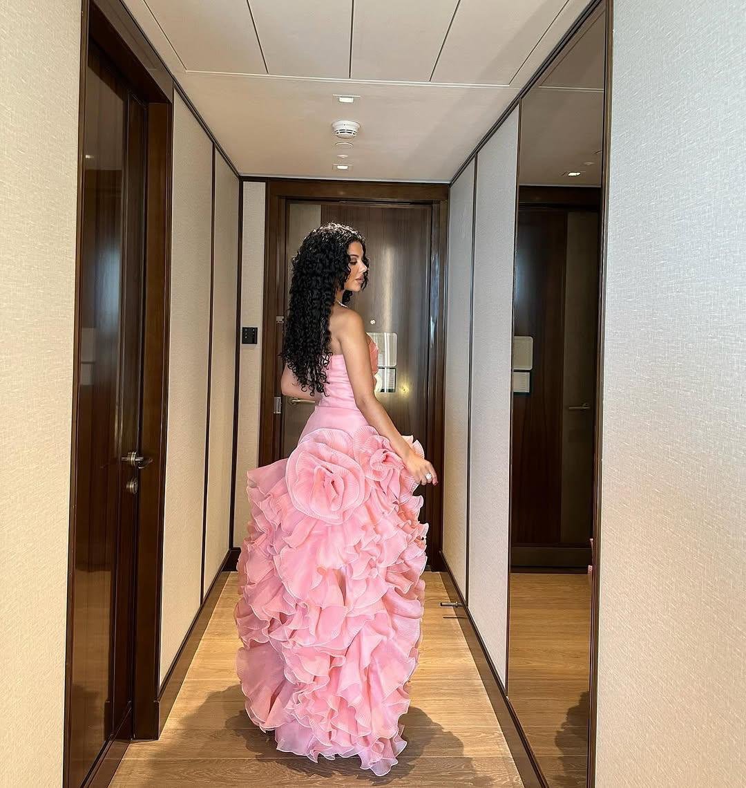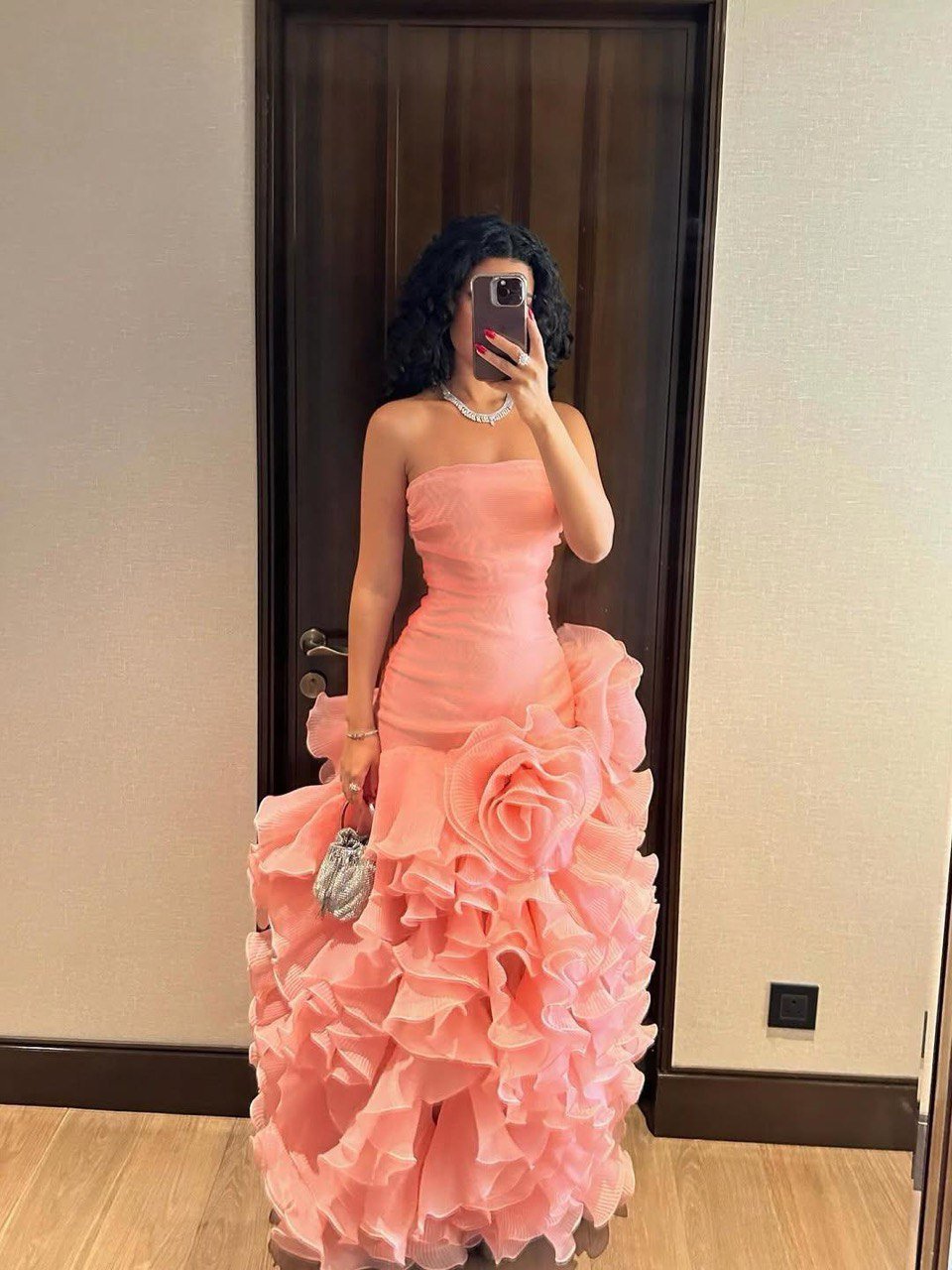 فستان سهرة أنثوي فاخر باللون الوردي الناعم، بتصميم سترابلس يبرز جمال الأكتاف والرقبة، مع طبقات كرانيش منفوشة تمنح إطلالة أميرية حالمة. ينسدل الفستان بحركة انسيابية ملفتة ليمنحك حضوراً راقياً يخطف الأنظار في المناسبات الخاصة والسهرات الفاخرة.