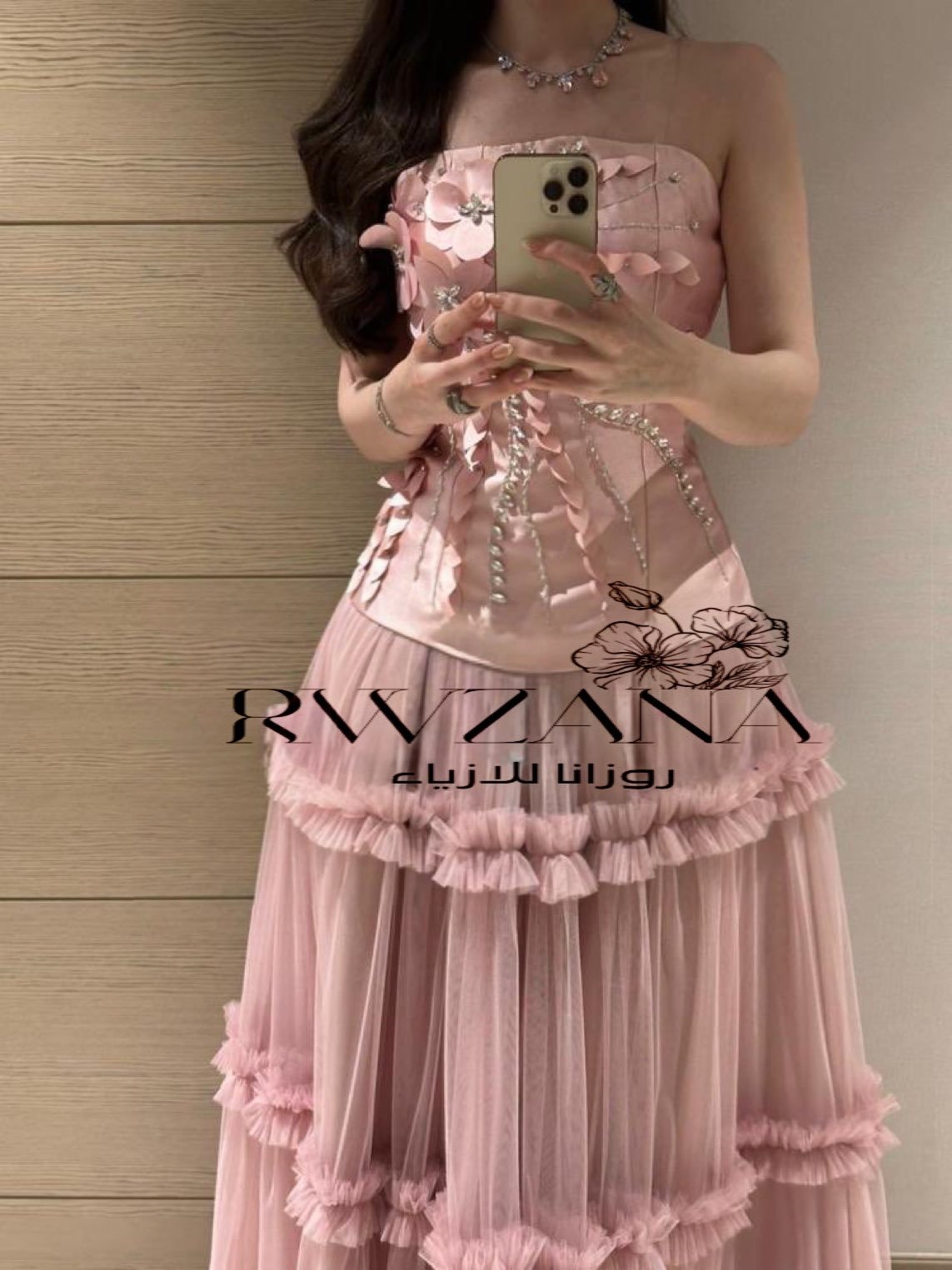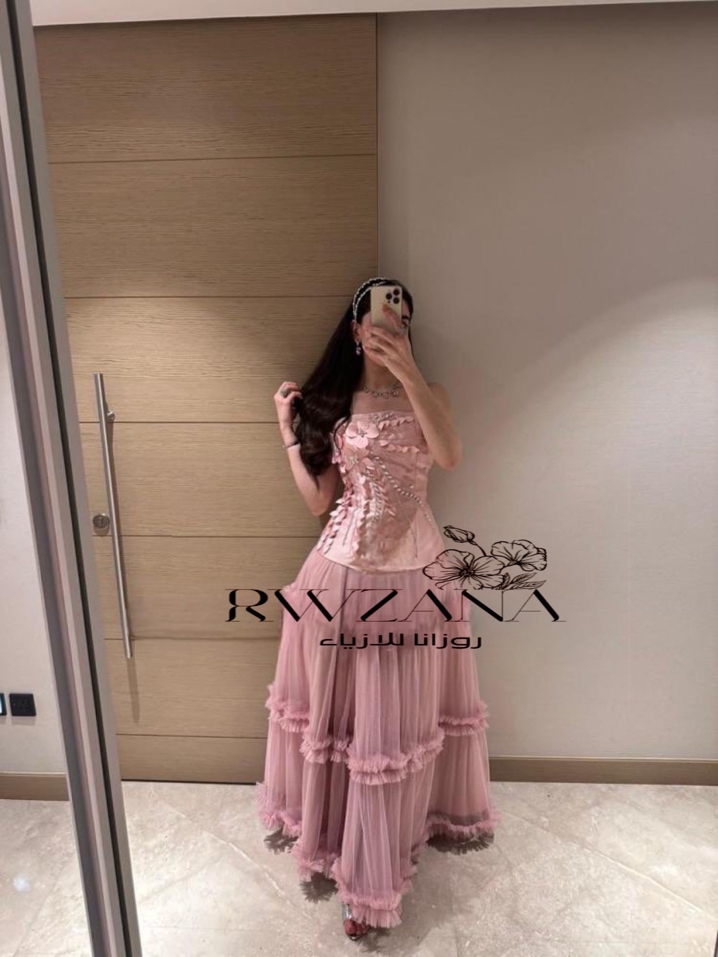 ينسّق مع تاج لؤلؤي أو إكسسوارات فضية ناعمة، مع حقيبة صغيرة باللون الوردي الفاتح أو الشفاف.