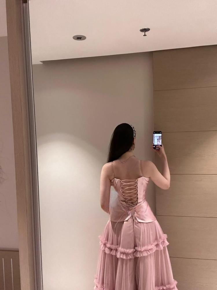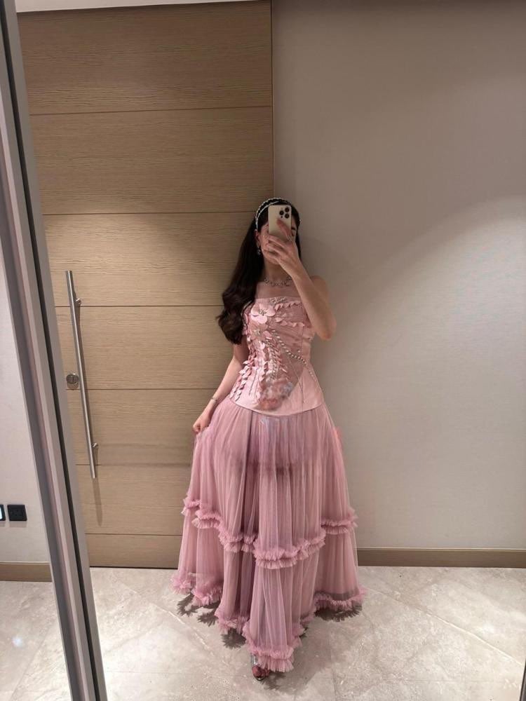 فستان تول وردي مستوحى من قصص الأميرات، يجمع بين الرقة والفخامة في كل تفصيلة.