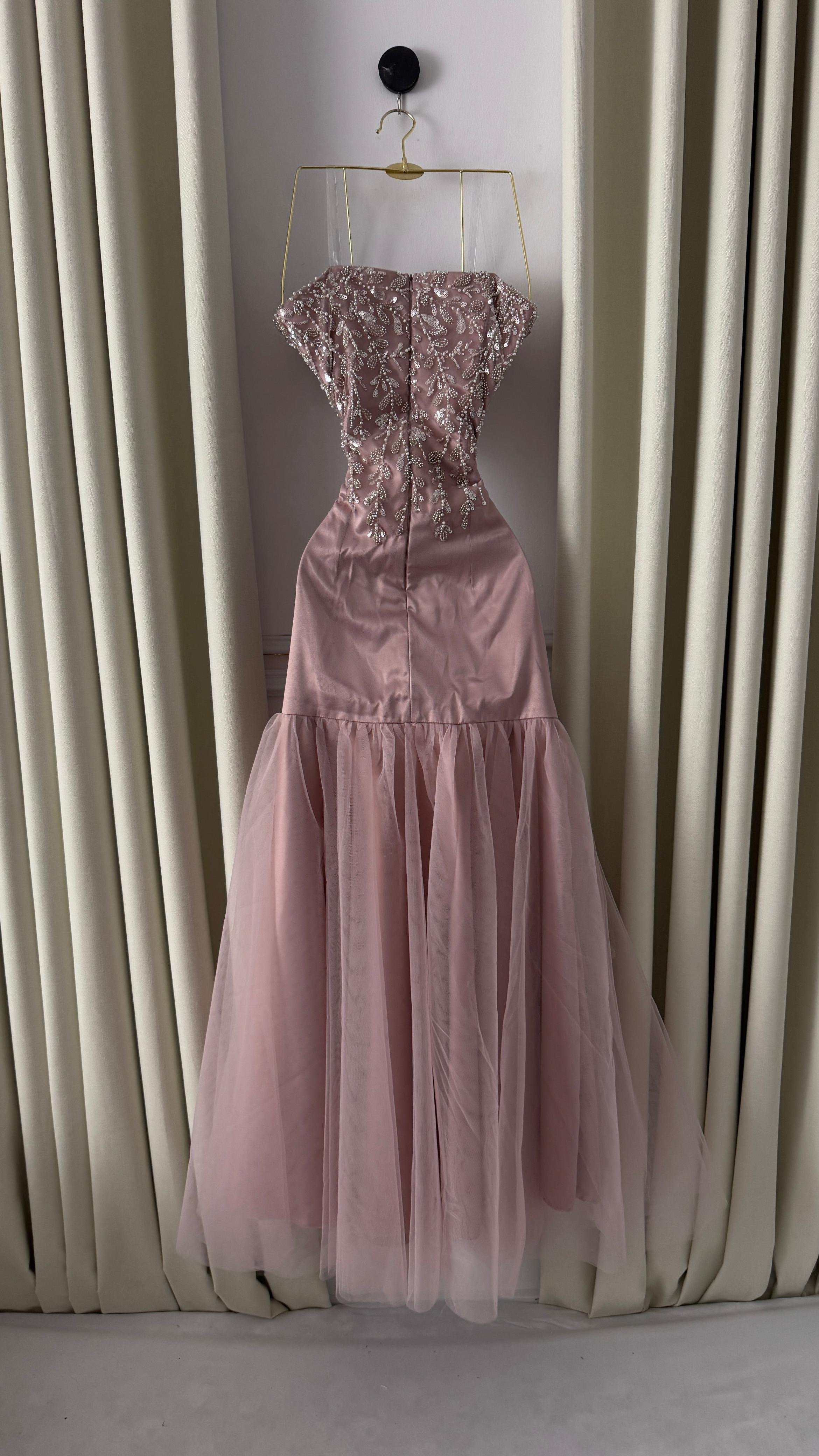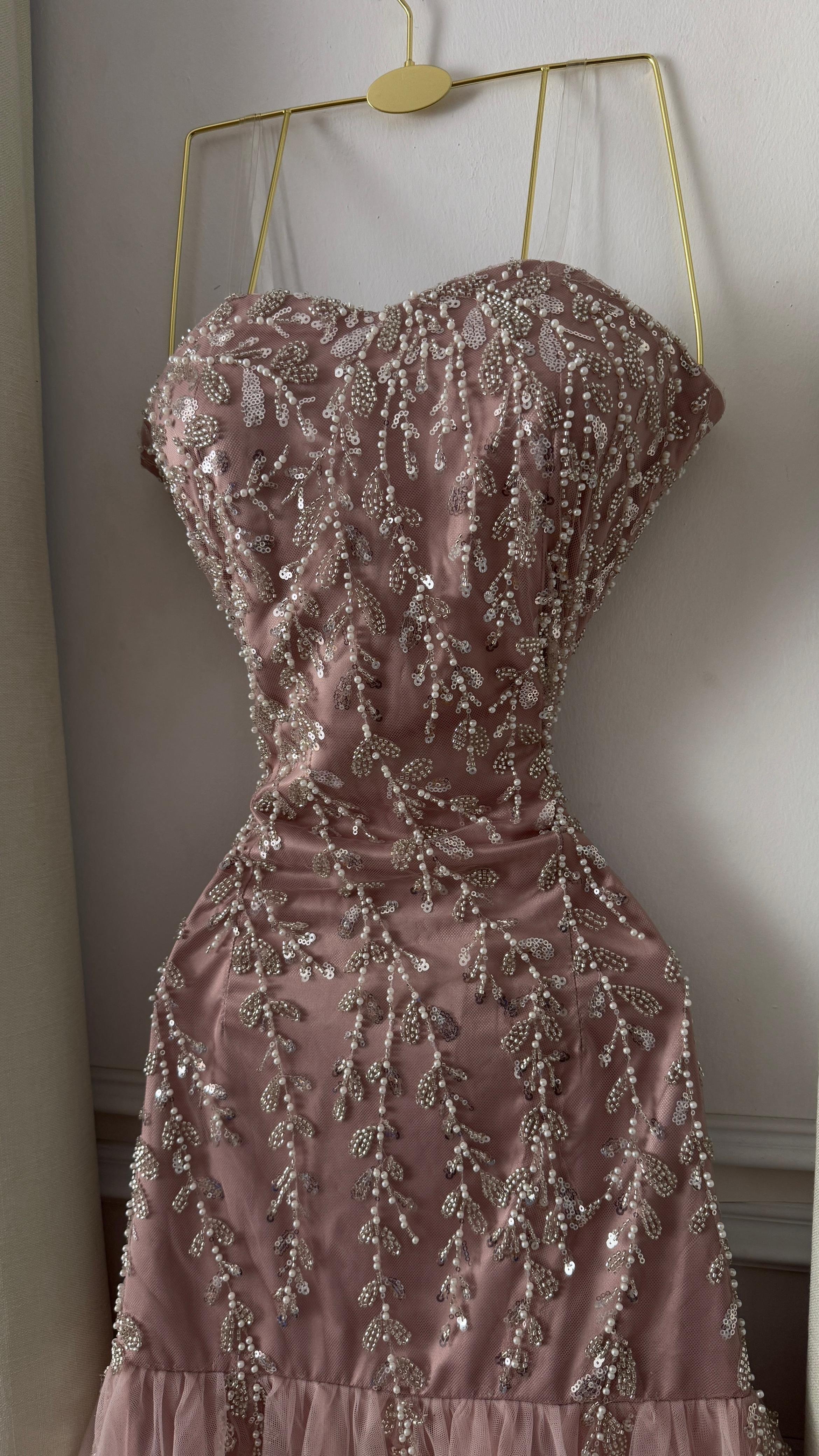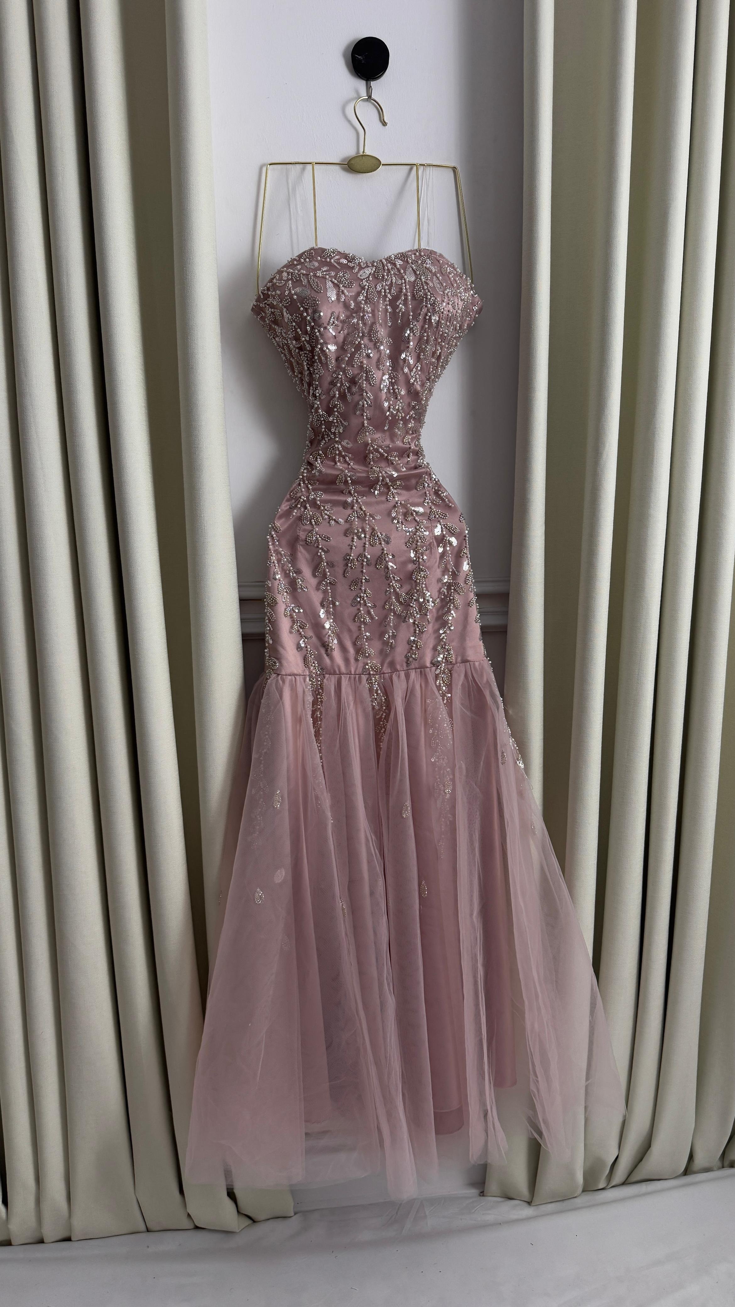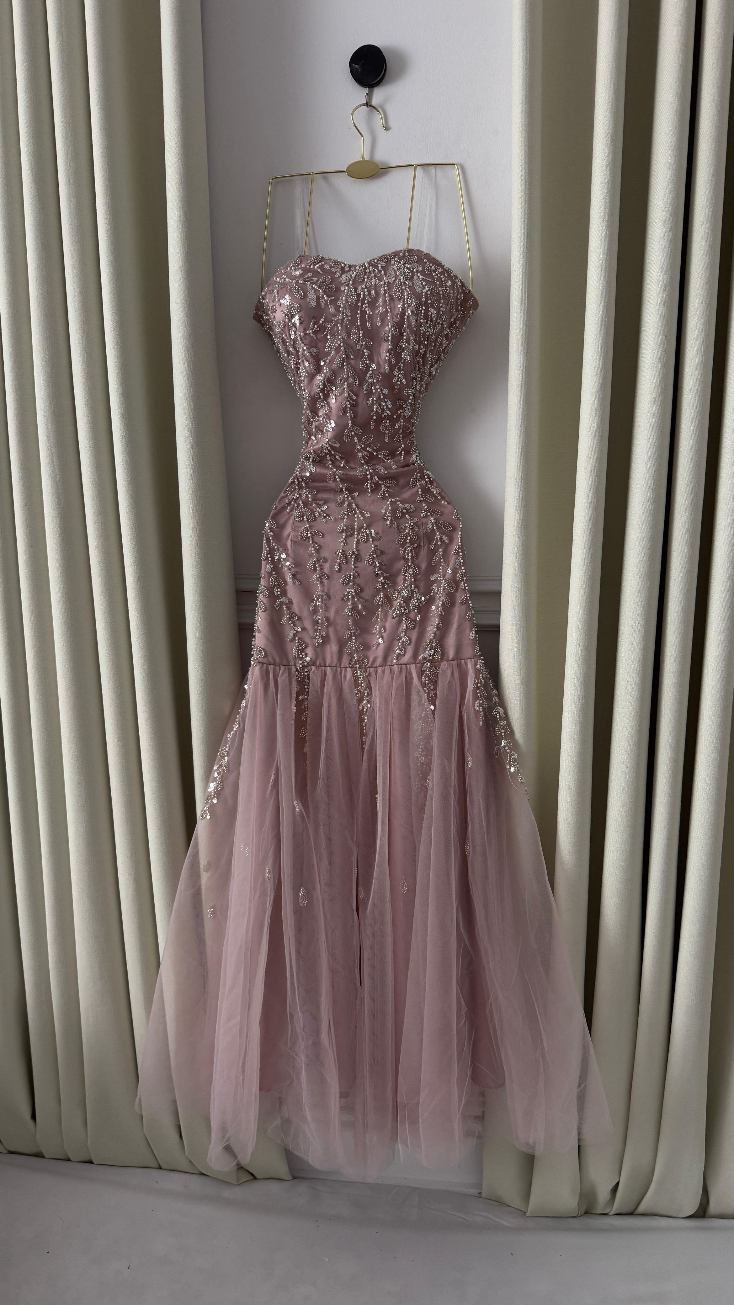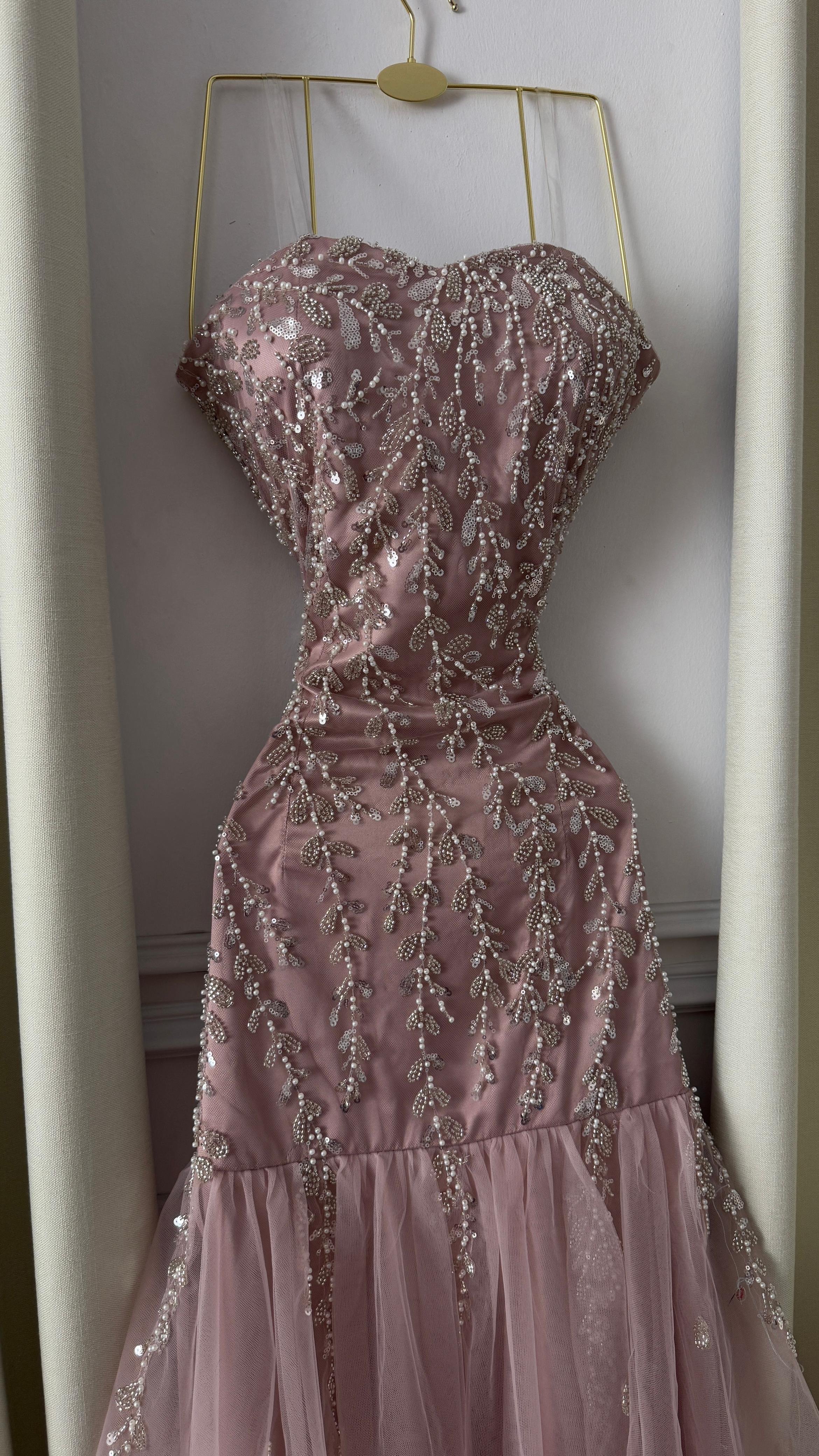 فستان سهرة وردي رومانسي يجمع بين الأناقة والنعومة، بتصميم مطرز يدوياً بالكريستال والخرز المتلألئ على الصدر والخصر. يتميز بتنورة تول منسدلة تضيف لمسة أنثوية حالمة وانسيابية ساحرة. مثالي لحفلات الزفاف، الخطوبة والمناسبات التي تتطلب حضوراً أنيقاً وجذاباً.