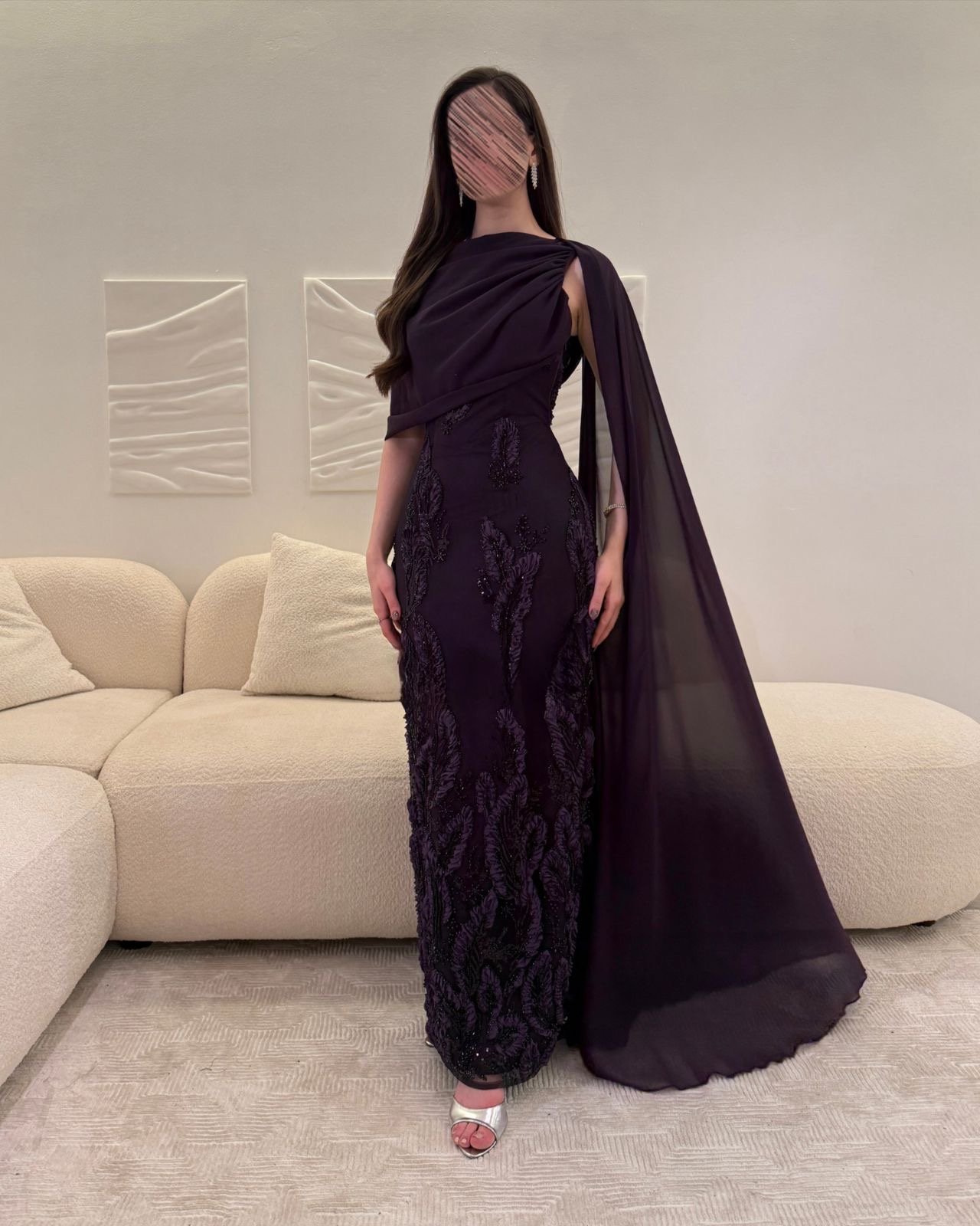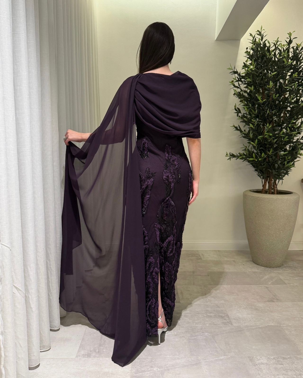 فستان سهرة بنفسجي ملكي بتصميم أنيق مطرز يدويًا برسومات فاخرة، مزوّد بشال شيفون انسيابي ينسدل على الكتف ليضفي لمسة ملكية على حضورك. قصّة الفستان مستقيمة تحدد الخصر وتمنحك قوامًا ممشوقًا. مثالي لحفلات المساء والمناسبات الفاخرة.
