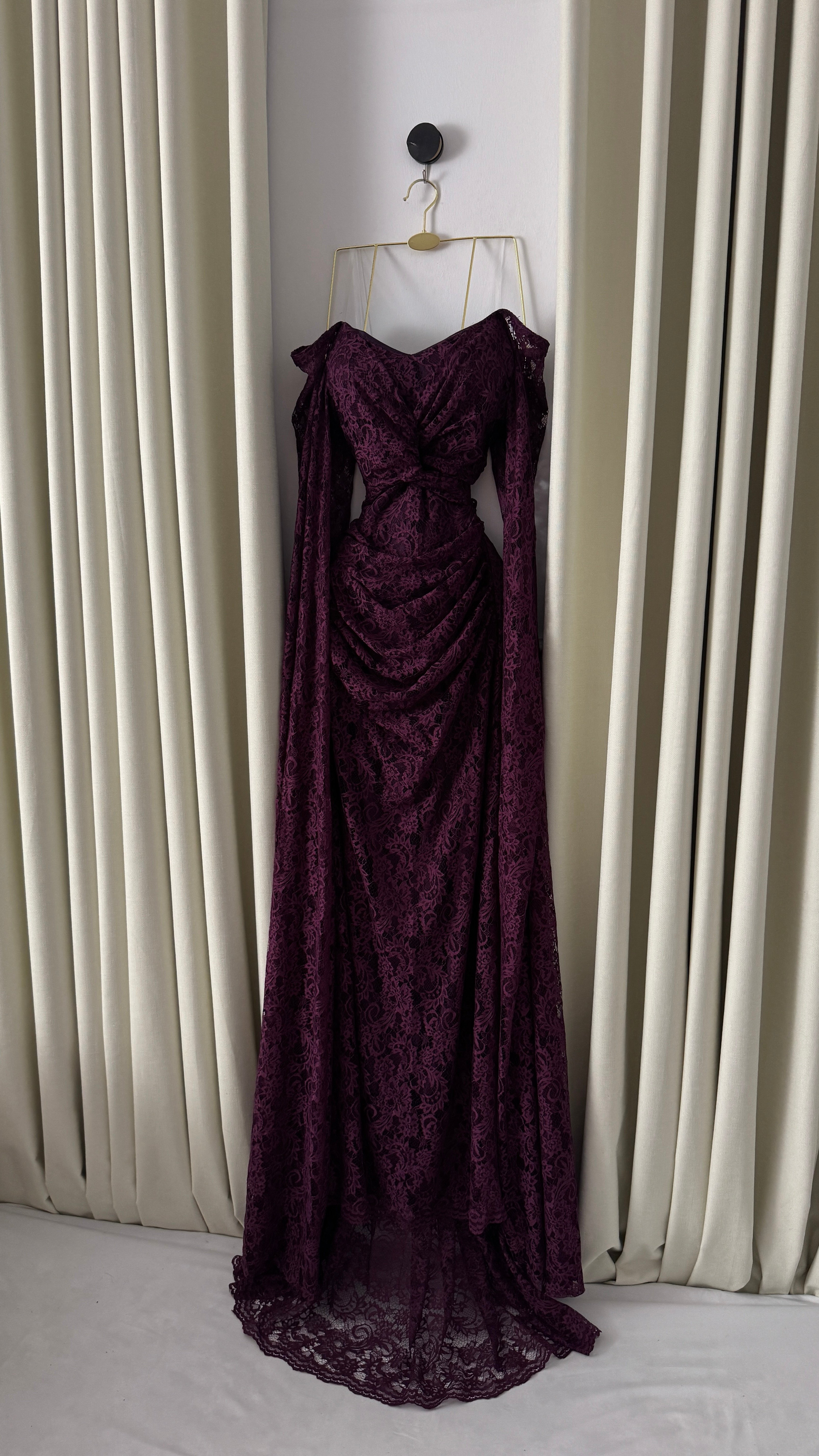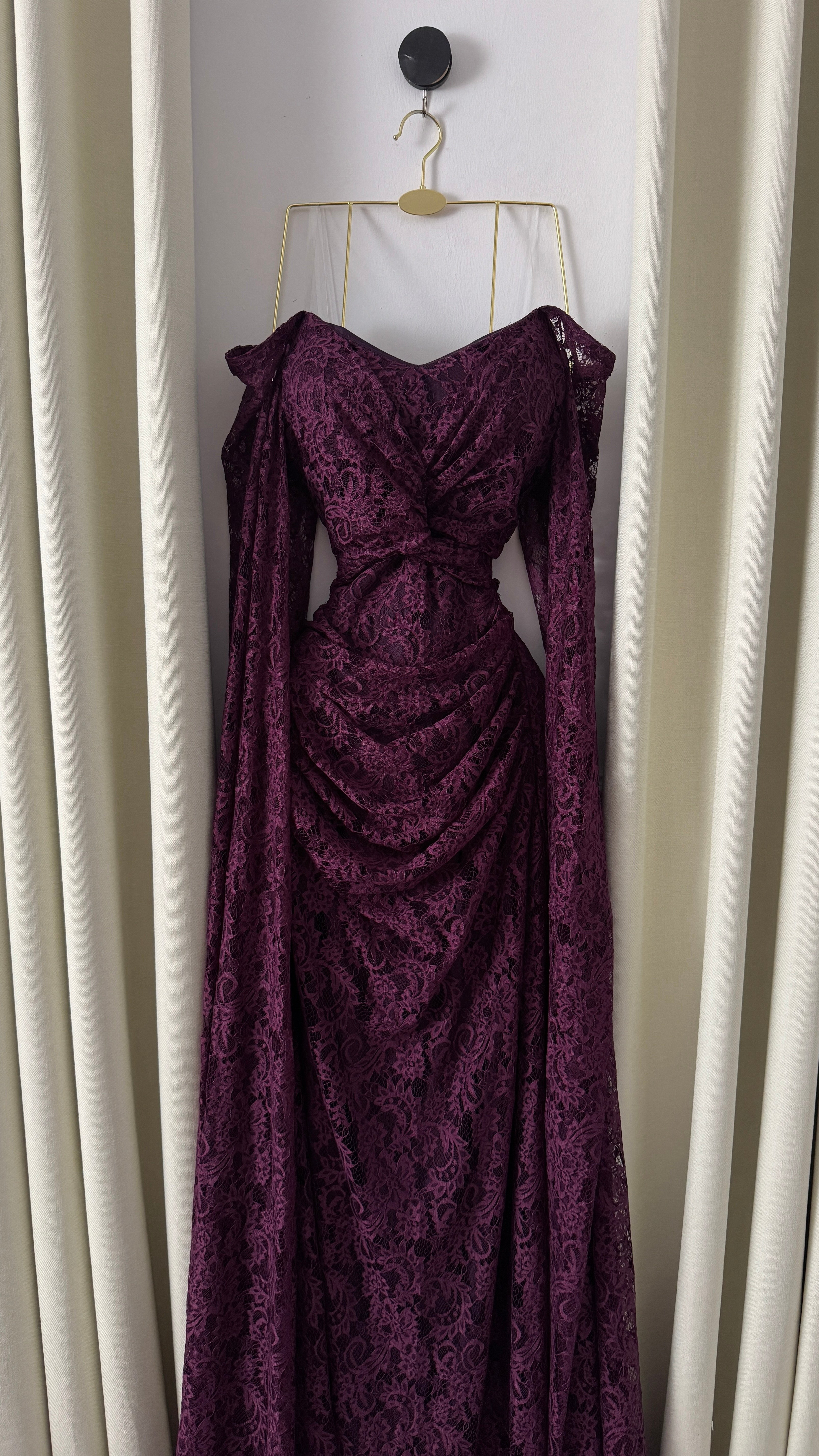 الأكمام المنسدلة على الأكتاف تمنح الفستان جاذبية رومانسية، في حين يضفي لون البنفسجي الداكن لمسة فاخرة مثالية للسهرات والمناسبات المميزة. تصميمه يجمع بين الكلاسيكية والحداثة، مما يجعله خيارًا لا يُقاوم للمرأة الباحثة عن التميز.