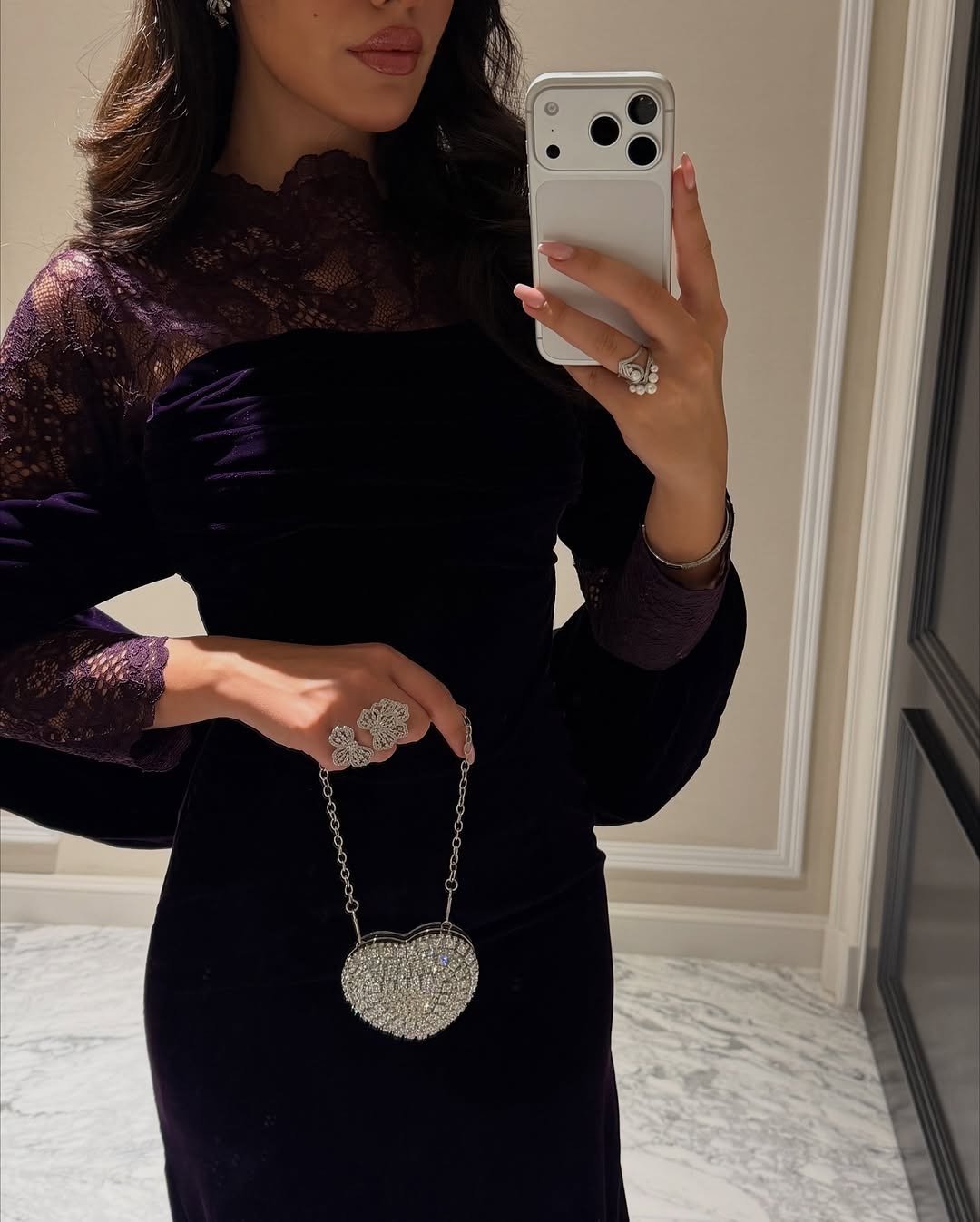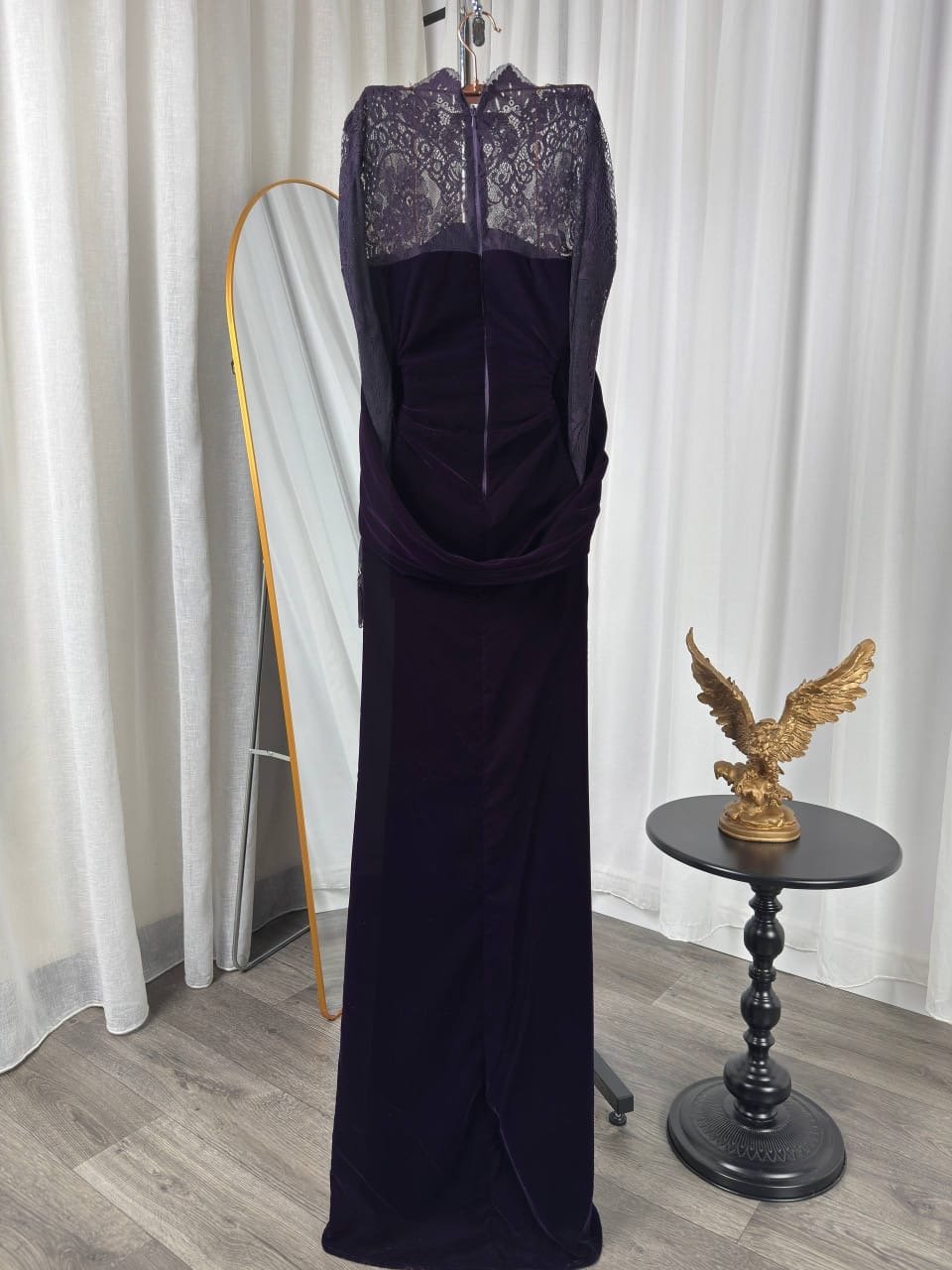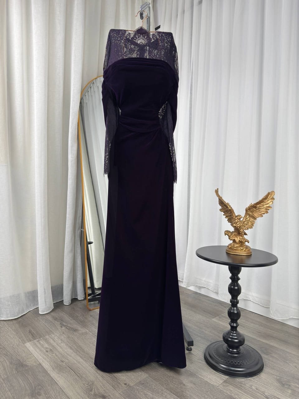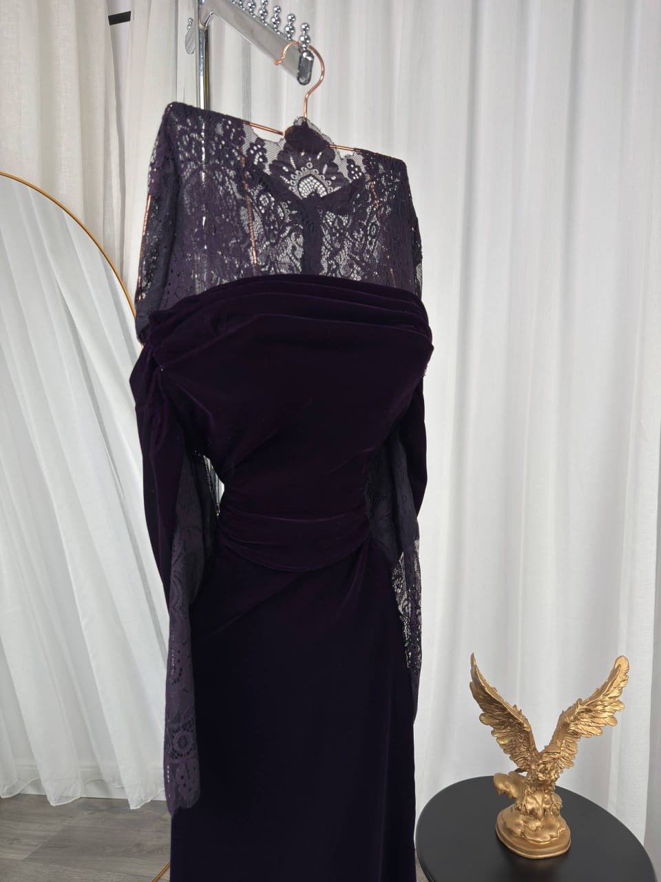فستان بنفسجي ساحر يجمع بين فخامة المخمل ورقة الدانتيل الفاخر.