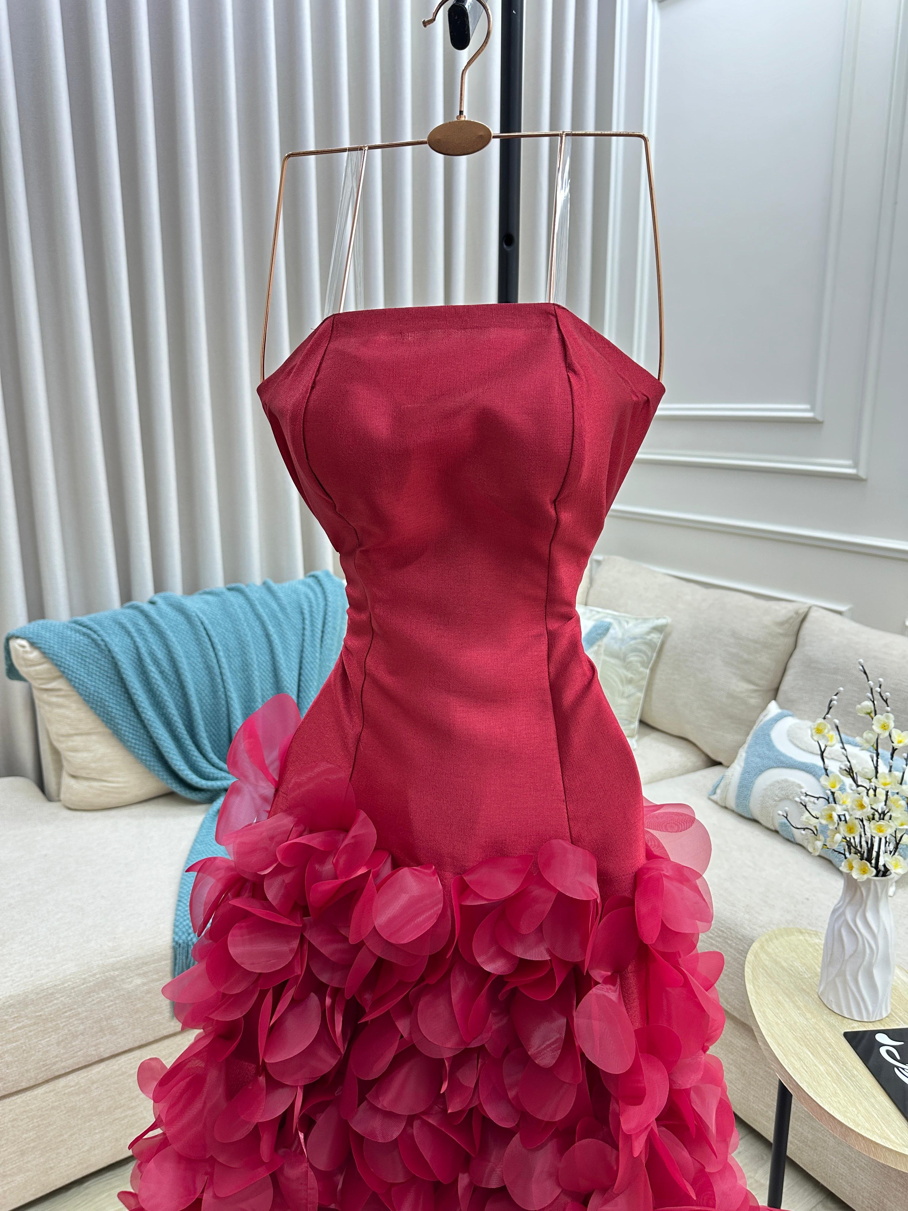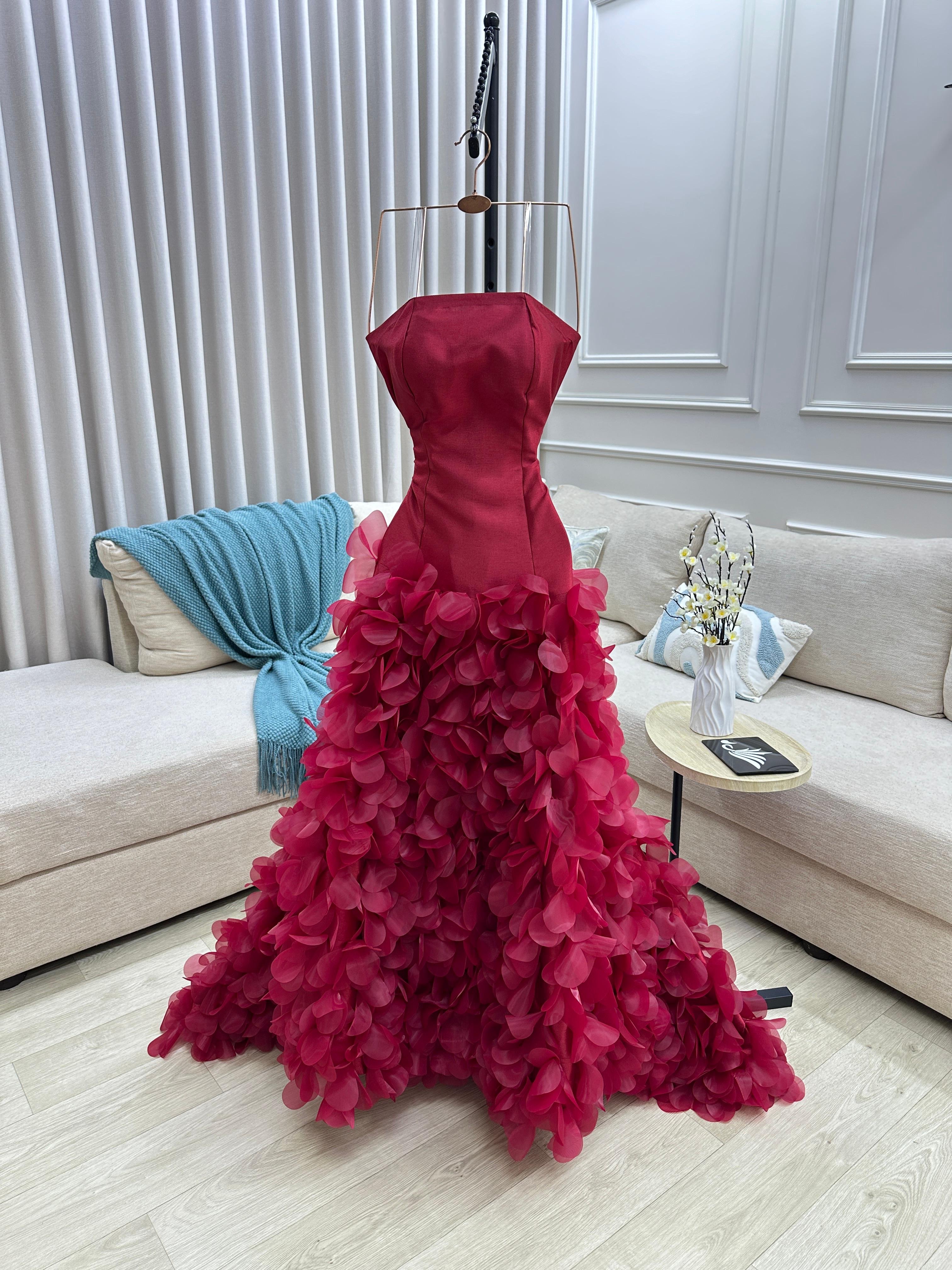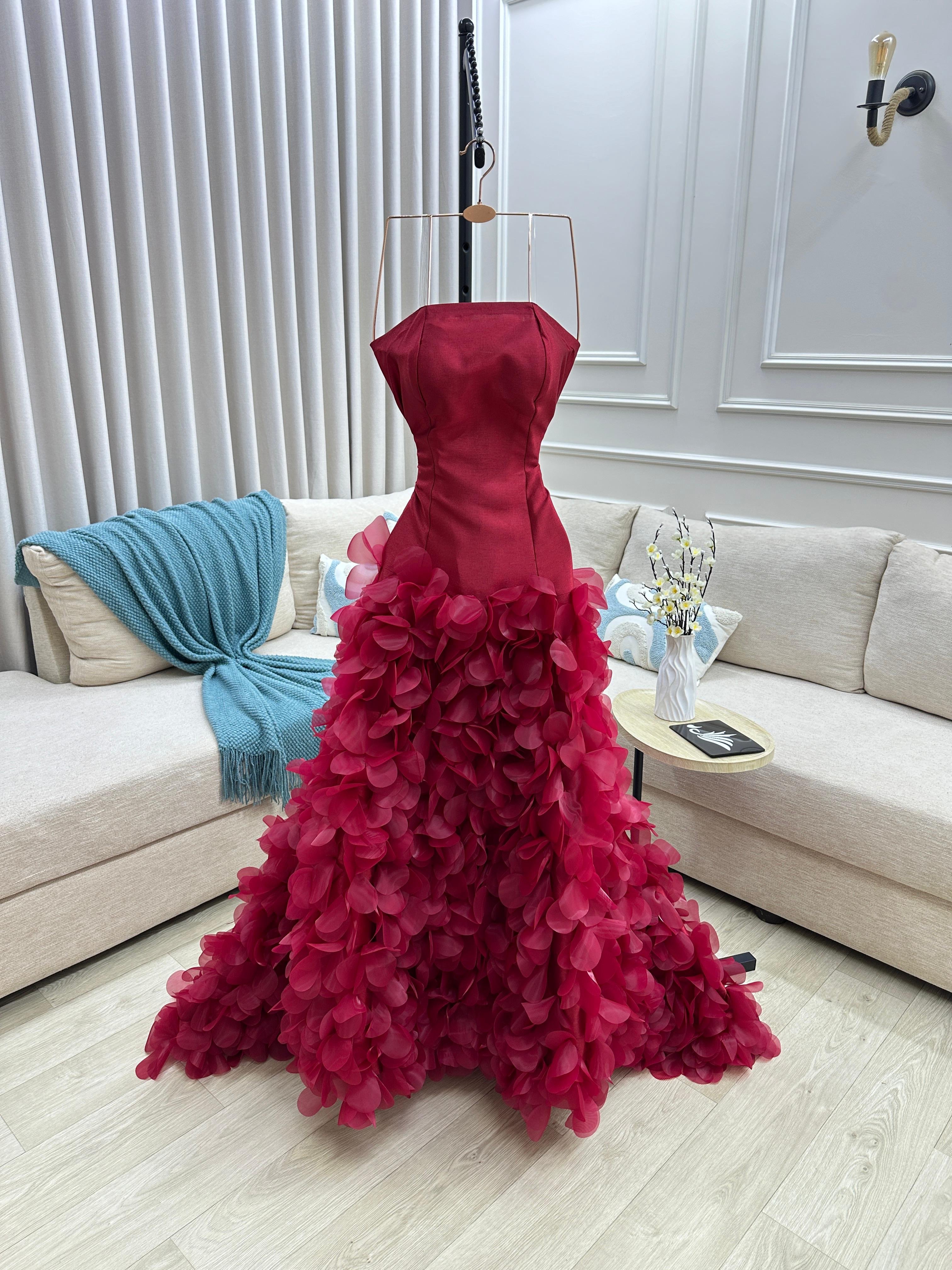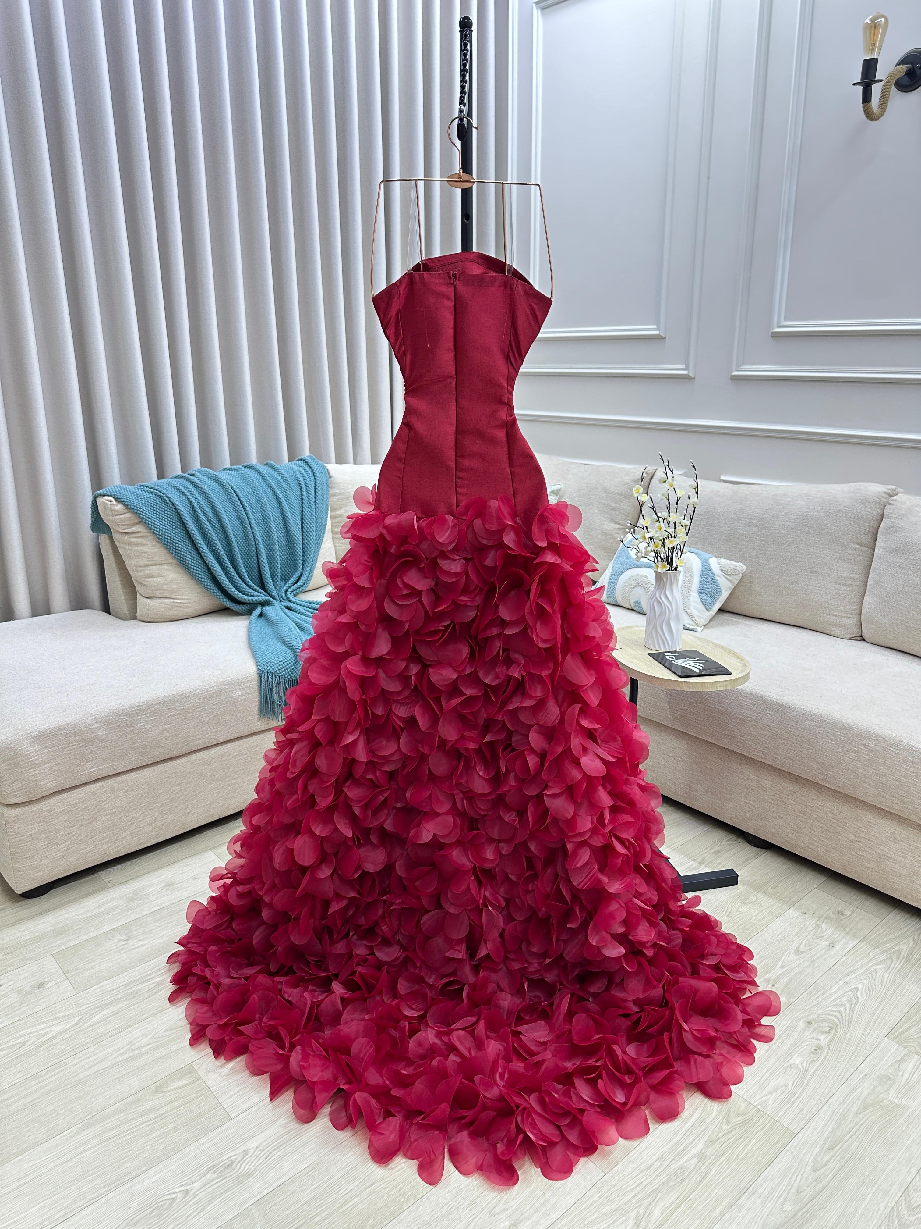 صدرية ضيقة بتصميم ناعم يبرز القوام بأسلوب راقٍ، تنسدل بعدها تنورة مترفة مزيّنة بطبقات ورود ثلاثية الأبعاد تضيف حجمًا وفخامة مذهلة مع كل خطوة.
