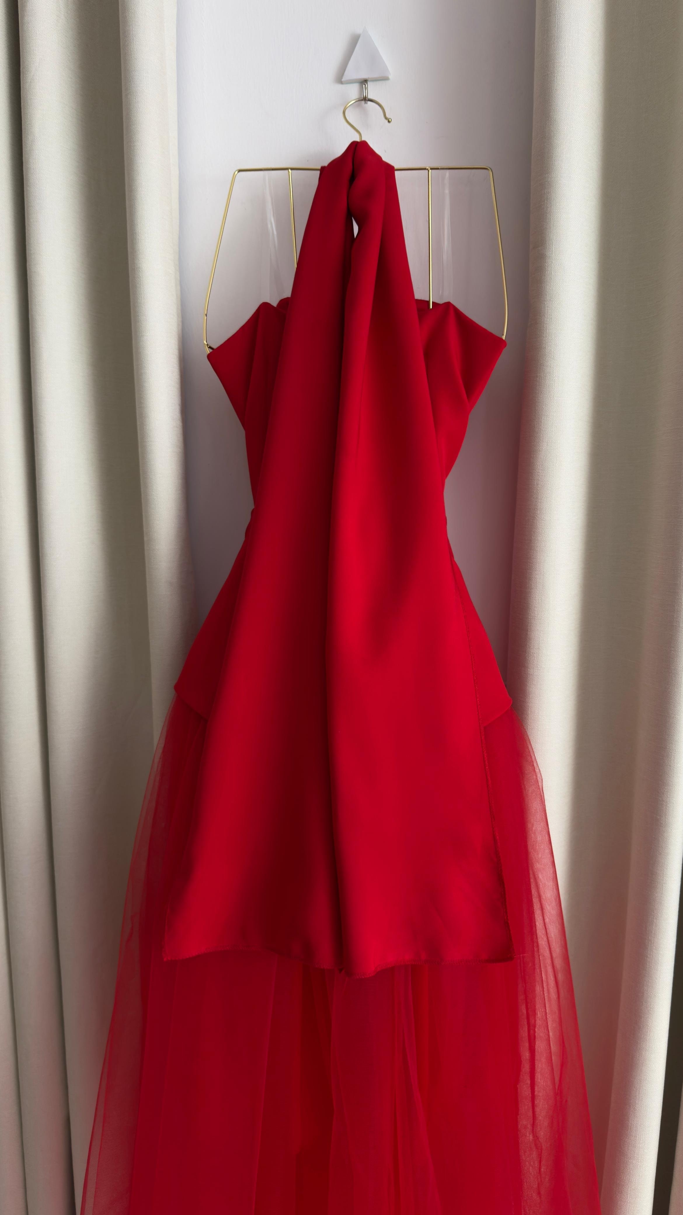 تنورة الفستان مصنوعة من طبقات التول الفاخر التي تنسدل بانسيابية ساحرة، لتمنحك حضورًا ملكيًا لافتًا يضج بالأنوثة والثقة. كما أن اللون الأحمر الجريء يضيف لمسة من القوة والإثارة، ليجعلك محور الأنظار في أي مناسبة.