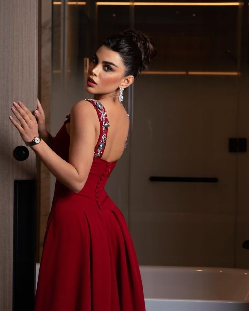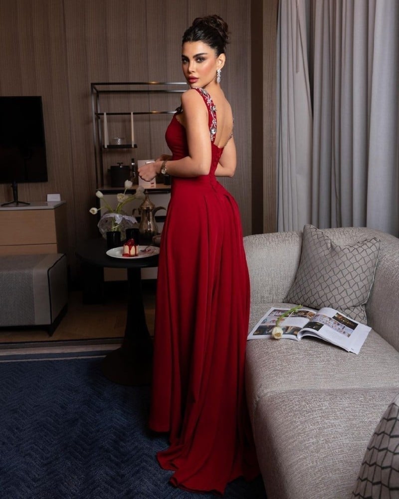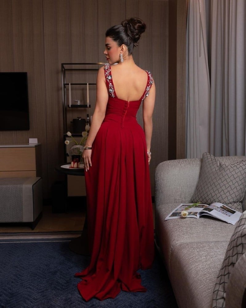 فستان سهرة أنثوي راقٍ باللون الأحمر الجذاب، يتميز بتصميم ضيق يبرز جمال القوام ويمنح حضورًا لافتًا. منطقة الصدر مزينة بتطريز كريستالي لامع يضفي لمسة فخامة ورقي، مع قصة بدون أكمام وأكتاف عريضة تزيد من الأناقة. القماش الانسيابي يمنح راحة وأناقة في آن واحد، ليكون الخيار المثالي للسهرات، الحفلات، والمناسبات الفاخرة.
