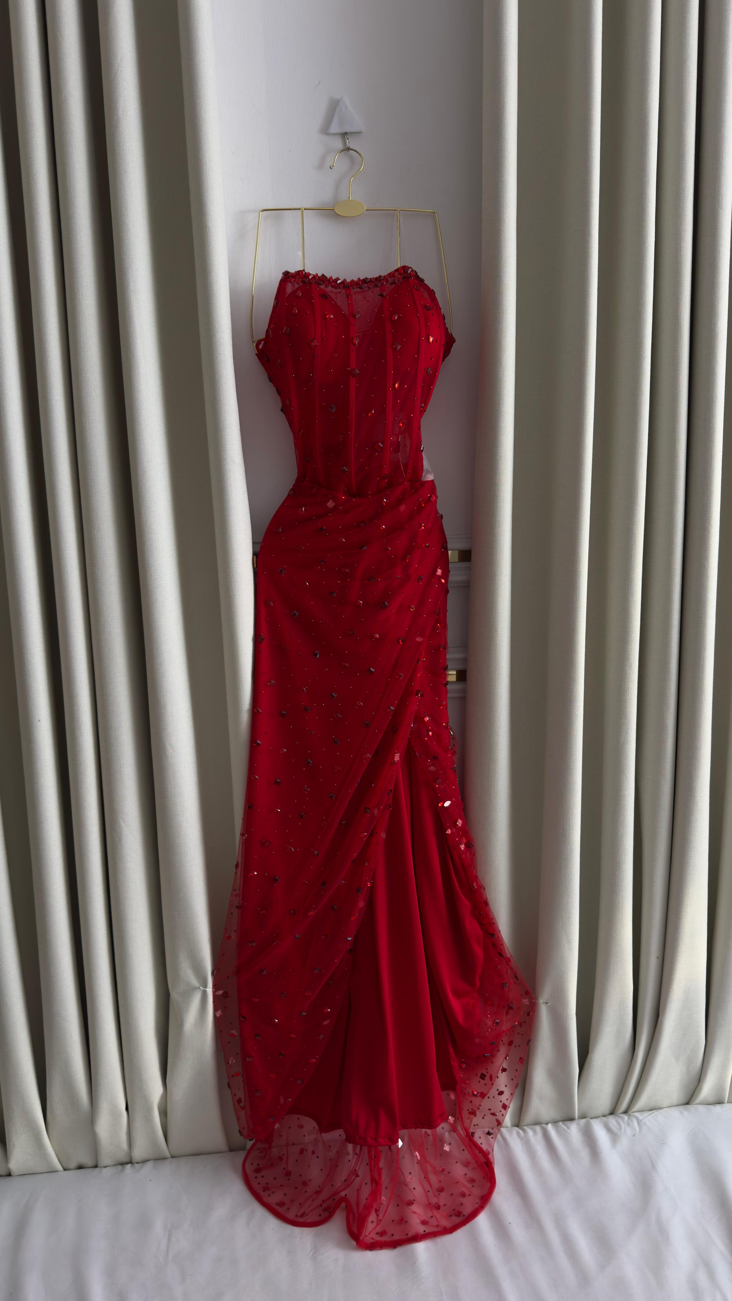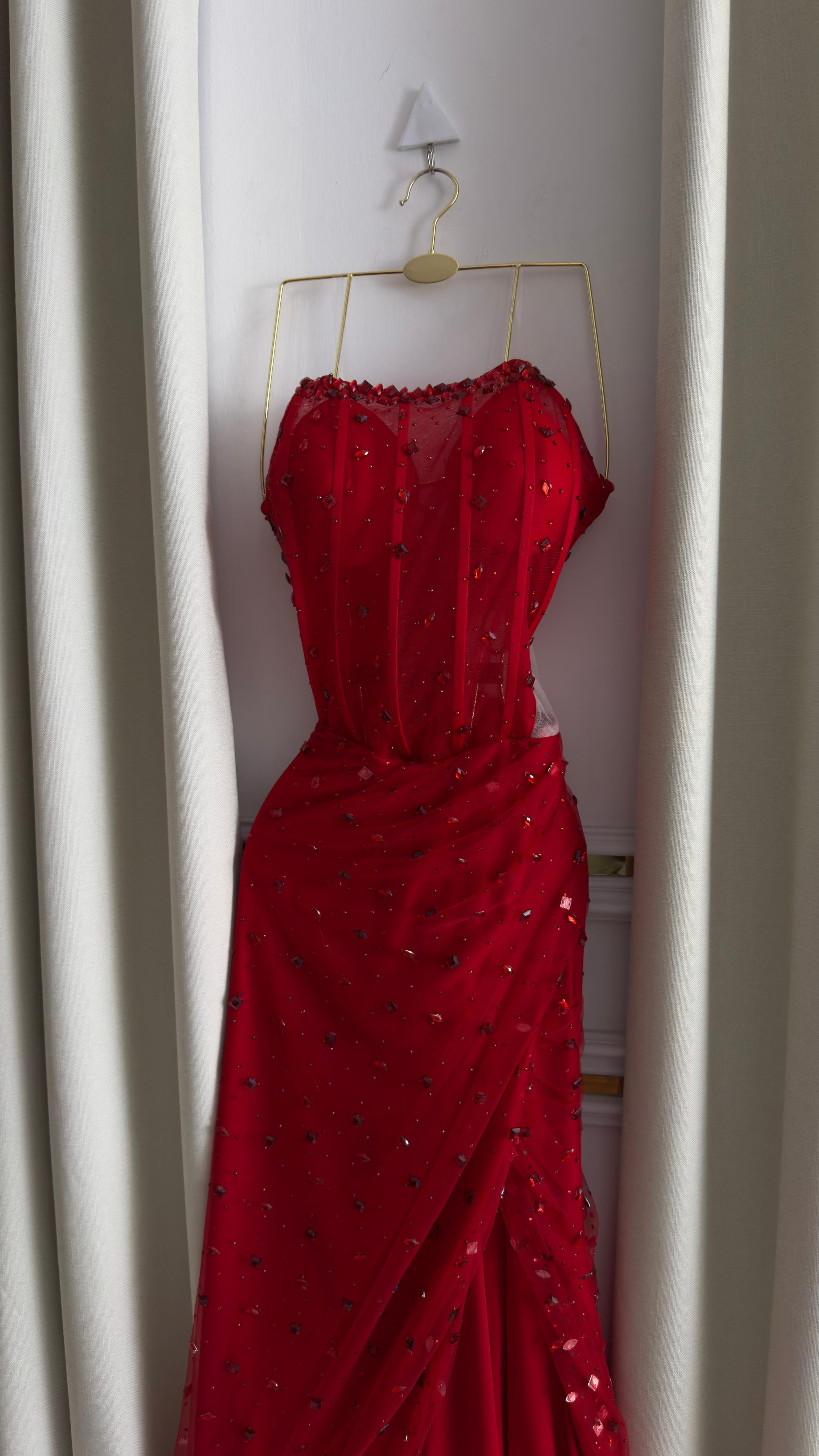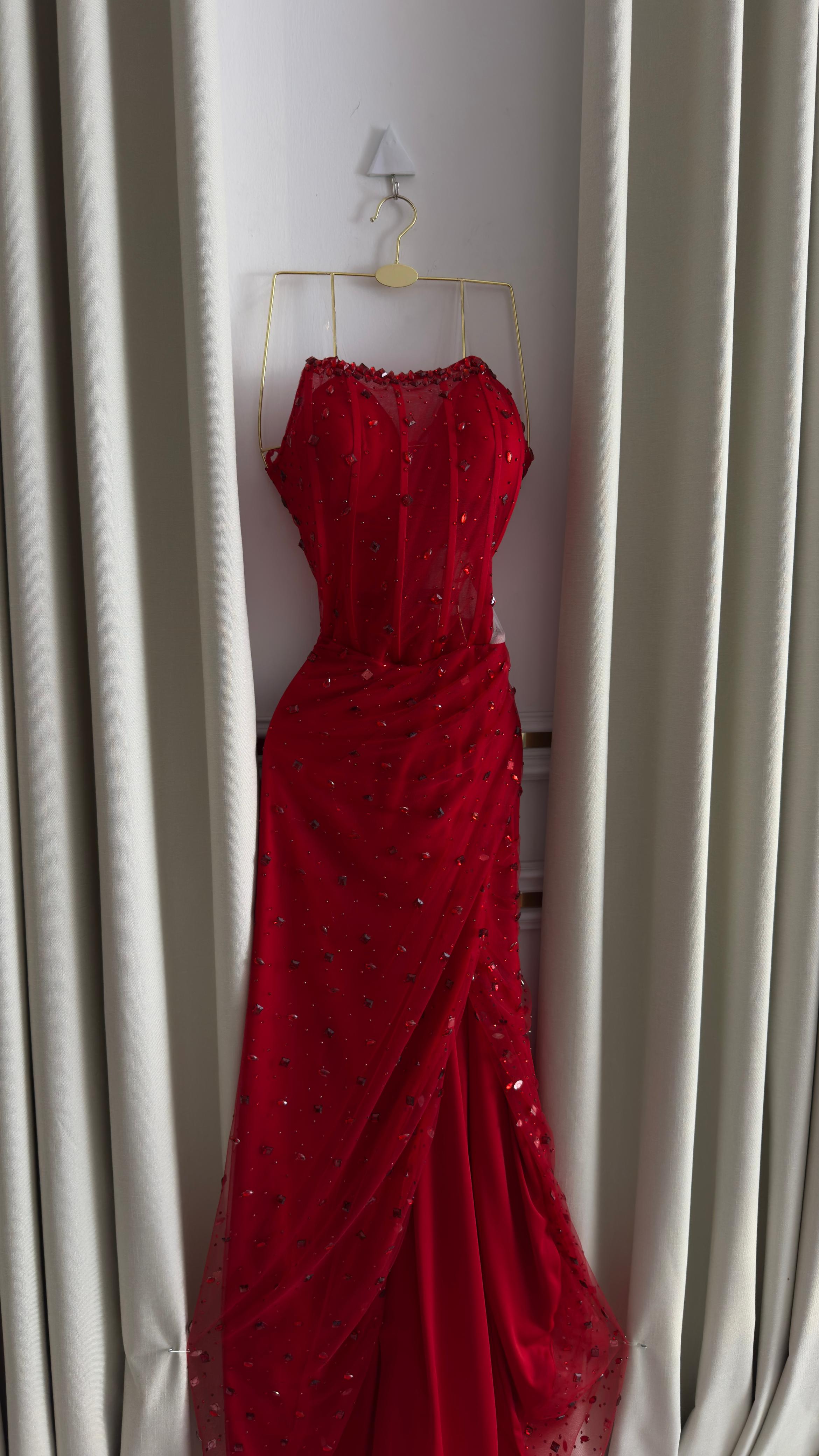 فستان سهرة أحمر طويل، مرصع بالكريستالات البراقة التي تضيف له لمسة فاخرة من الأناقة. يتميز بفتحة جانبية جريئة تزيد من أنوثتك وجاذبيتك، مع قصة ضيقة تبرز جمال القوام وتمنحك حضورًا لافتًا في أي مناسبة.