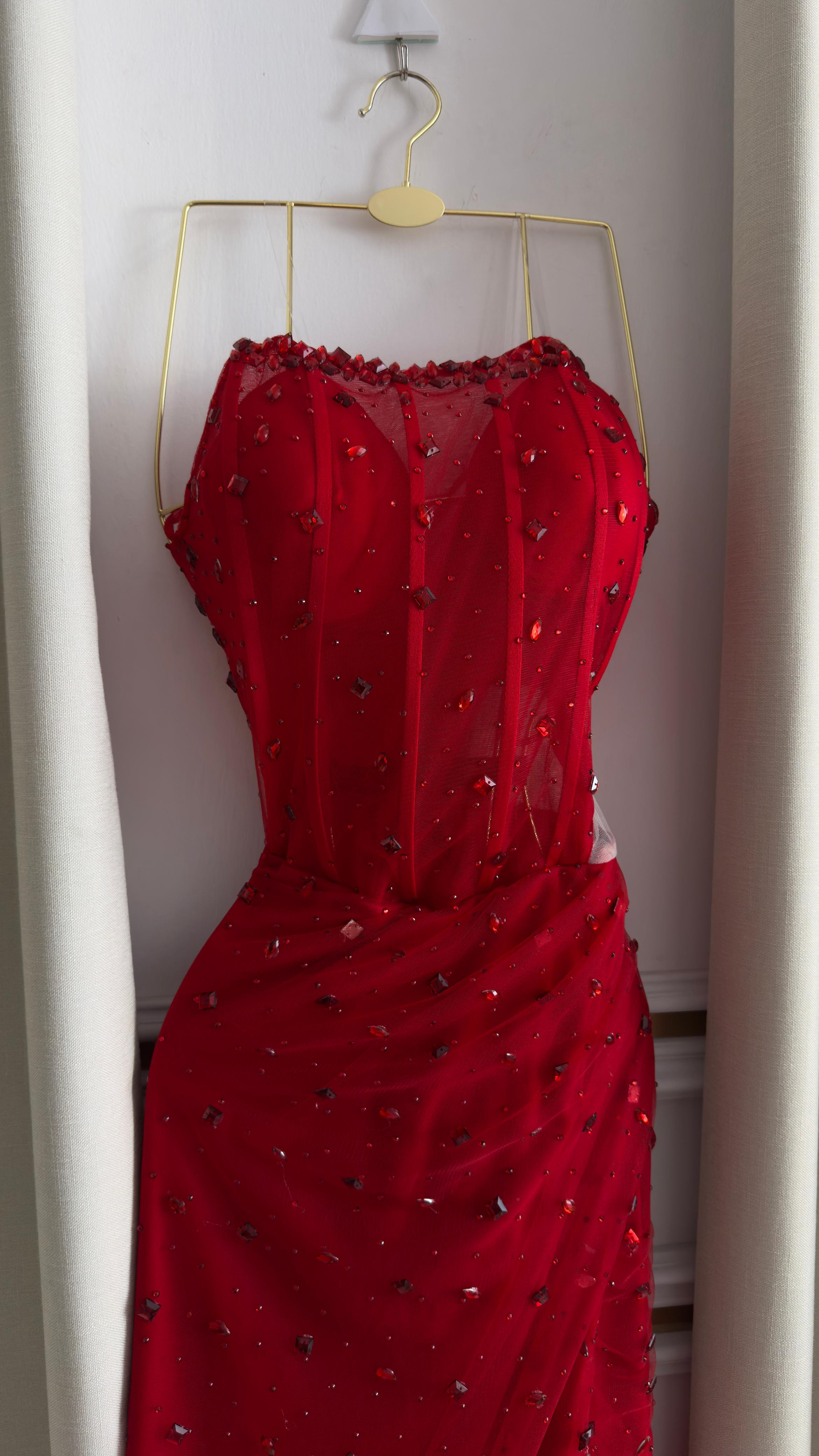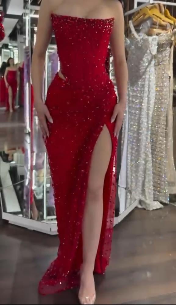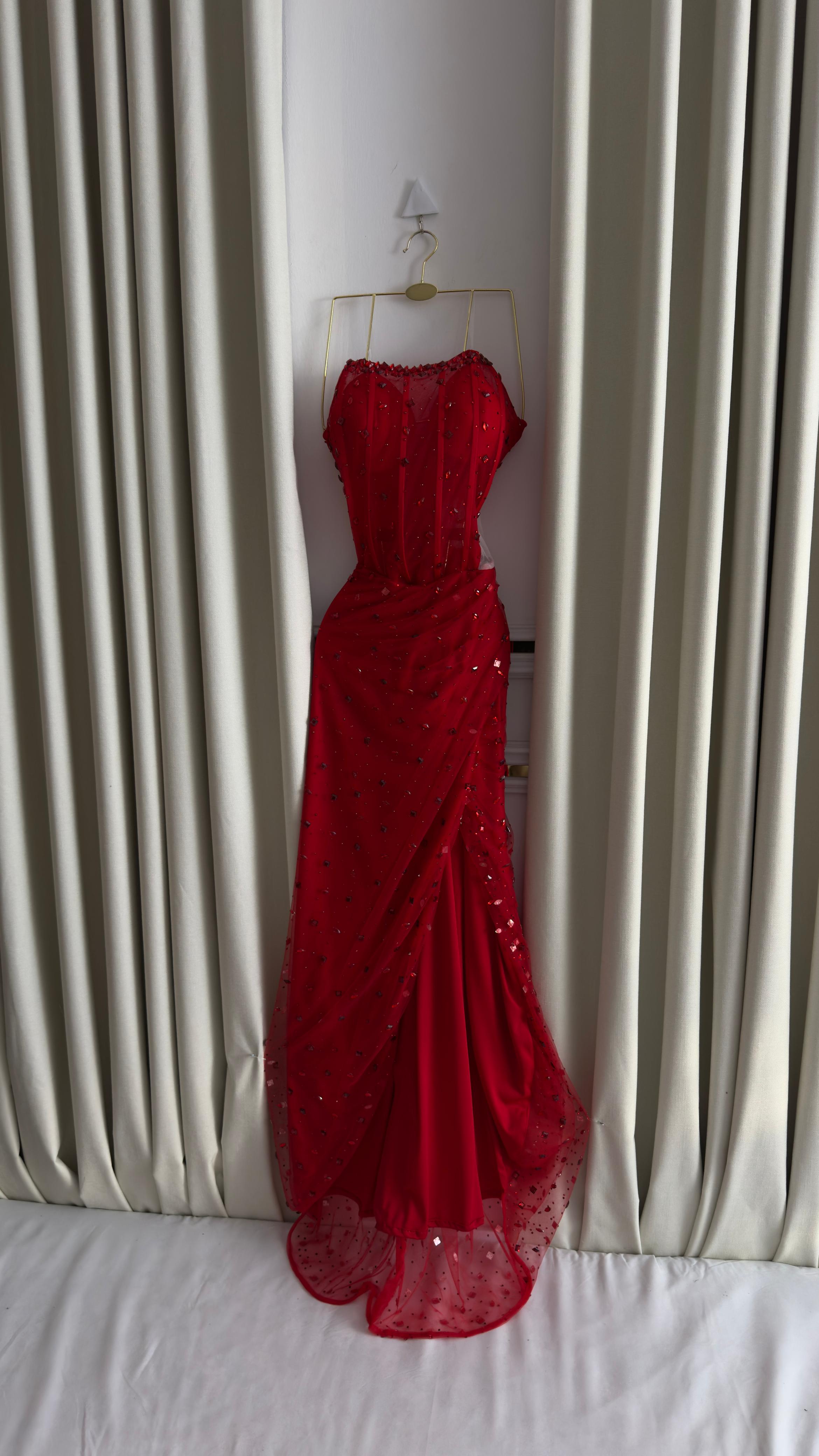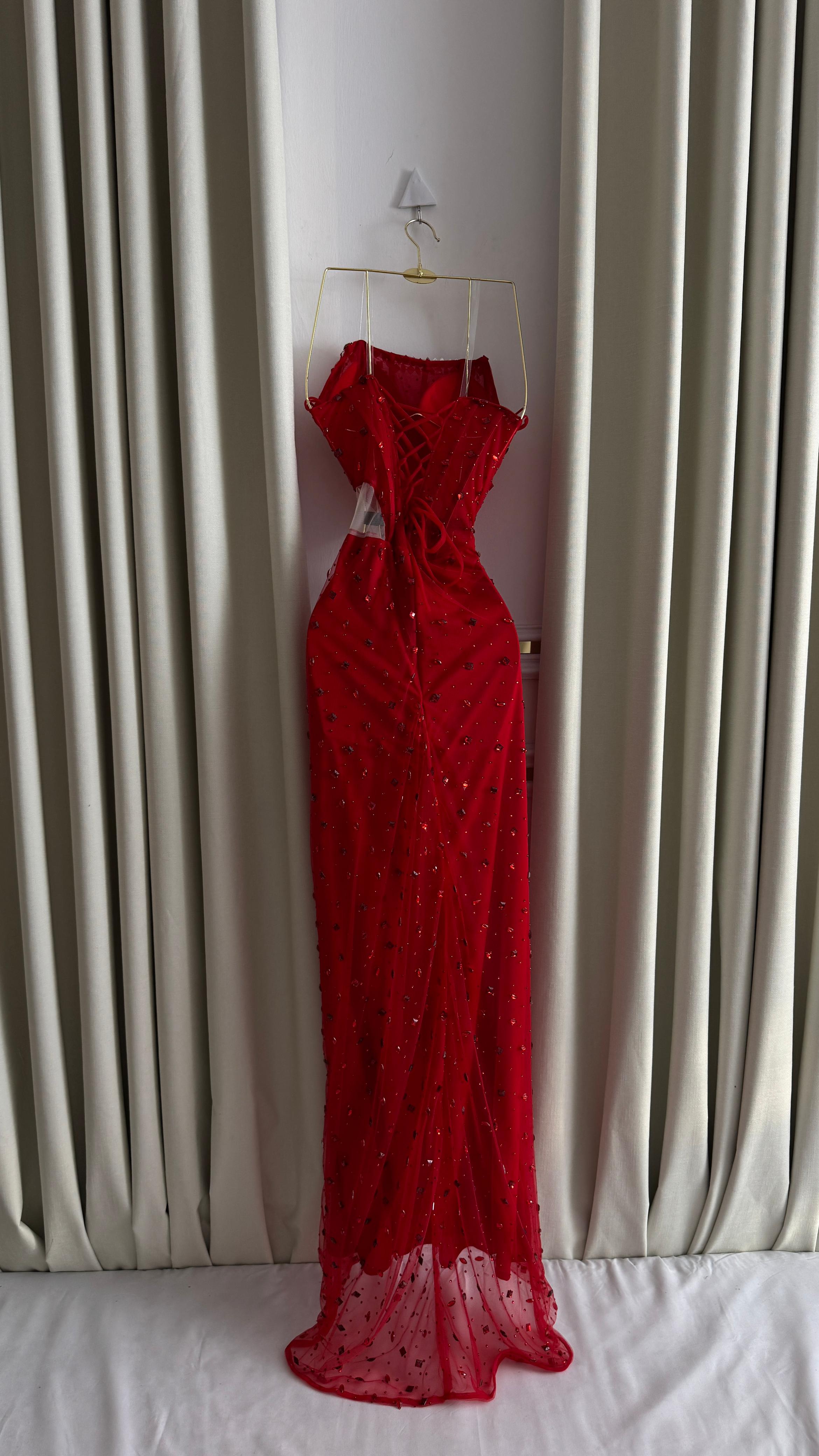فستان سهرة أحمر طويل، مرصع بالكريستالات البراقة التي تضيف له لمسة فاخرة من الأناقة. يتميز بفتحة جانبية جريئة تزيد من أنوثتك وجاذبيتك، مع قصة ضيقة تبرز جمال القوام وتمنحك حضورًا لافتًا في أي مناسبة.