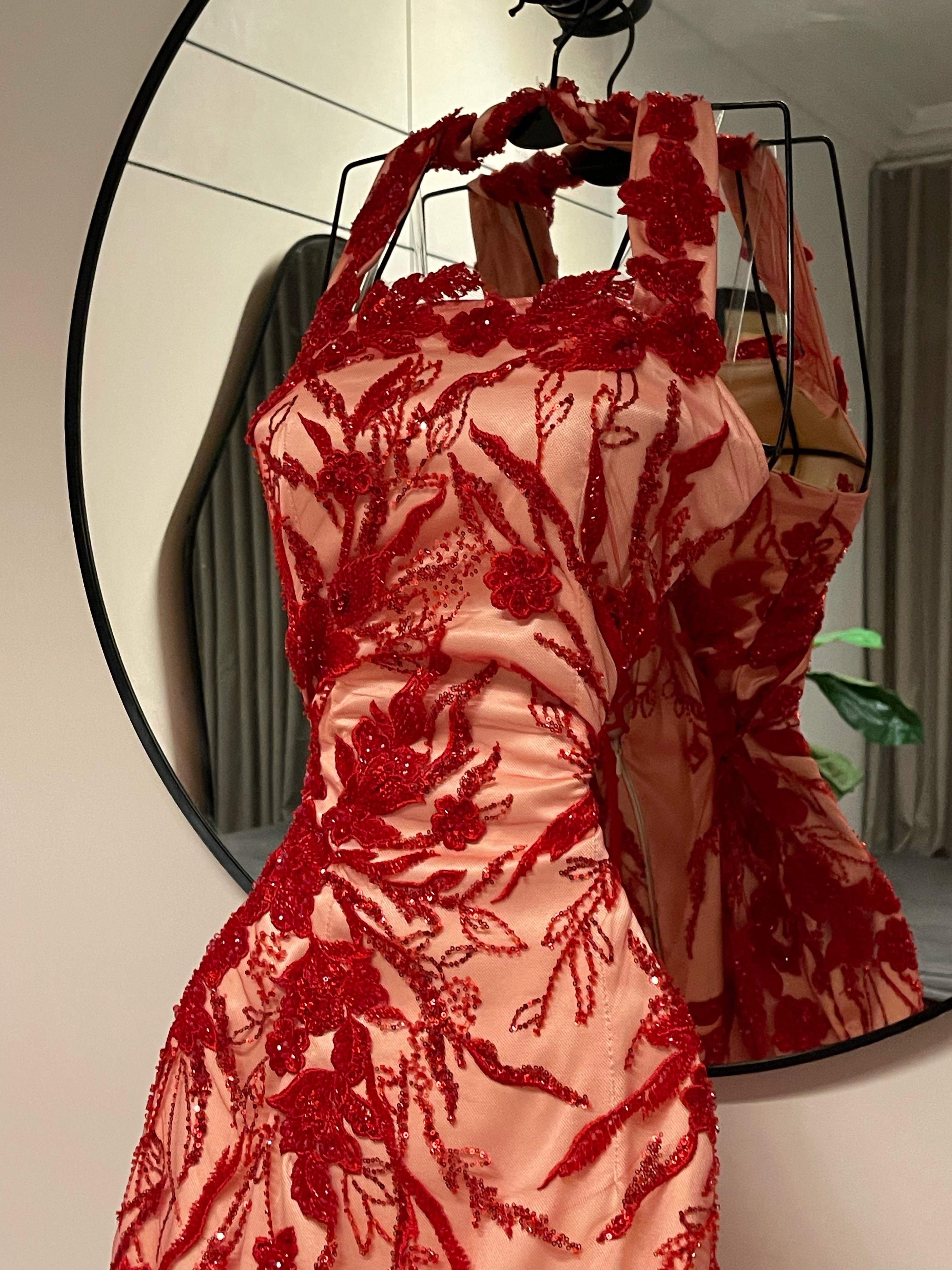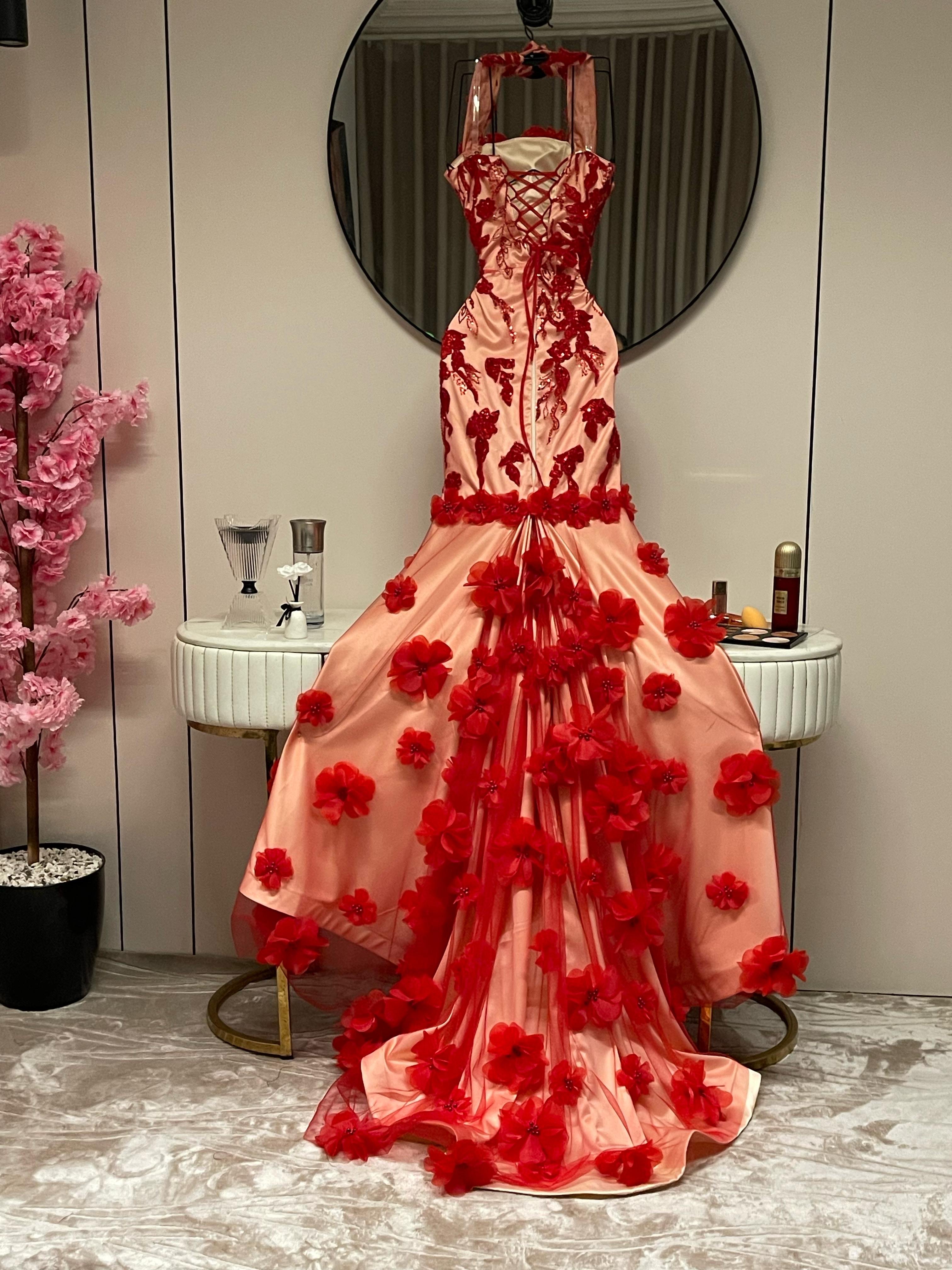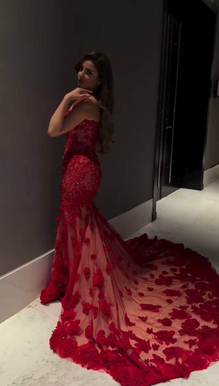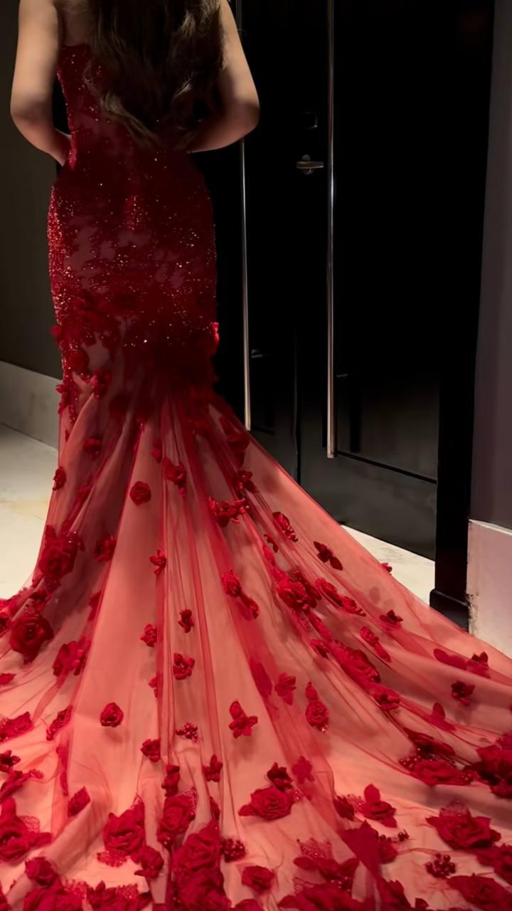 فستان سهرة أحمر مطرز بتفاصيل ثلاثية الأبعاد وزهور بارزة مع ذيل طويل ملكي يمنحك حضورًا لا يُنسى في المناسبات الفاخرة.