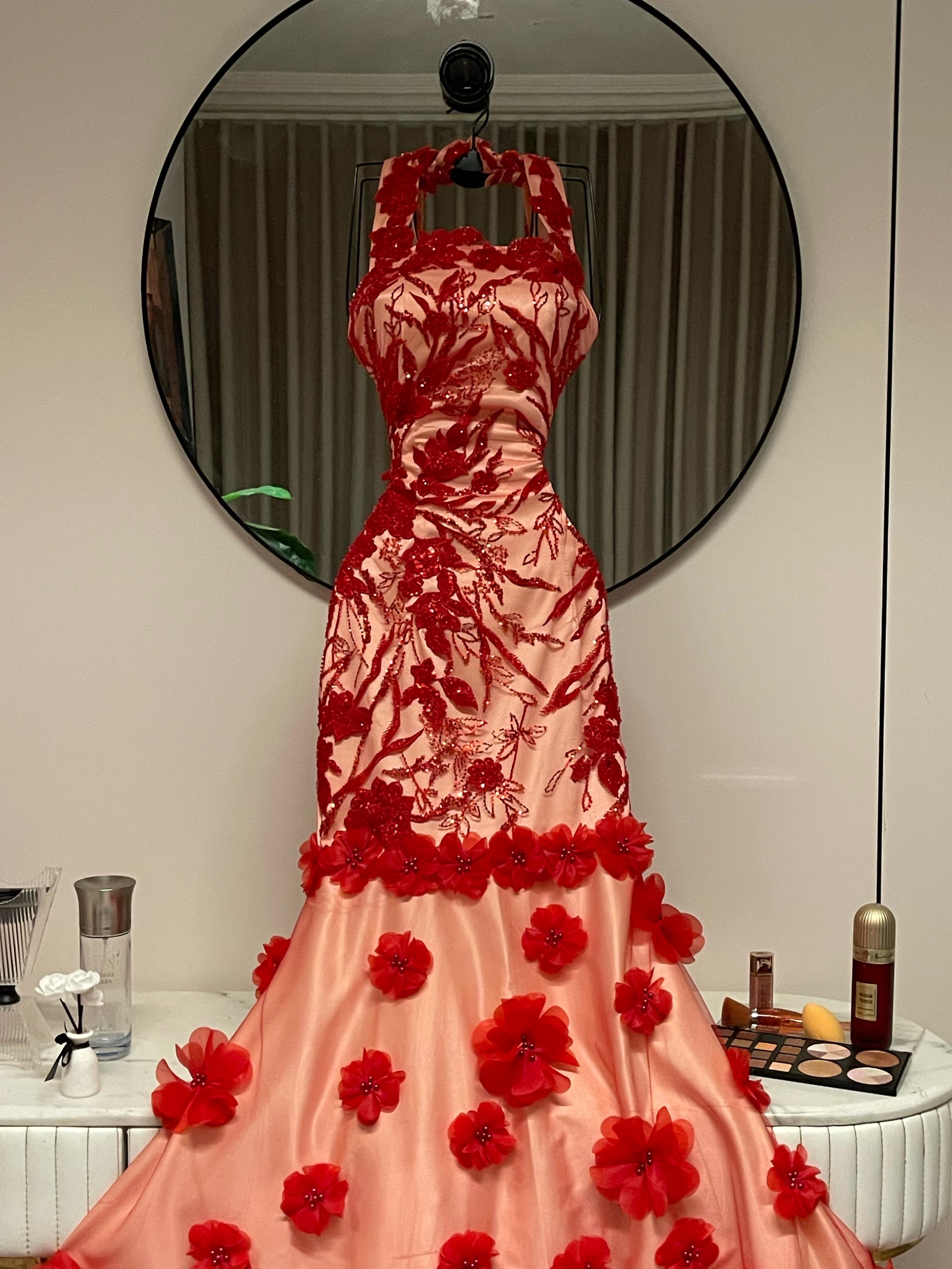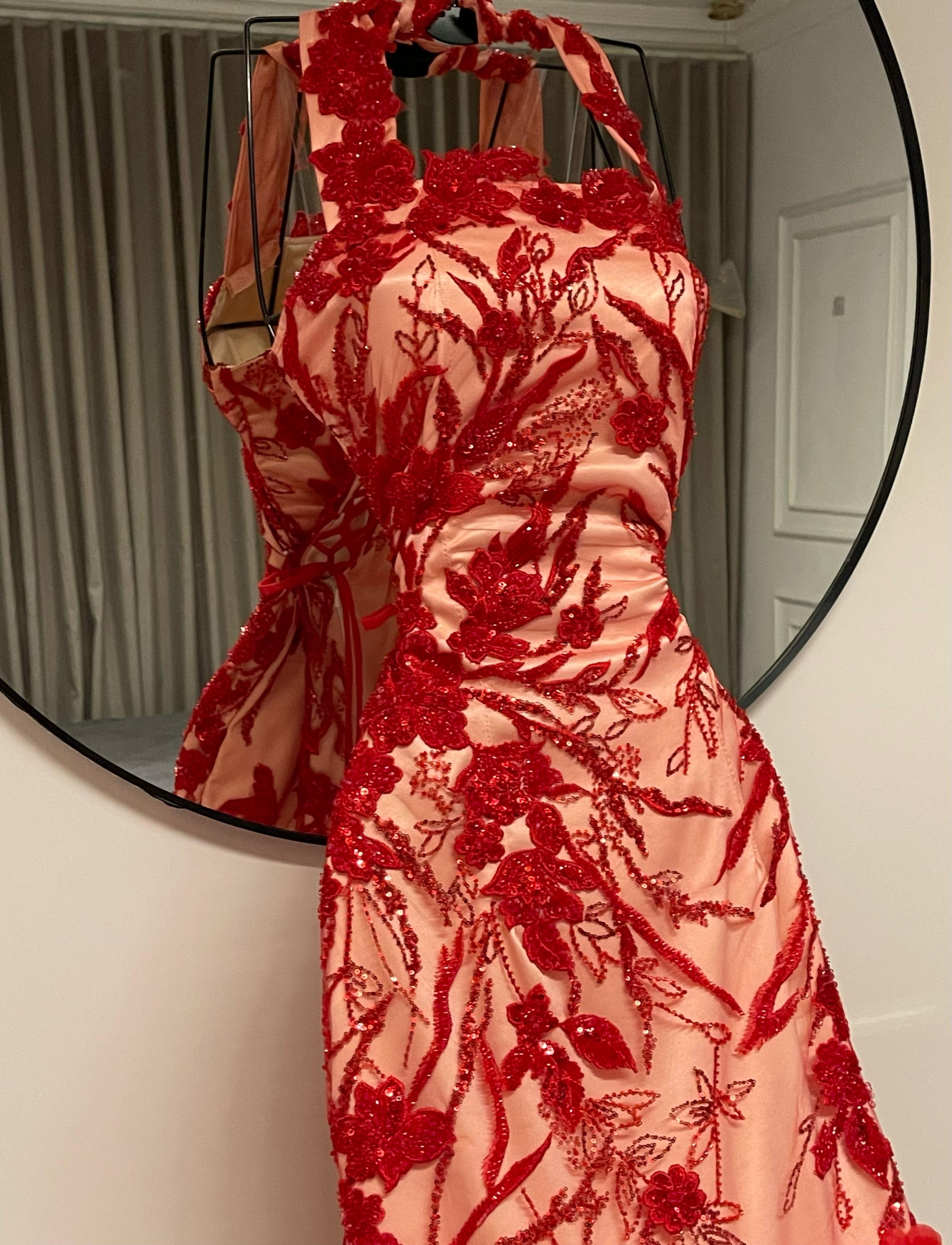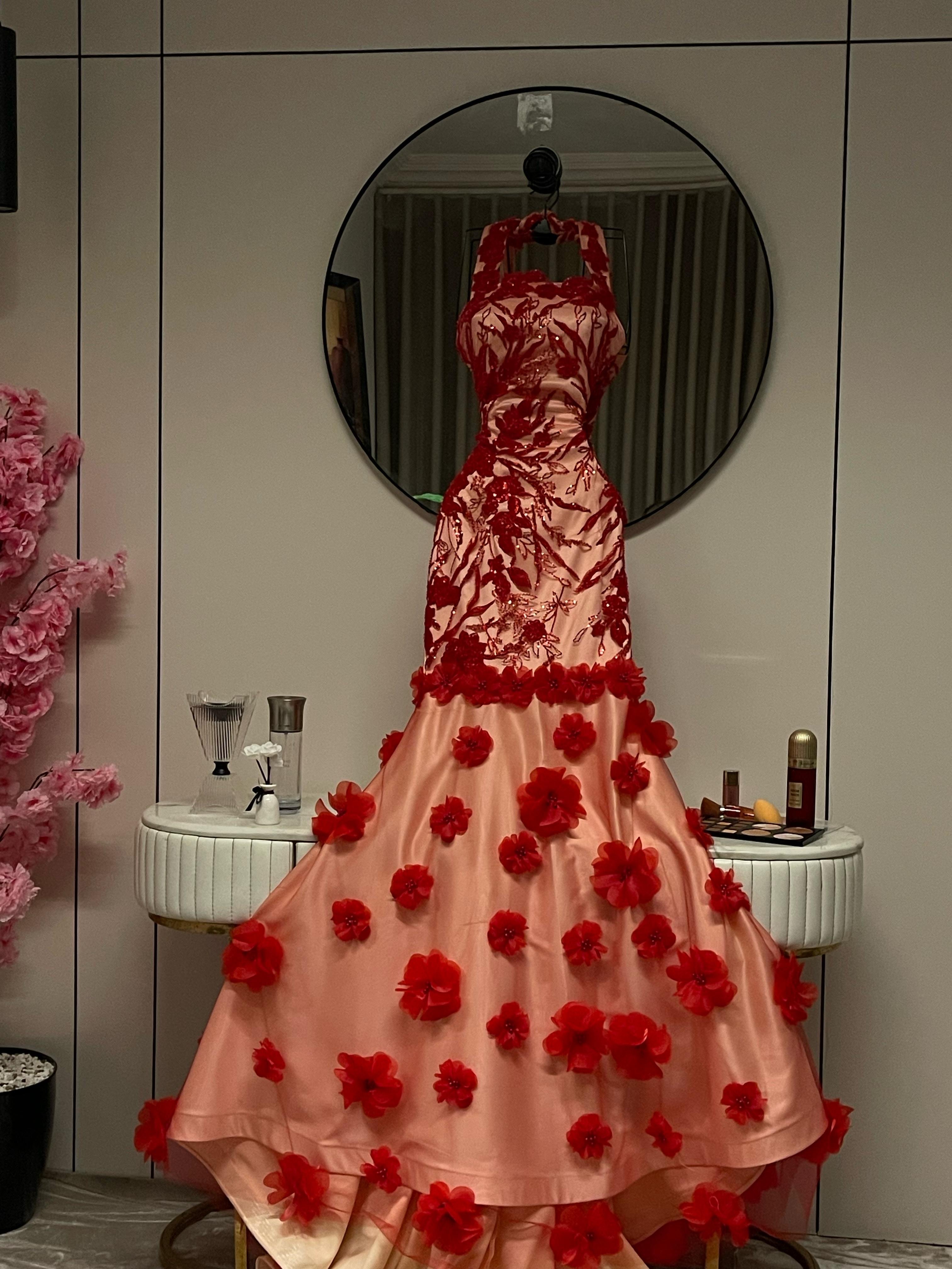 فستان سهرة أحمر مطرز بتفاصيل ثلاثية الأبعاد وزهور بارزة مع ذيل طويل ملكي يمنحك حضورًا لا يُنسى في المناسبات الفاخرة.