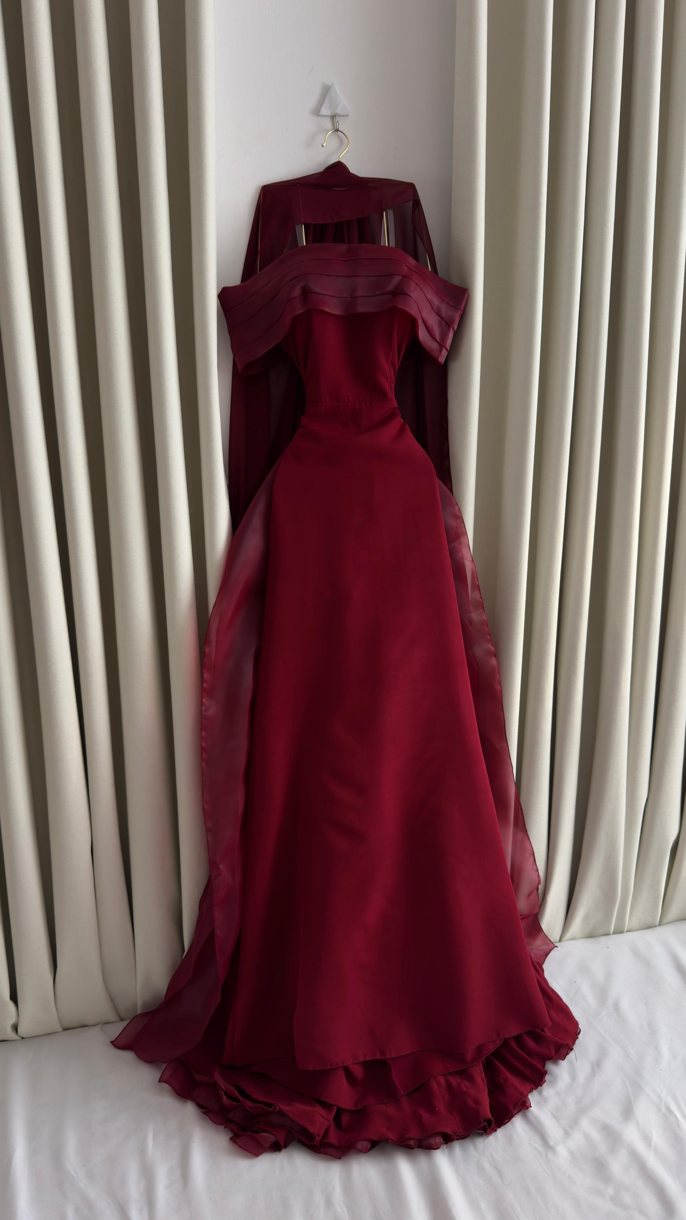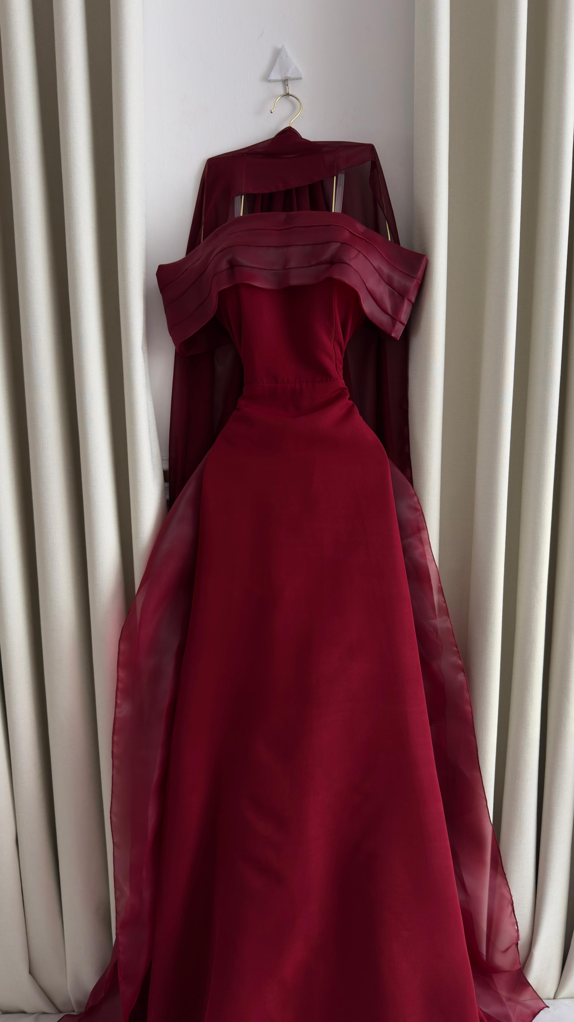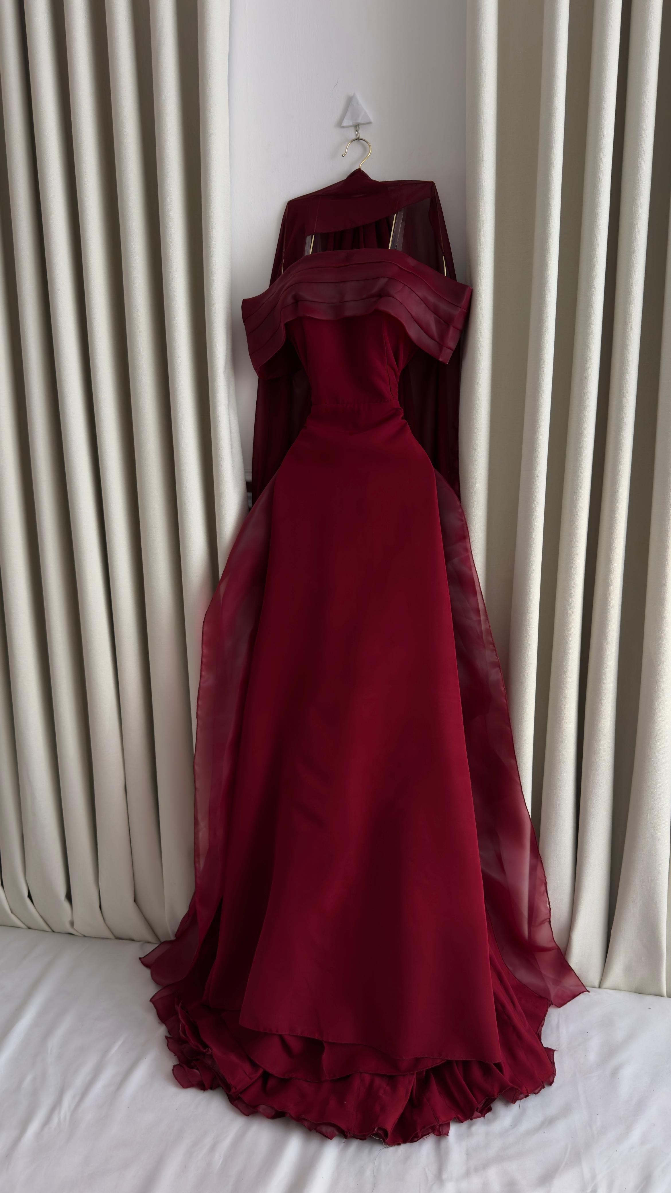 فستان سهرة ملكي باللون الأحمر الفاخر، مصمم بقصة أوف شولدر عريضة مع خطوط مطوية أنيقة وكاب انسيابي طويل يضفي لمسة درامية ساحرة. القماش الفاخر يمنح إطلالة قوية وأنثوية في آن واحد، لتكوني محط الأنظار في السهرات الفاخرة والمناسبات الخاصة.